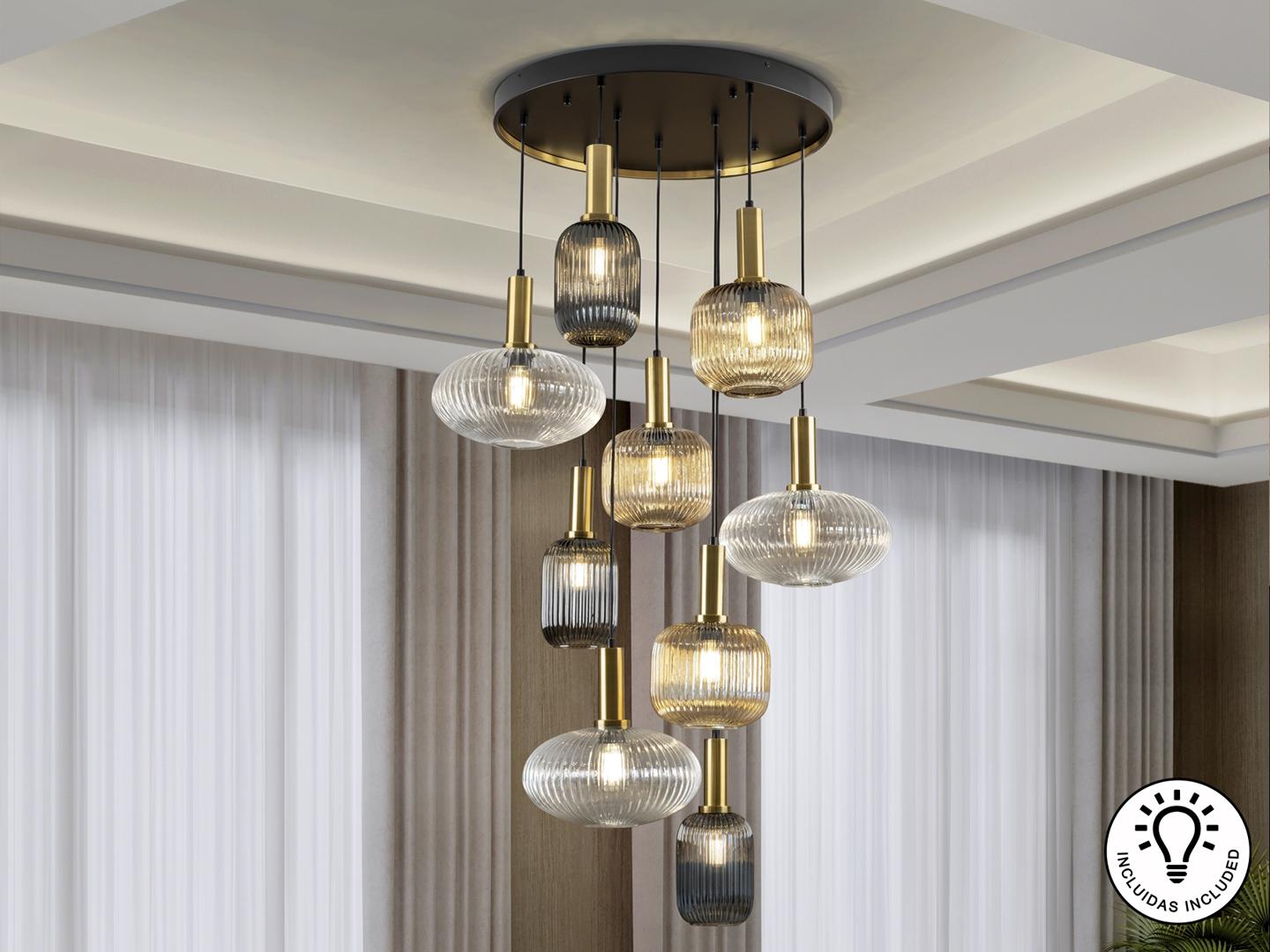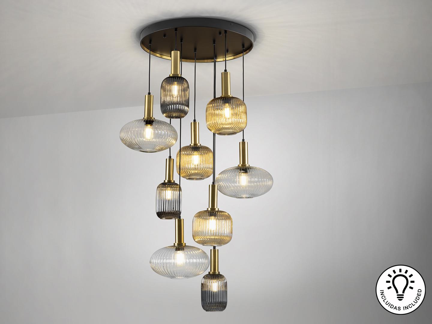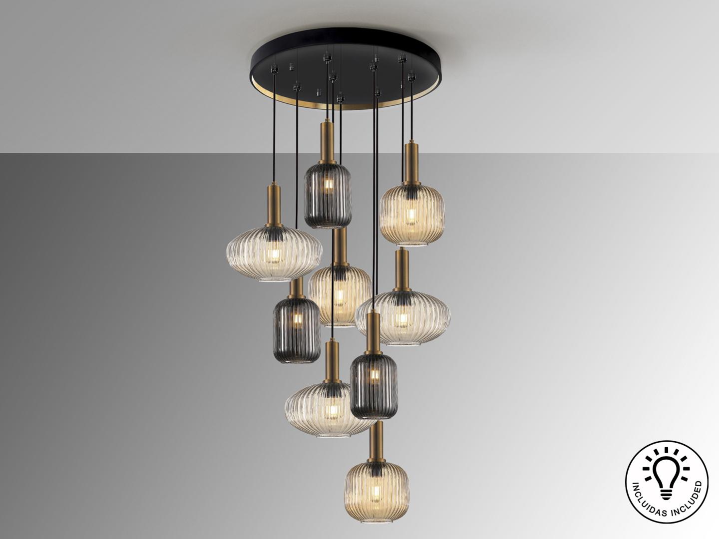 Люстра из 9 лампочек из металла, окрашенного в черный матовый цвет, с деталями из сатинированной латуни. Абажуры из формованного стекла прозрачного, янтарного и мерцающего дымчато-серого цвета. Регулируется по длине.