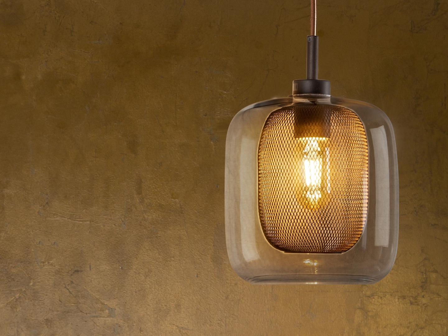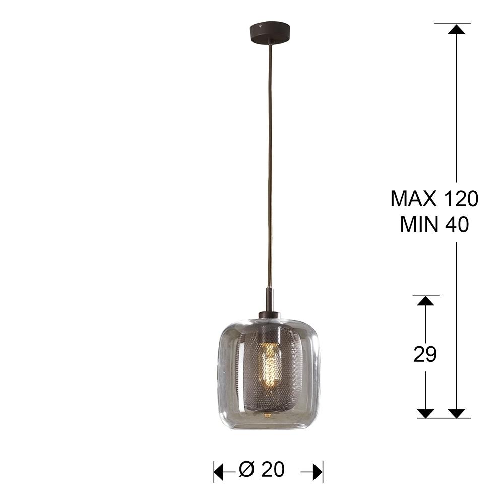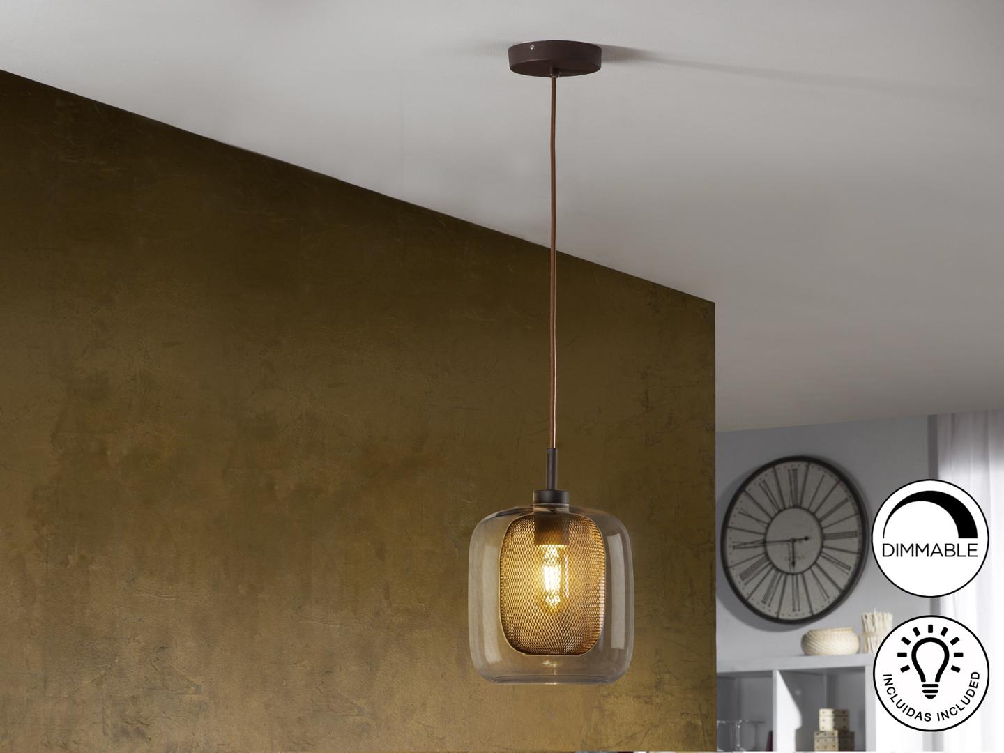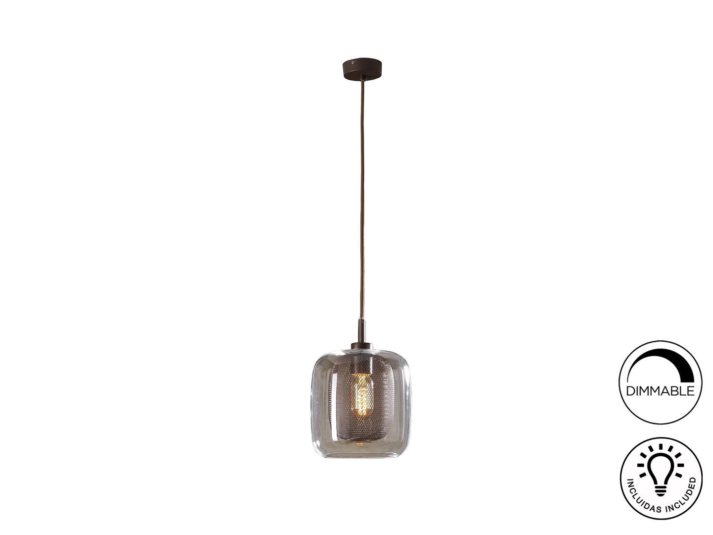 Подвесной светильник из металла, покрытого лаком шоколадного цвета. Двойной плафон: внешний из стекла и внутренний из металлической сетки, Включает 1 светодиод E27 мощностью 8 Вт. Диммируемый.