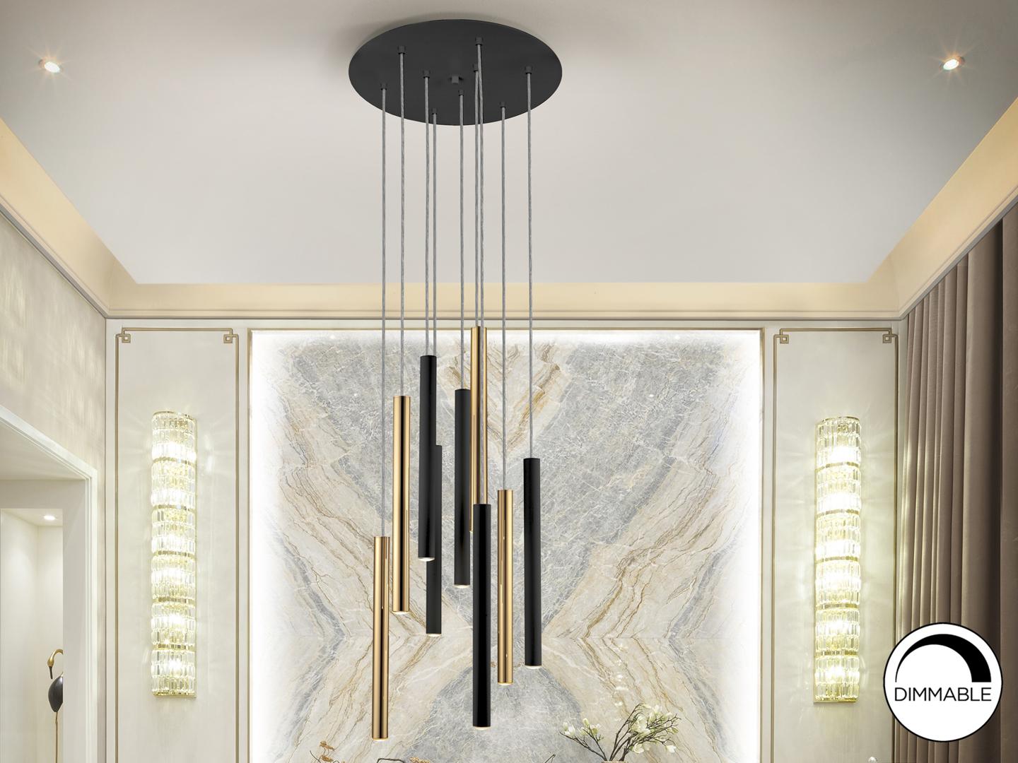 Подвесной светильник круглый LED с 9 лампами из металла с покрытием "блестящее золото" и матовым чёрным покрытием. Акриловый рассеиватель опaлового цвета. 45W LED, 4050 Lm, 3000 K. ДИММИРУЕМЫЙ.