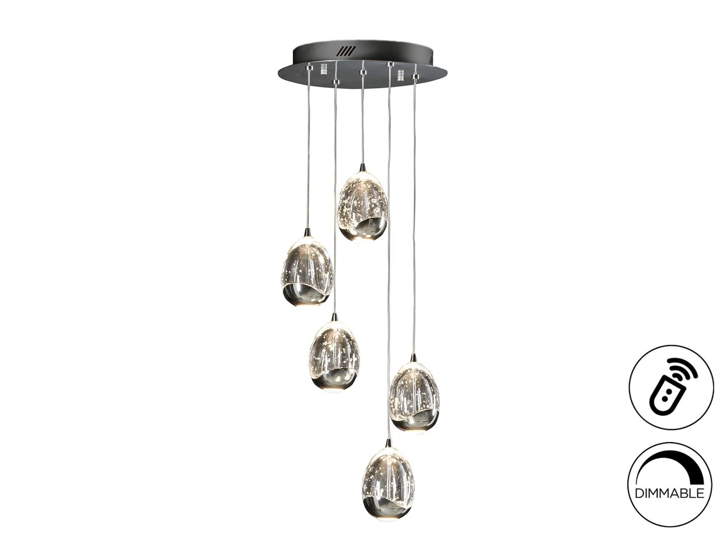 Подвесной светильник LED из металла с 5 лампами, покрытие "хром". Плафоны в форме капли из массивного стекла с декоративными пузырьками внутри, с регулируемой высотой, 25W LED, 2400 Lm, 3000 K, диммируемый. Этот продукт включает драйверы светодиодов с диммером 0-10 В или ШИМ, приемник и радиочастотный пульт дистанционного управления. Для использования с настенным регулятором используйте только диммеры этих двух типов регулирования. Диммер другого типа может повредить драйвер светодиода.