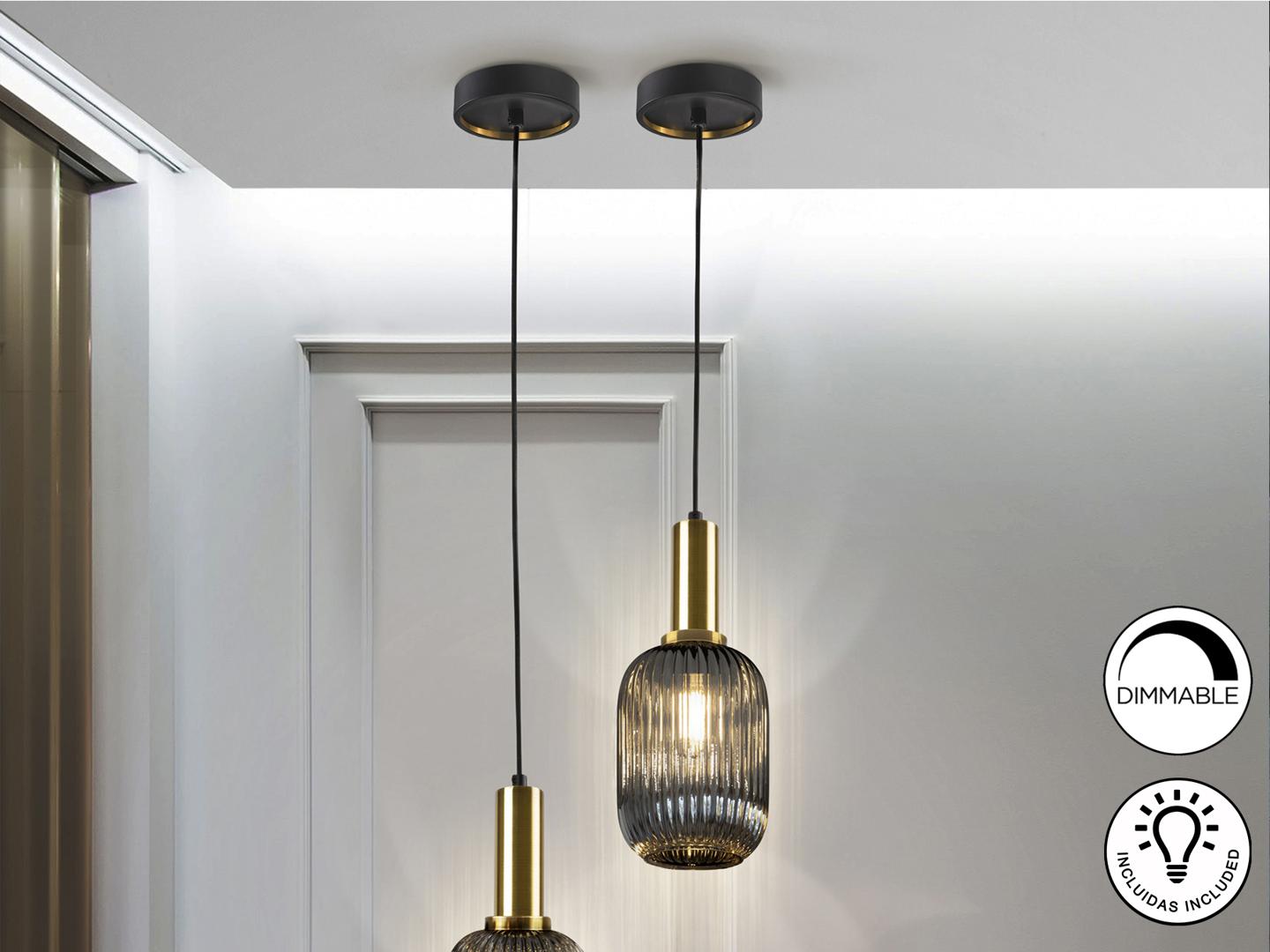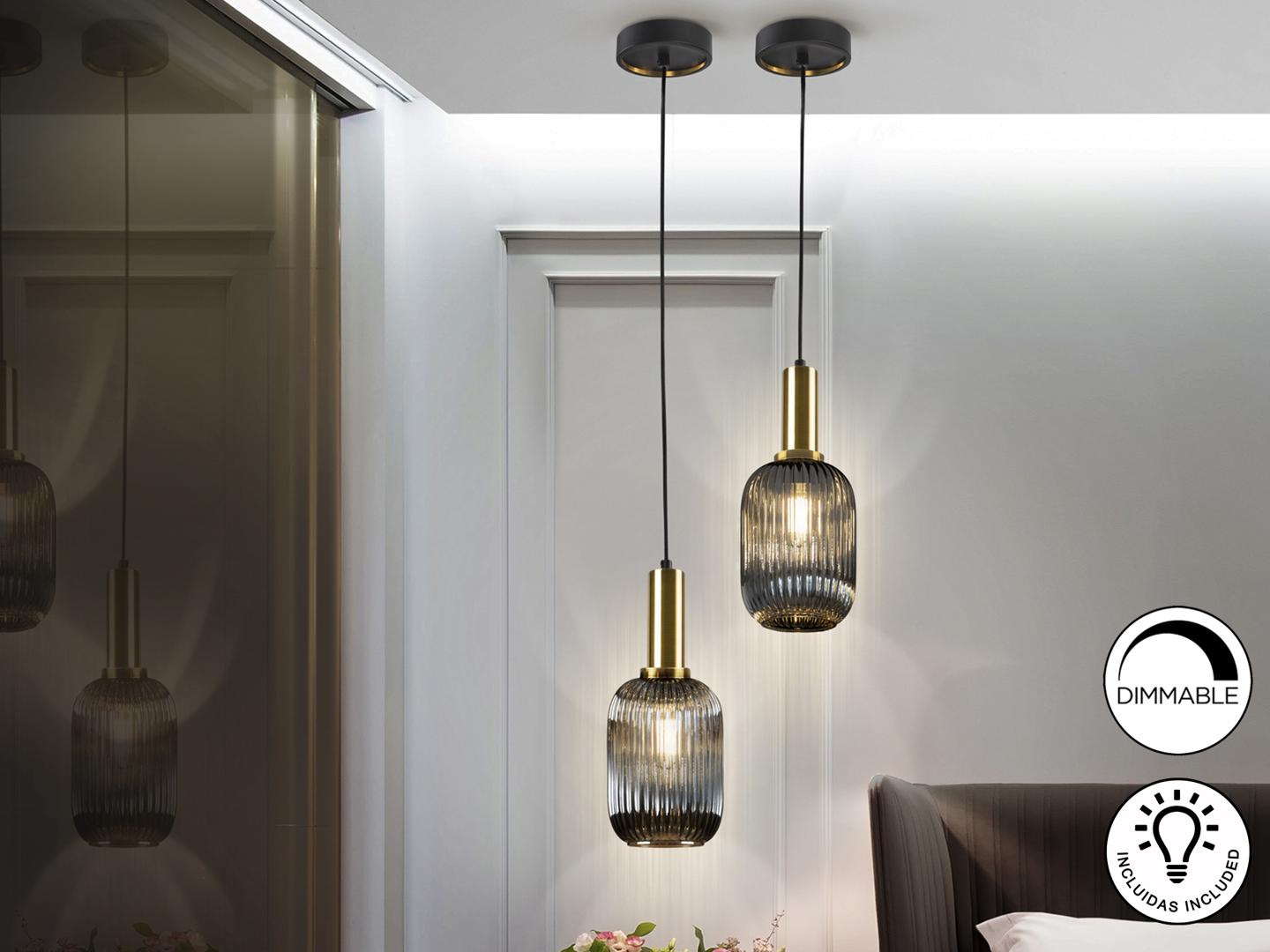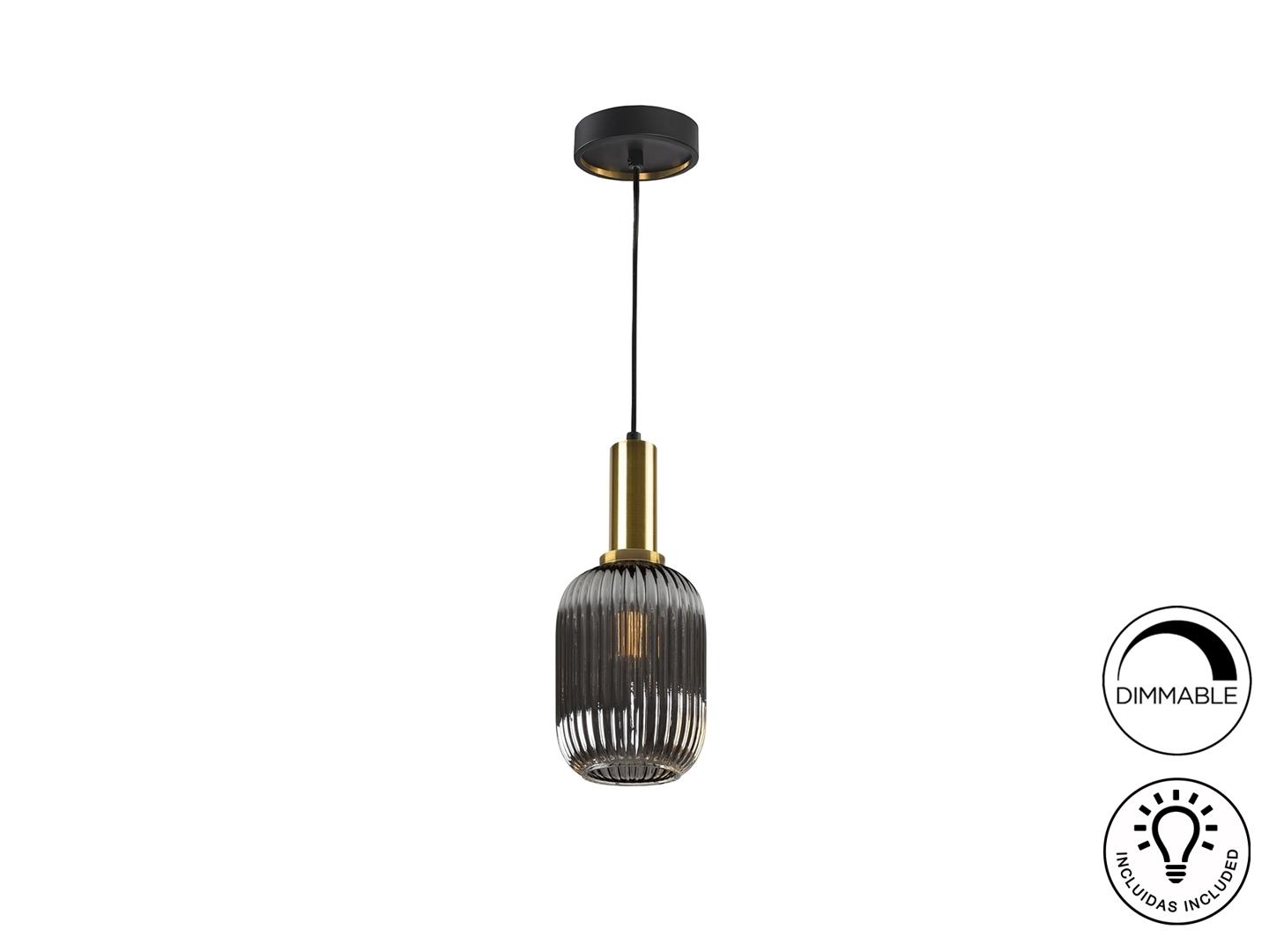 Лампа с 1 лампочкой из металла, окрашенного в черный матовый цвет, с деталями из сатинированной латуни. Абажур из прозрачного формованного стекла дымчато-серого цвета с зеркальным покрытием. Регулируется по длине. Этот товар включает в себя 1 светодиод E27 8 Вт. DIMABLE.
