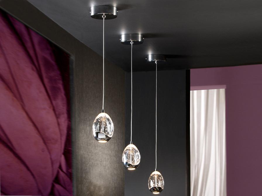 Подвесной светодиодный светильник из металла с покрытием "хром", плафоны в форме капли из массивного стекла с декоративными пузырьками внутри, с регулируемой высотой. 5W LED. 480 lm. 3.000 K.