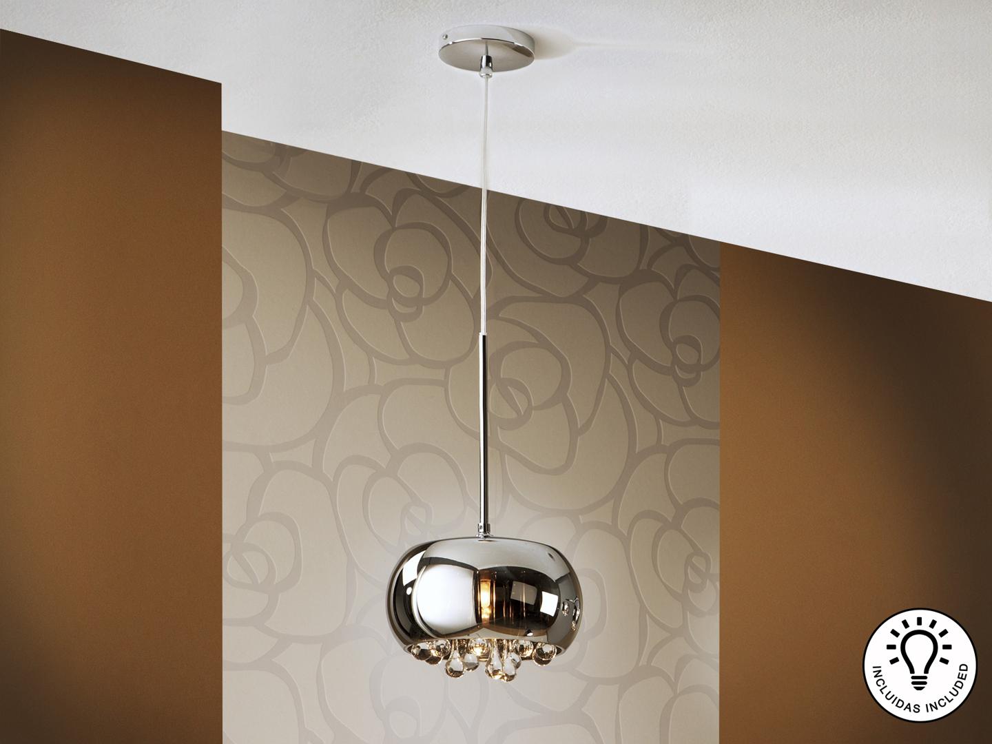 Подвесной светильник из металла с покрытием "хром", плафон из зеркального стекла с подвесками внутри из стекла подобного муранскому, Включает 1 светодиод G9 6 Вт.