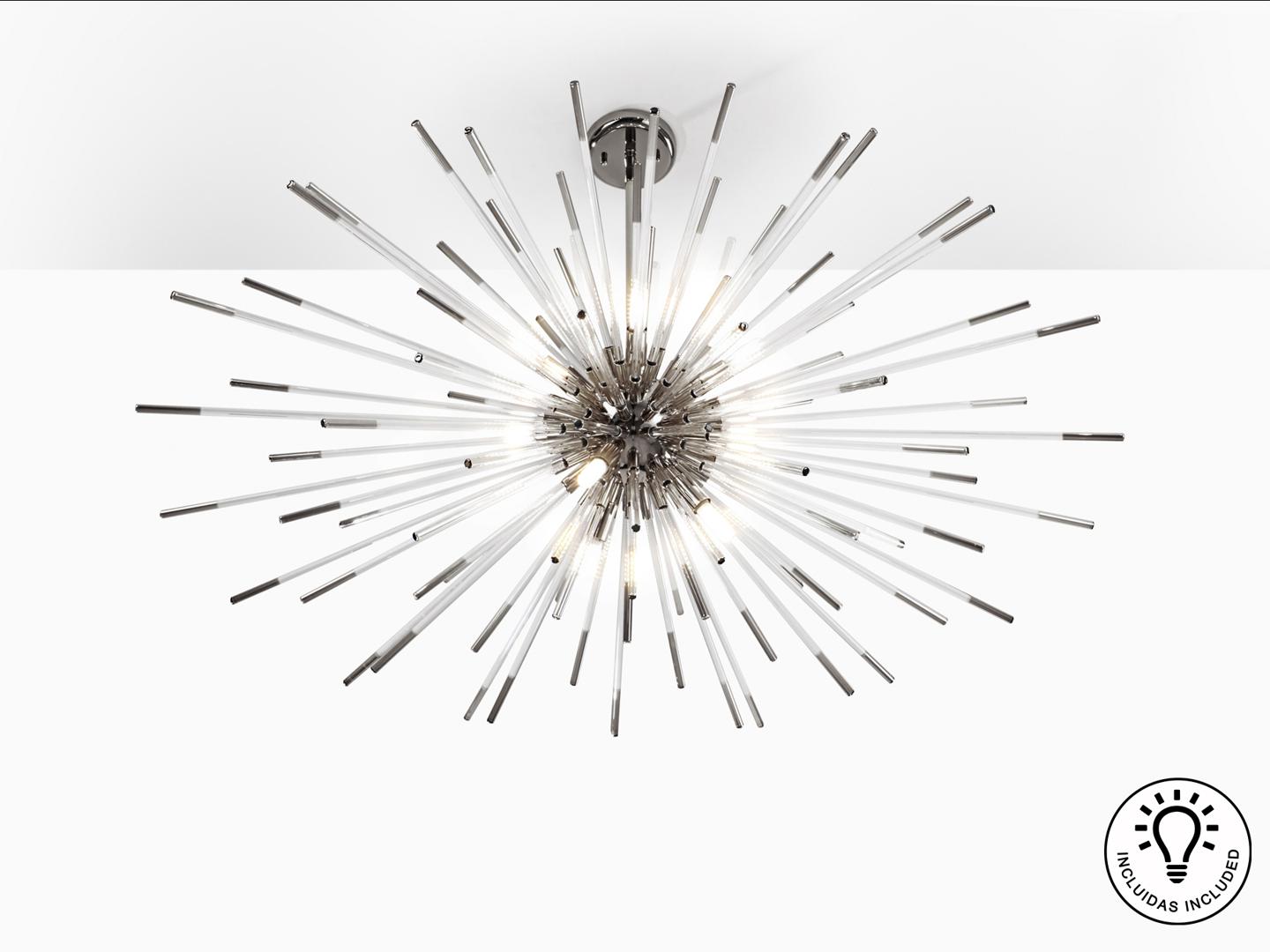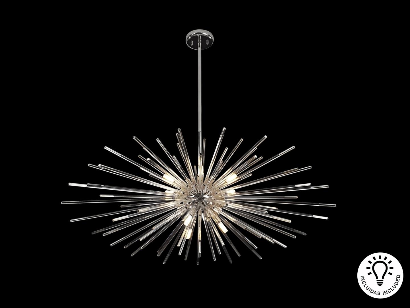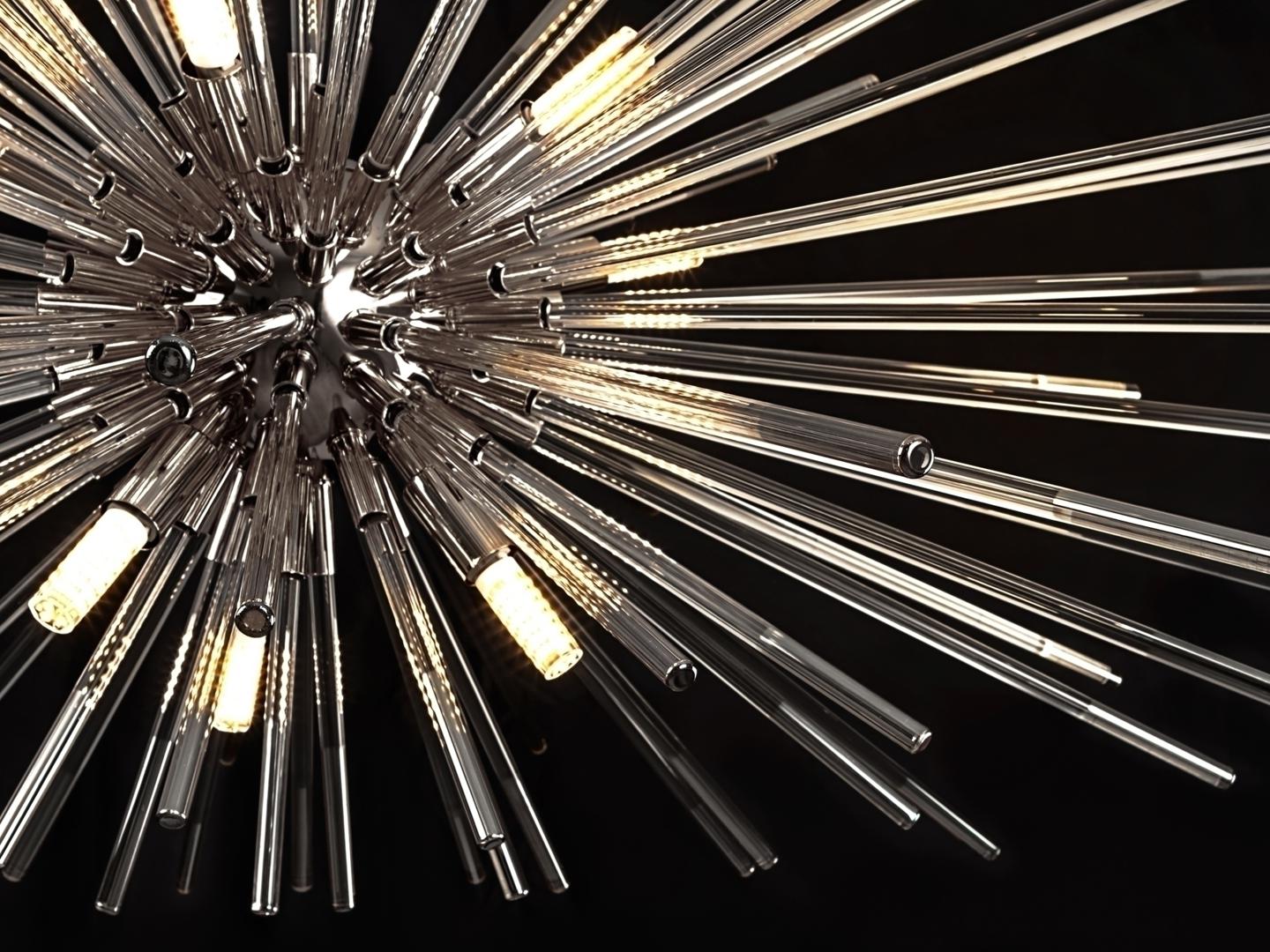 Подвесной шарообразный светильник из хромированного металла. Стержни из прозрачного стекла с покрытием "тёмный хром" на концах, с регулируемой высотой. Включает 9 светодиодов G9 мощностью 6 Вт.