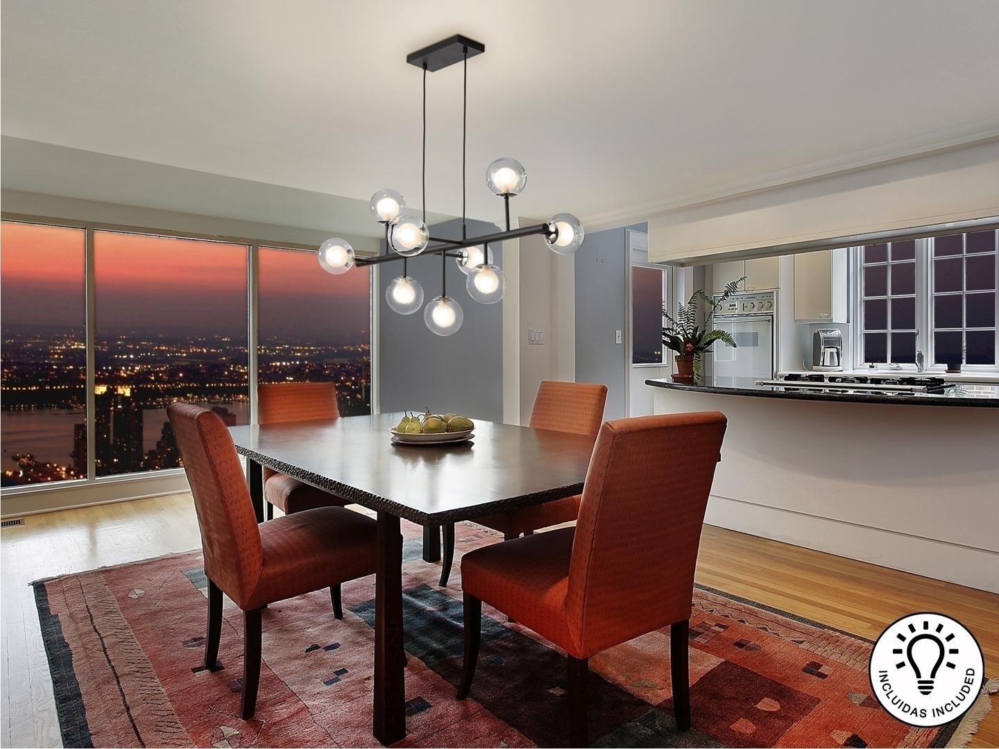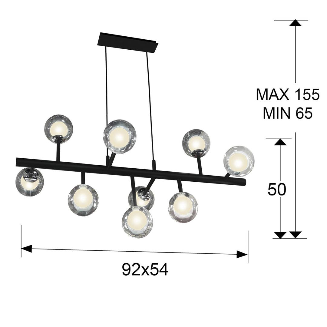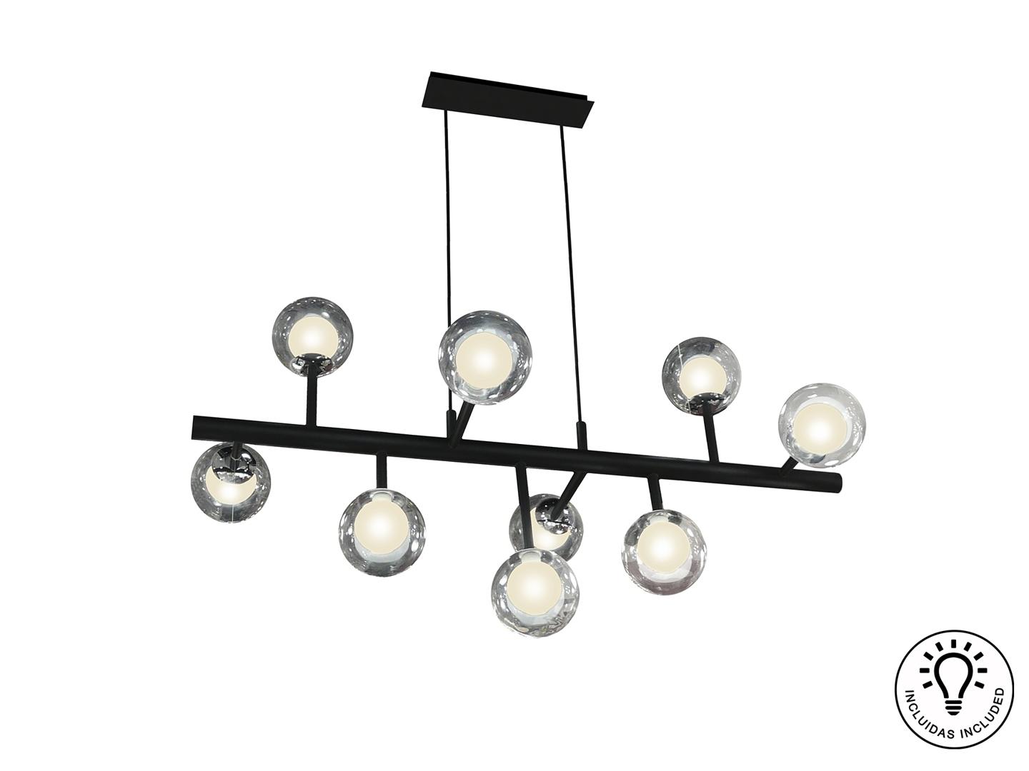 Подвесной светильник из металла с матовым чёрным покрытием с хромированными элементами. Двойные сферические плафоны: внутри из опалового стекла и снаружи из прозрачного стекла. Включает 9 светодиодов G9, 6 Вт.