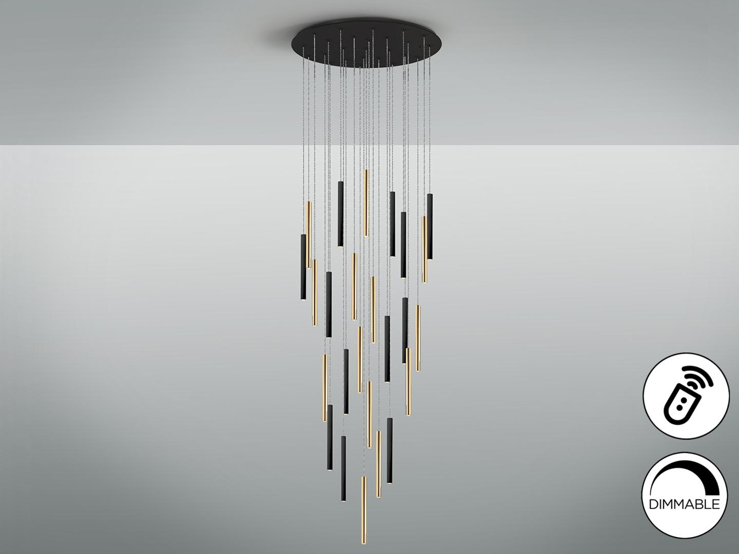 Круглый светодиодный светильник на 25 ламп. Изготовлен из металла, покрыт золотом и черным матовым покрытием. Рассеиватель из опалового акрила. Светодиод 125 Вт, 11250 лм, 3000 К. Максимальная длина 300 см. DIMMABLE. Пульт дистанционного управления в комплекте. Этот продукт включает светодиодный приемник с диммером 0-10 В или ШИМ и радиочастотный пульт дистанционного управления. Для использования с настенным регулятором используйте только диммеры этих двух типов регулирования. Диммер другого типа может повредить драйвер светодиода.