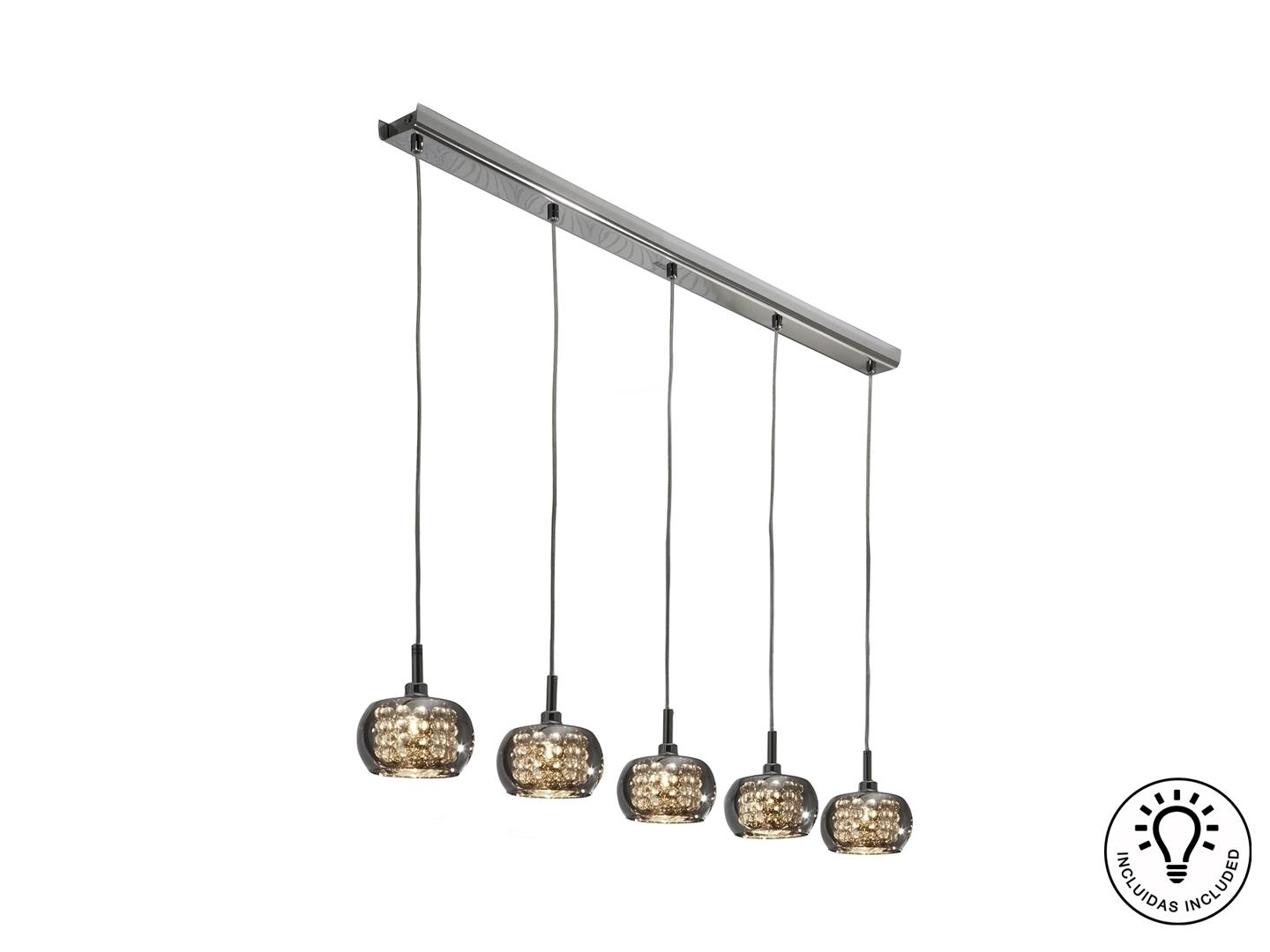 Люстра из стали с блестящим покрытием. Плафоны из зеркального стекла, внутри нити бусин из стекла, Включает 5 светодиодов G9 мощностью 6 Вт.