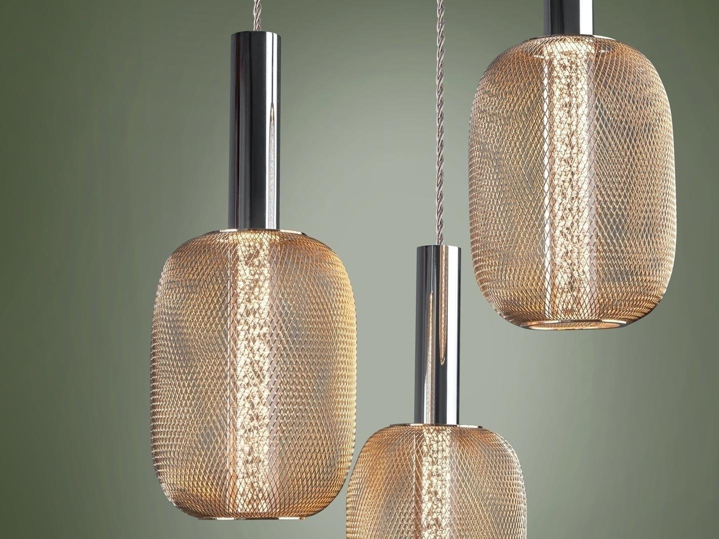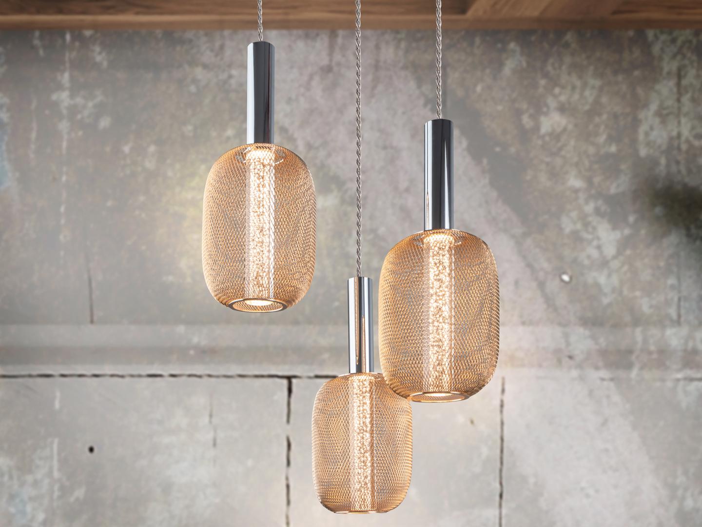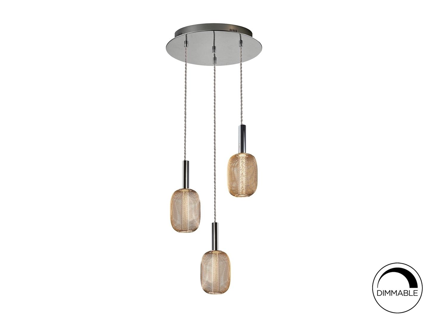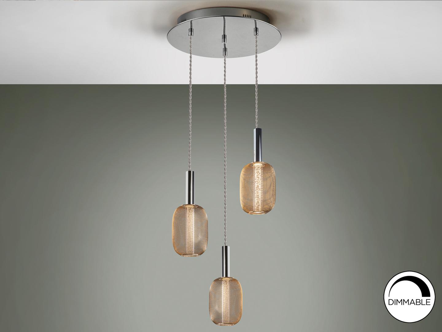 Светодиодный светильник на 3 светильника из хромированного металла. Двойной плафон с внутренним прозрачным акриловым цилиндром с пузырьками и внешним овалом из металлической сетки яркого золота. 15W LED, 1350 lm, 3.000 K. DIMMABLE.