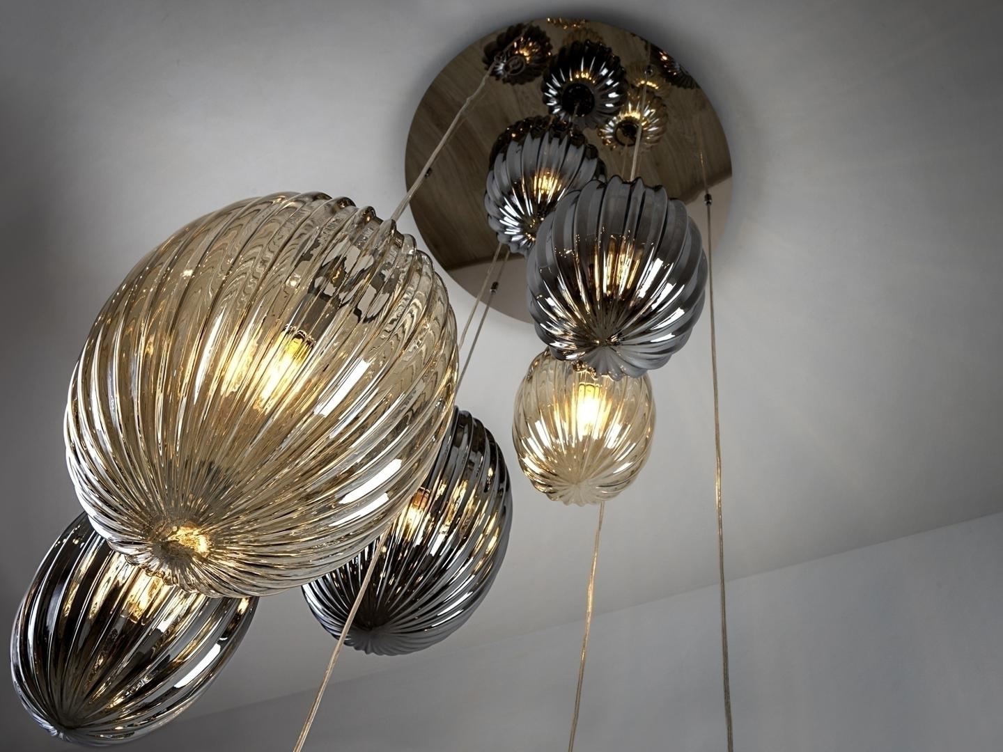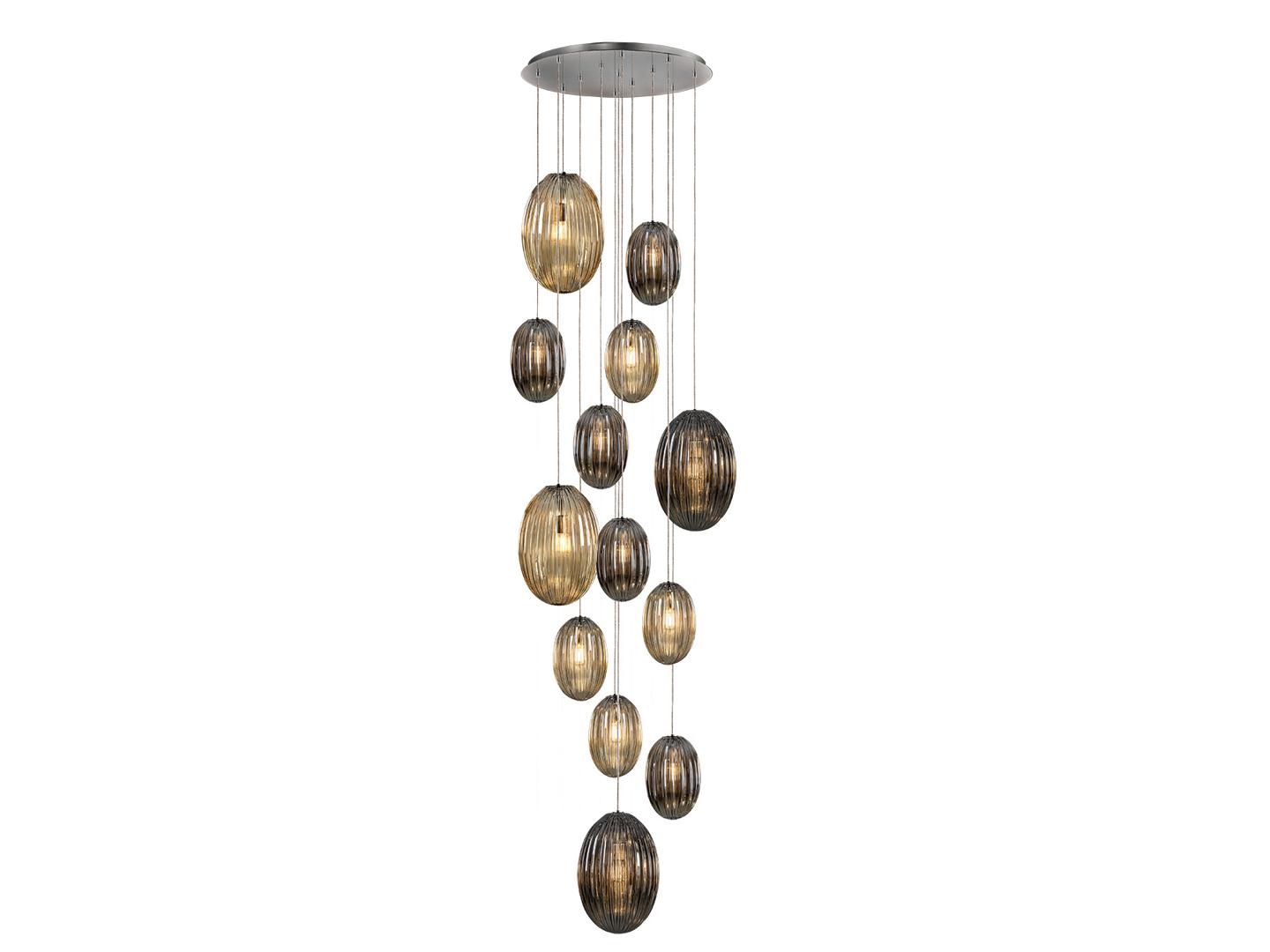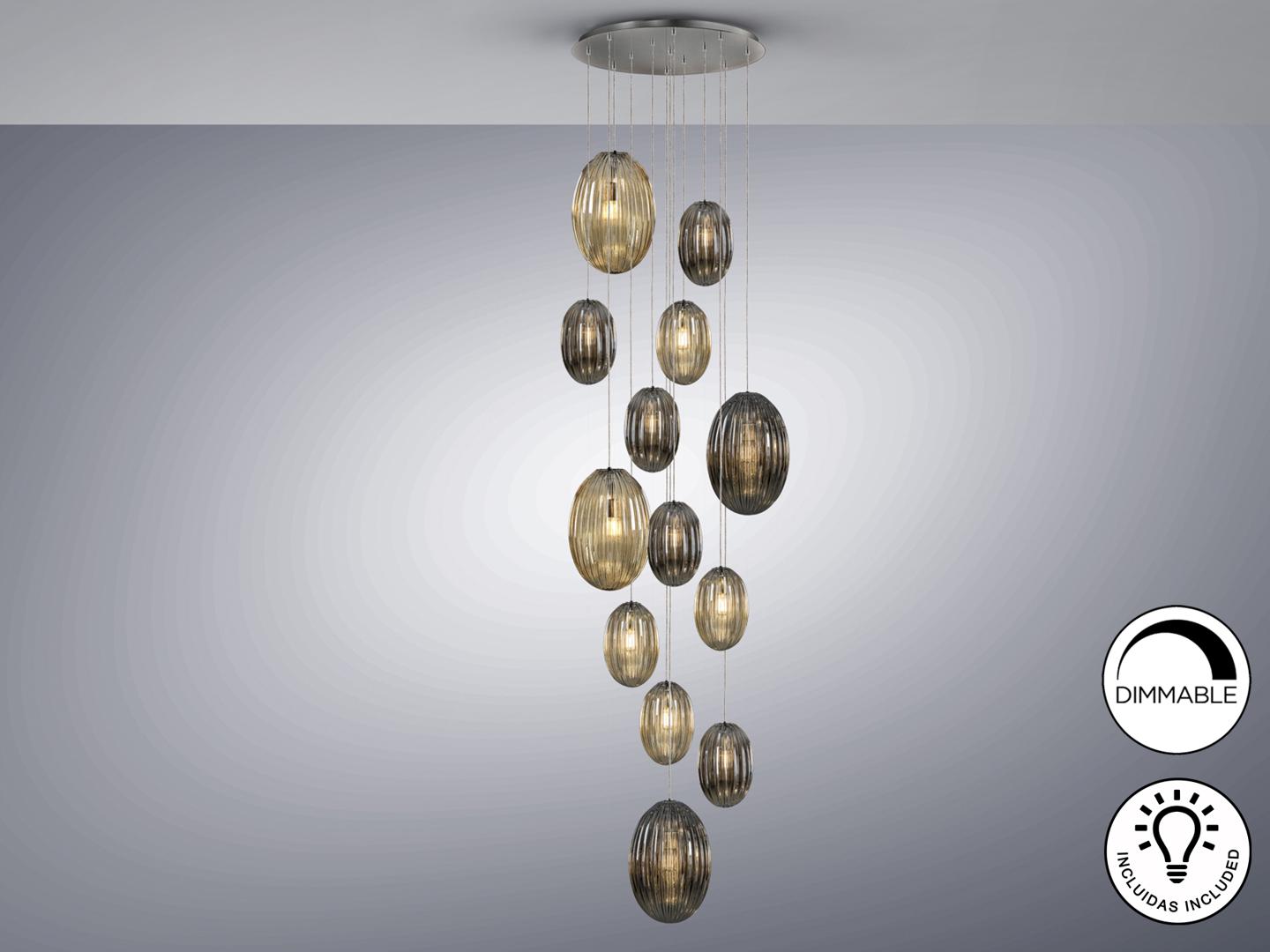 Подвесной светильник с 13 лампами, из металла с покрытием "хром". Маленькие и большие плафоны из стекла дымчато-зеркального цвета и янтарного цвета. С регулируемой высотой. Включает 13 светодиодов E27 мощностью 8 Вт. Диммируемый.