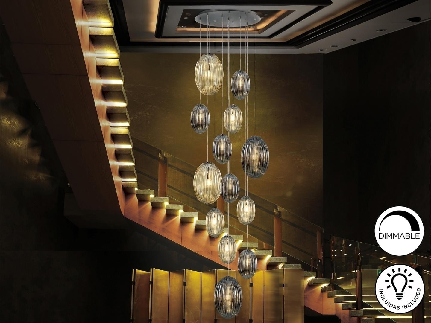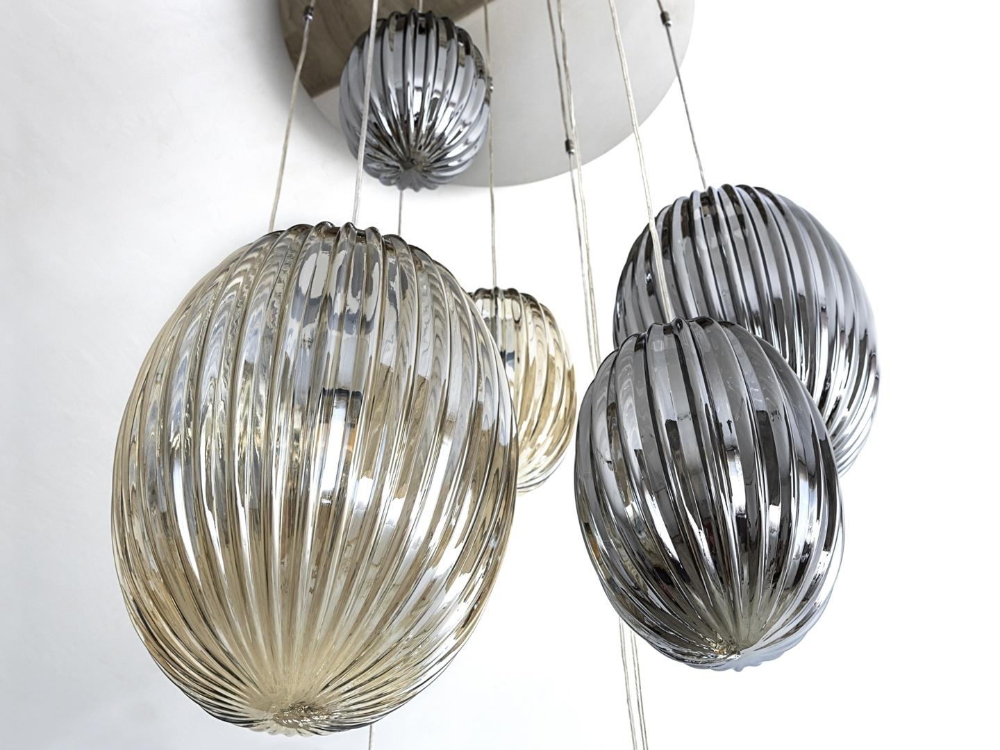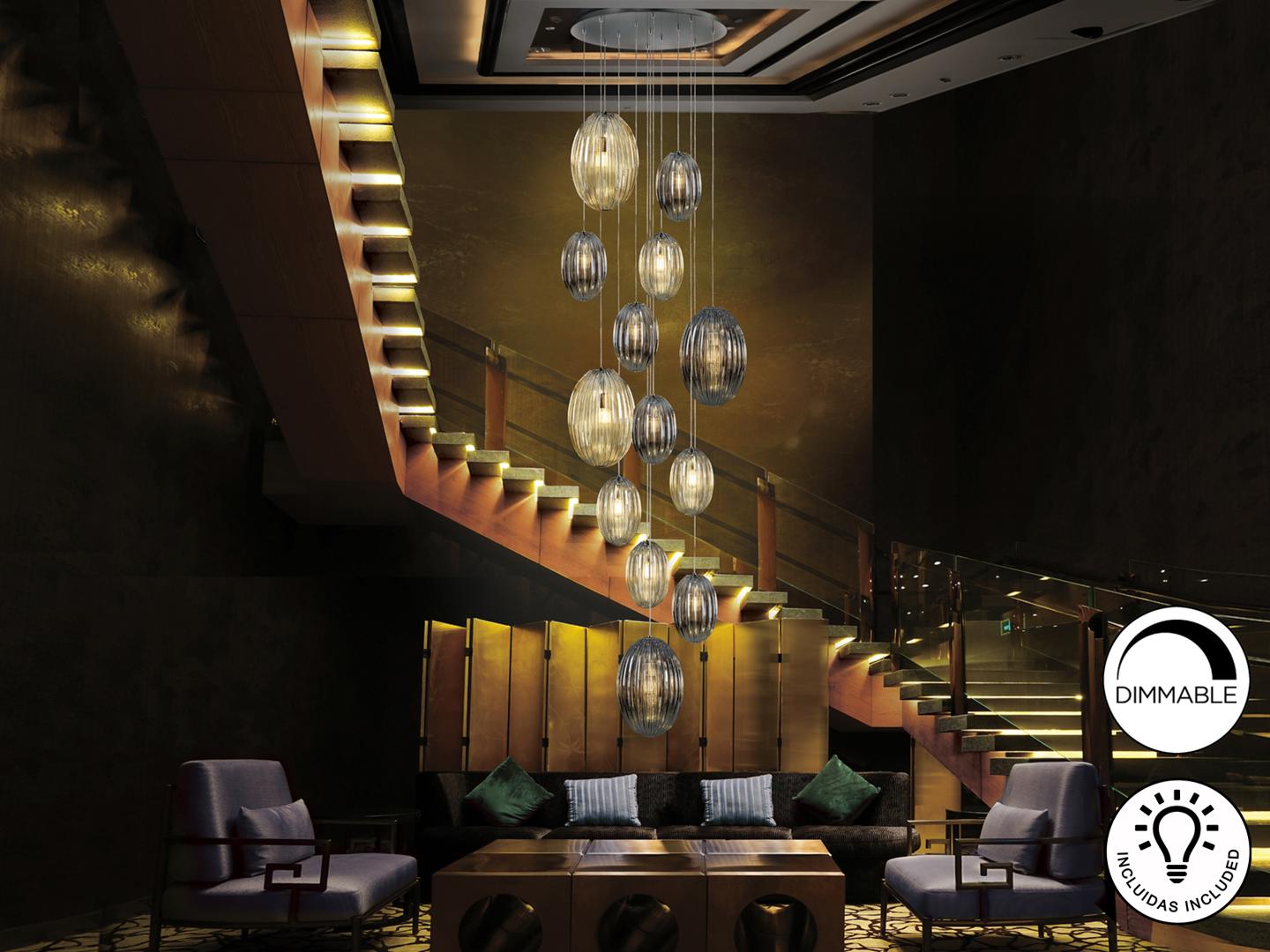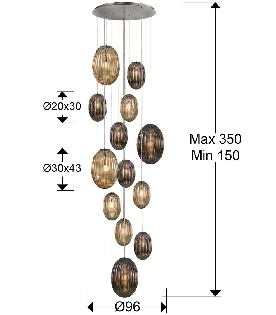 Подвесной светильник с 13 лампами, из металла с покрытием "хром". Маленькие и большие плафоны из стекла дымчато-зеркального цвета и янтарного цвета. С регулируемой высотой. Включает 13 светодиодов E27 мощностью 8 Вт. Диммируемый.