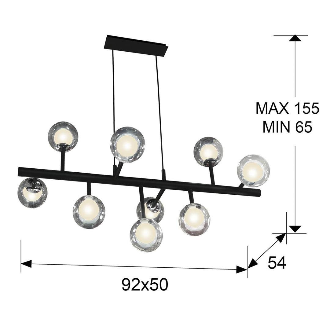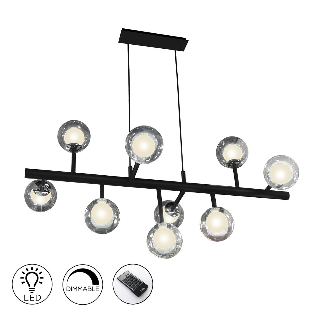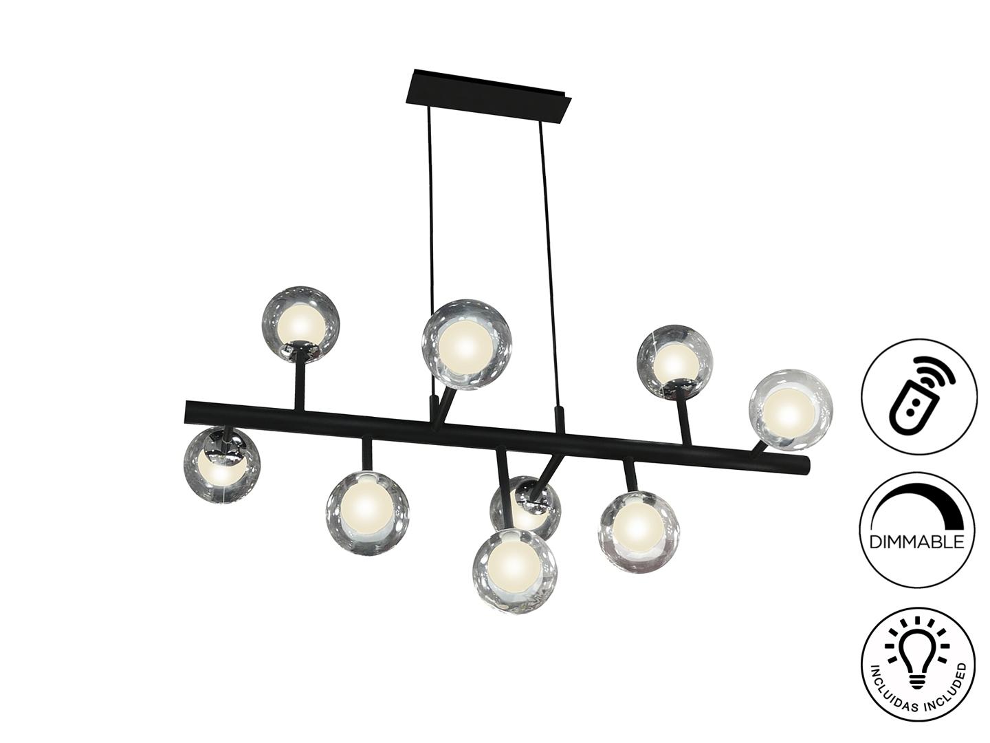 Подвесной светильник из металла с матовым чёрным покрытием с хромированными элементами. Двойные сферические плафоны: внутри из опалового стекла и снаружи из прозрачного стекла. ДИММИРУЕМЫЙ. В комплекте с пультом ДУ. Этот продукт включает в себя диммер приемника и радиочастотный пульт дистанционного управления. · Включает 9 светодиодов G9 мощностью 4,5 Вт.