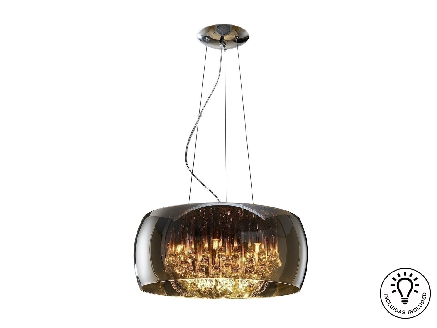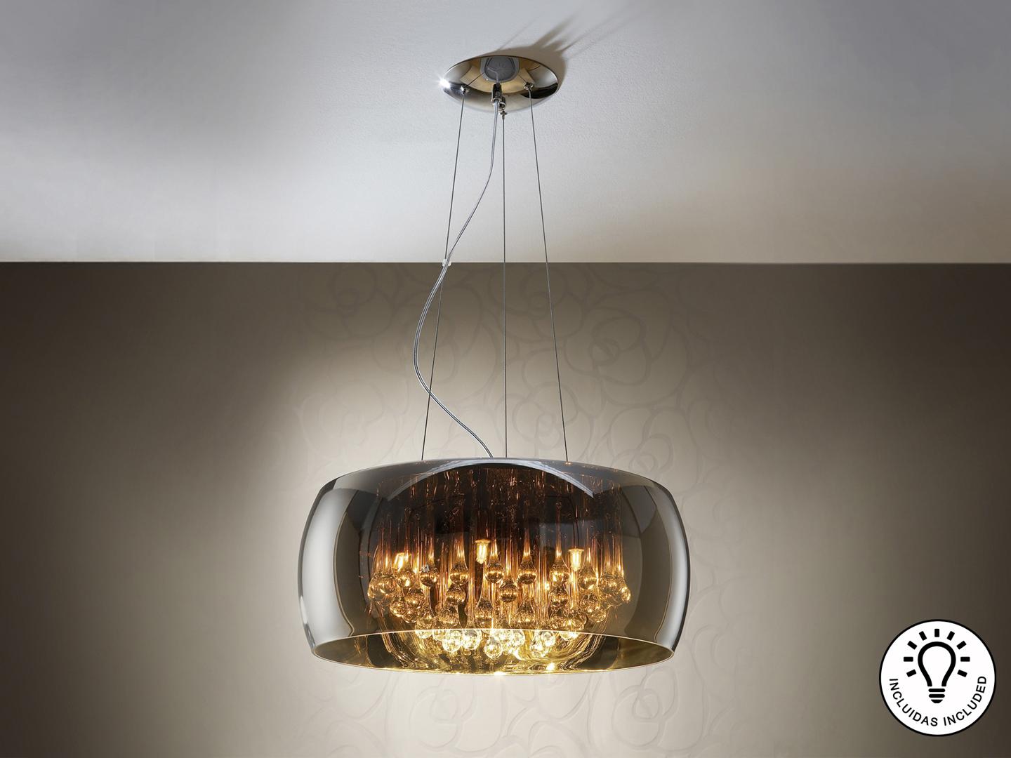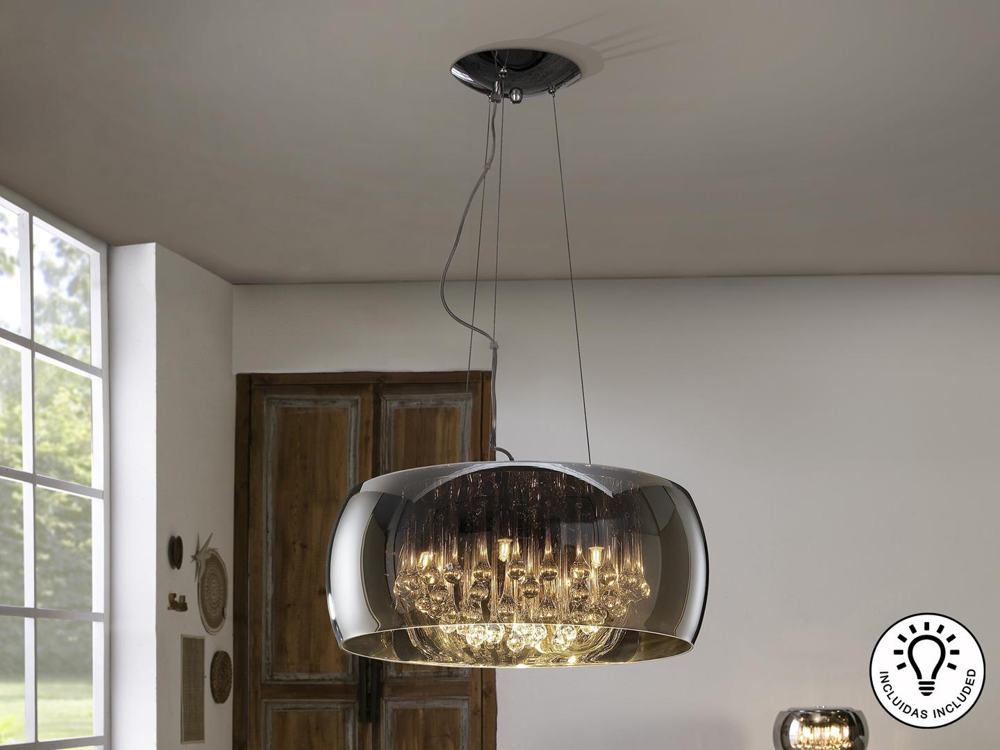 Подвесной светильник из металла с покрытием "хром", плафон из зеркального стекла с подвесками внутри из стекла подобного муранскому, Включает 6 светодиодов G9 мощностью 6 Вт.