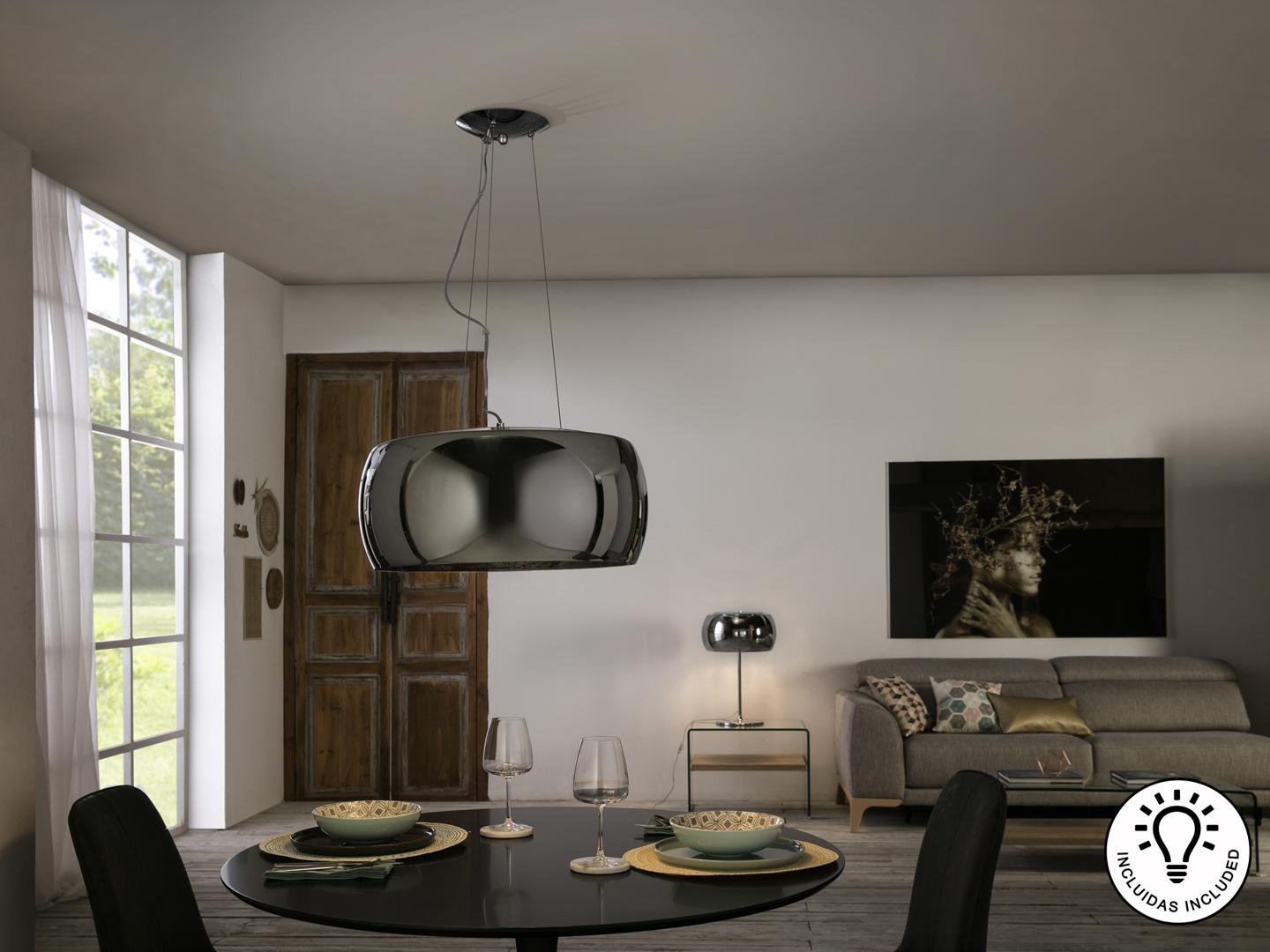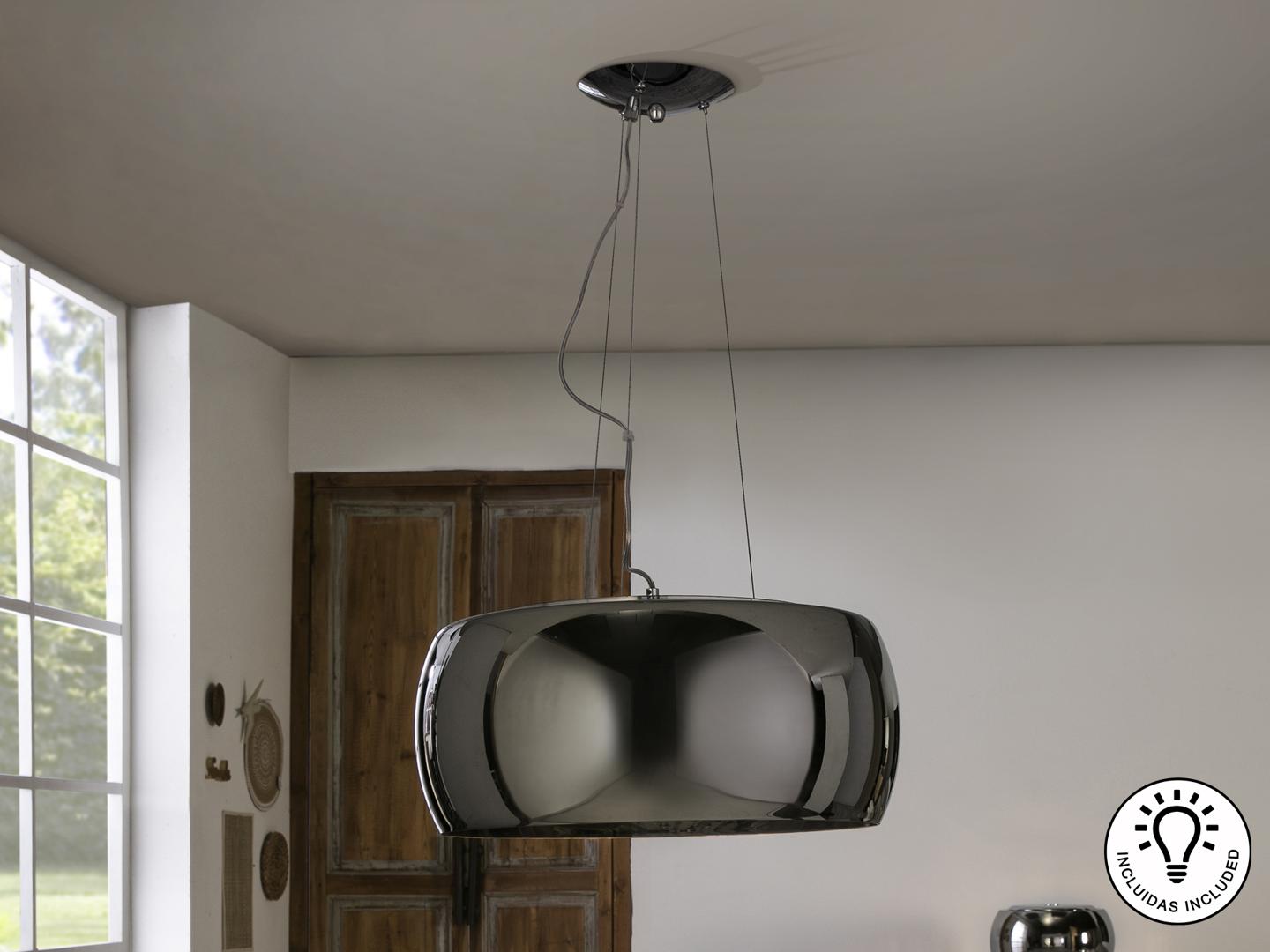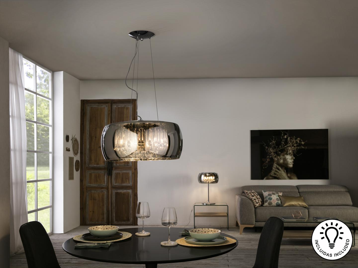 Подвесной светильник из металла с покрытием "хром", плафон из зеркального стекла с подвесками внутри из стекла подобного муранскому, Включает 6 светодиодов G9 мощностью 6 Вт.