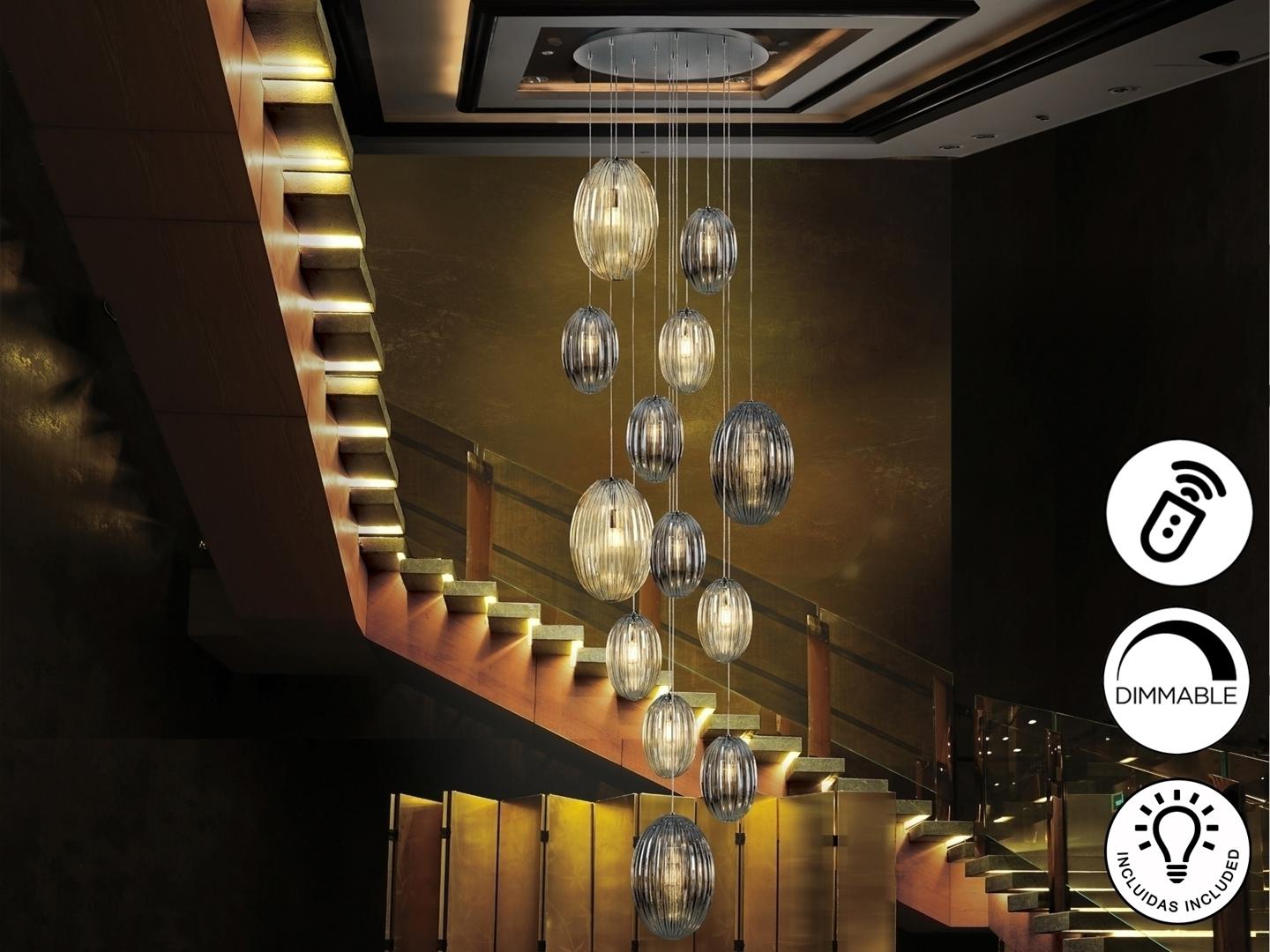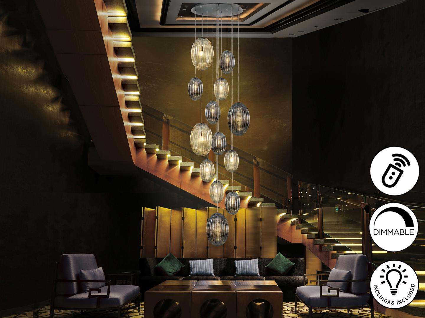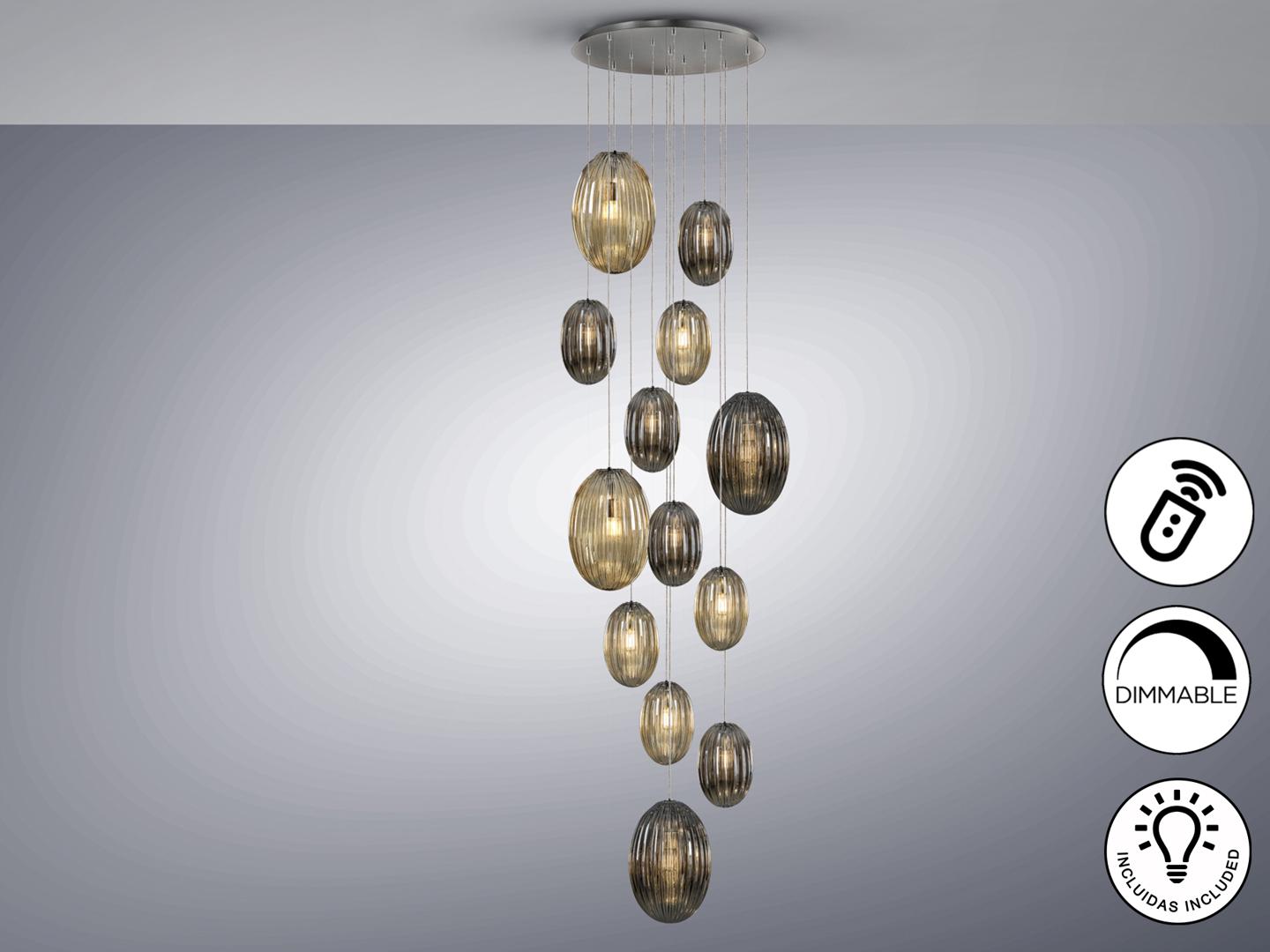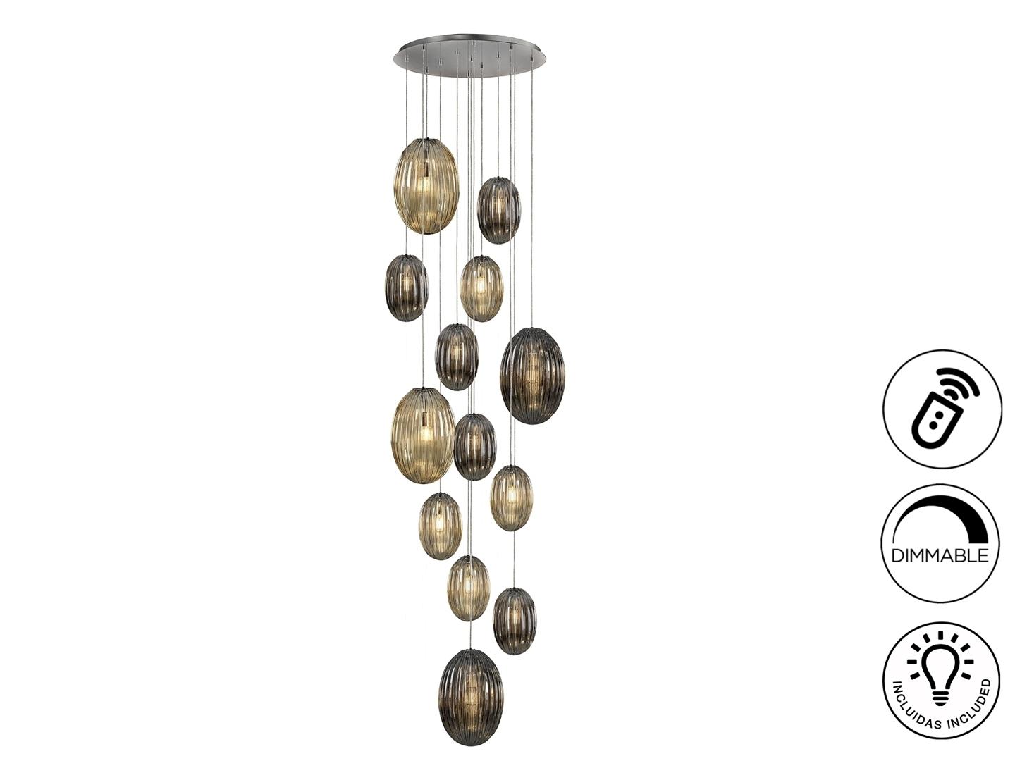 Подвесной светильник с 13 лампами, из металла с покрытием "хром". Маленькие и большие плафоны из стекла дымчато-зеркального цвета и янтарного цвета. С регулируемой высотой. Диммируемый. В комплекте с пультом ДУ. Этот продукт включает в себя диммер приемника и радиочастотный пульт дистанционного управления. · Включает 13 светодиодов E27 мощностью 8 Вт.