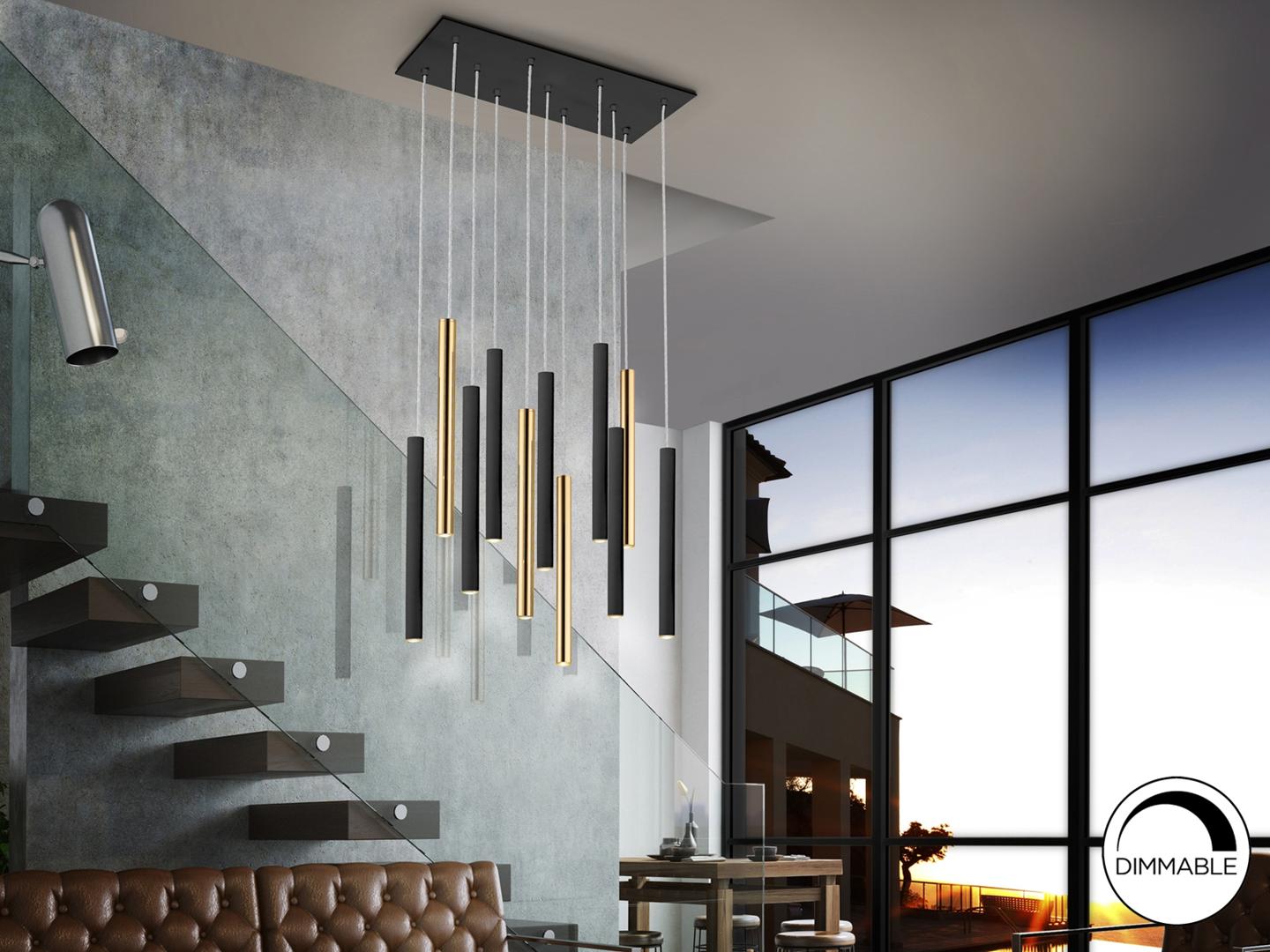 Подвесной светильник LED с 11 лампами из металла с покрытием "блестящее золото" и матовым чёрным покрытием. Акриловый рассеиватель опaлового цвета. 55W LED, 4950 Lm, 3000 K. ДИММИРУЕМЫЙ.