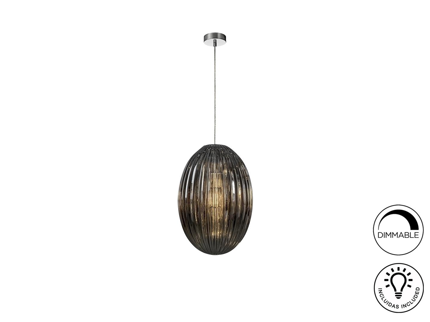 Подвесной светильник с 1 лампой, из металла с покрытием "хром". Большой плафон из стекла дымчато-зеркального цвета. С регулируемой высотой. Включает 1 светодиод E27 мощностью 8 Вт. Диммируемый.