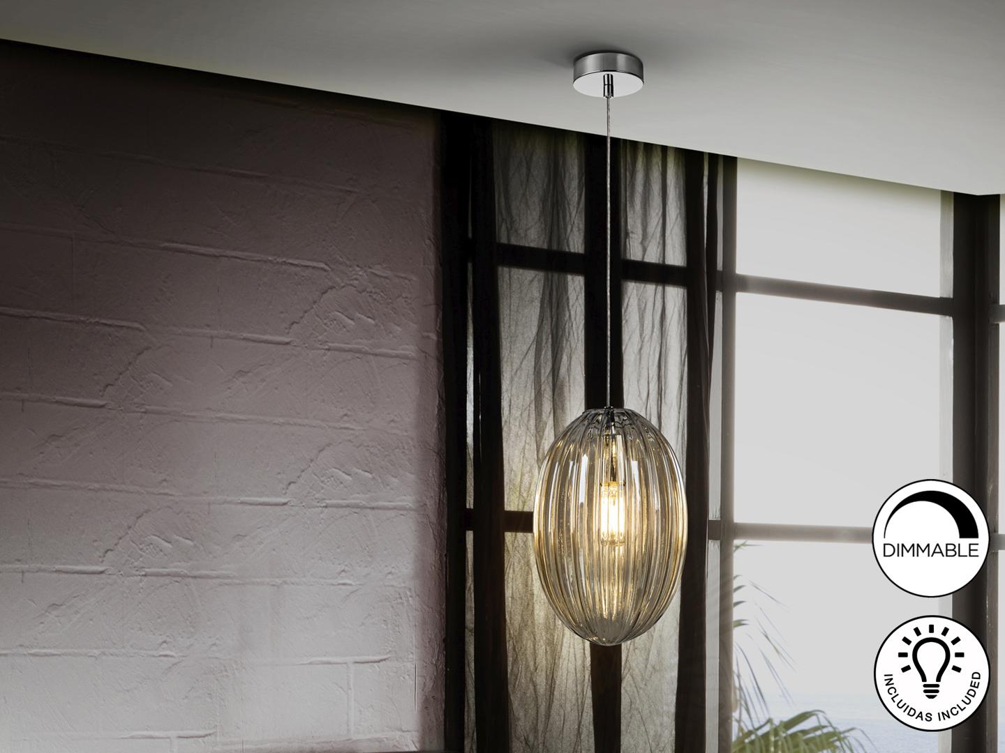 Подвесной светильник с 1 лампой, из металла с покрытием "хром". Маленький плафон из стекла янтарного цвета. С регулируемой высотой. Включает 1 светодиод E27 мощностью 8 Вт. Диммируемый.