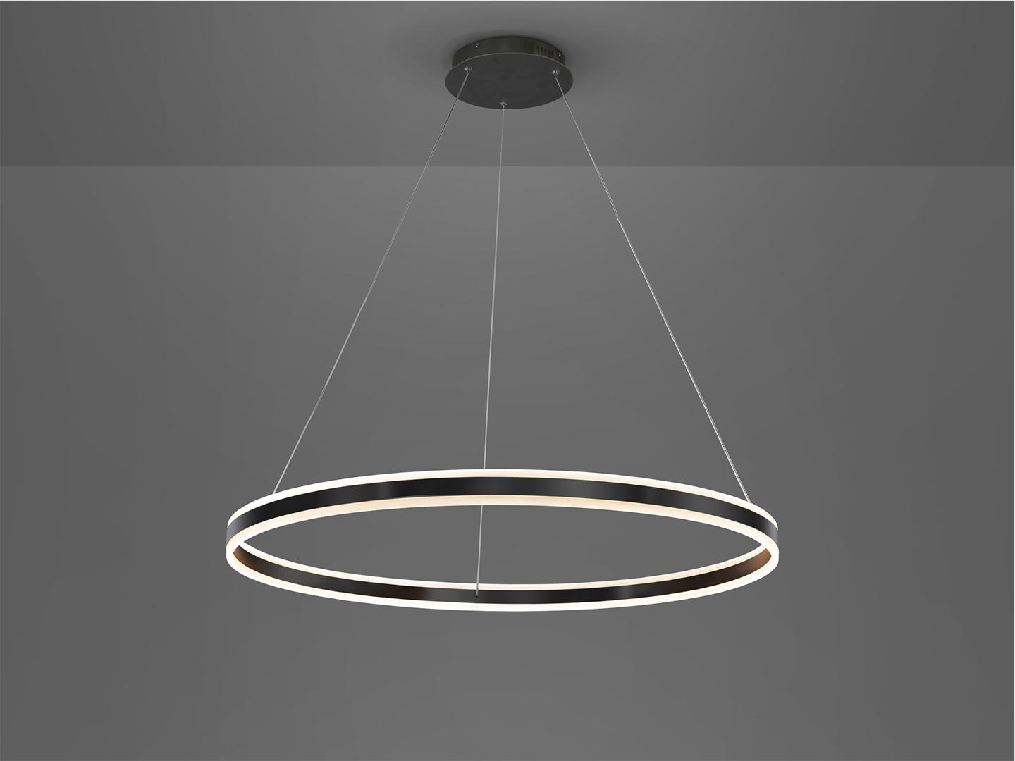 Лампа из металла и алюминия, матовая черная отделка. Кольцо с рассеивателем из опалового акрила. Регулируемая высота. Светодиод 110Вт 3000К. 6600 лм