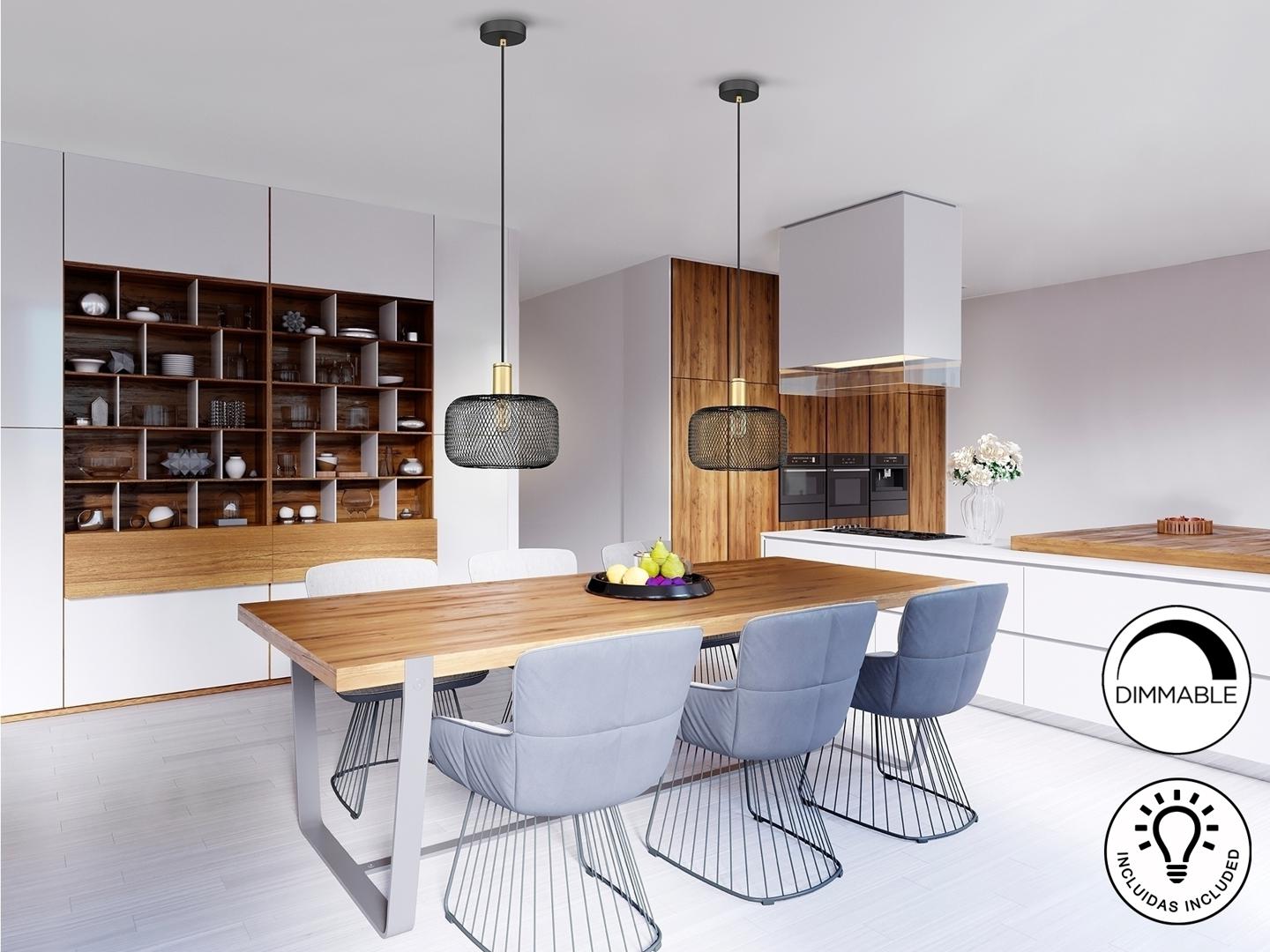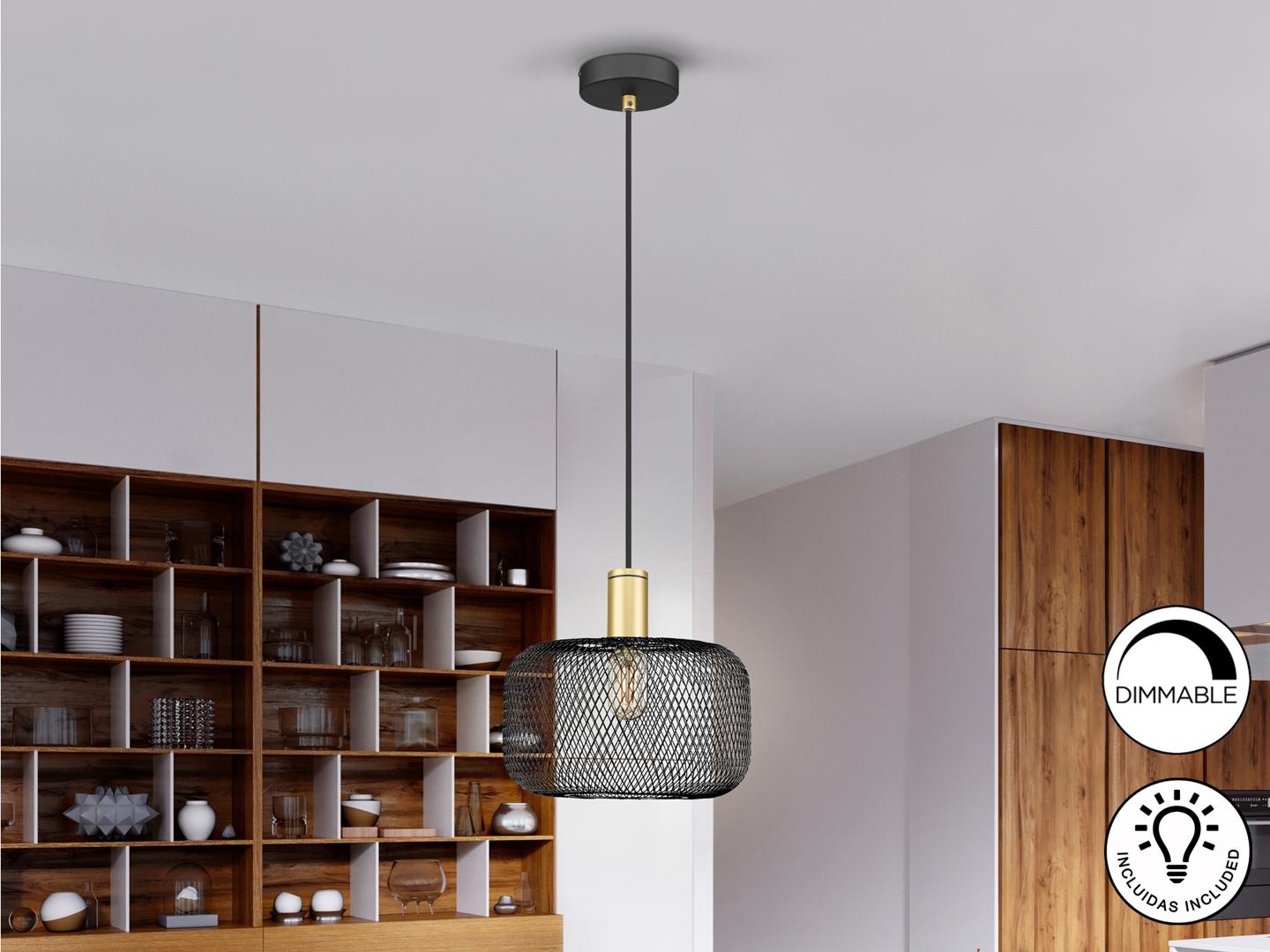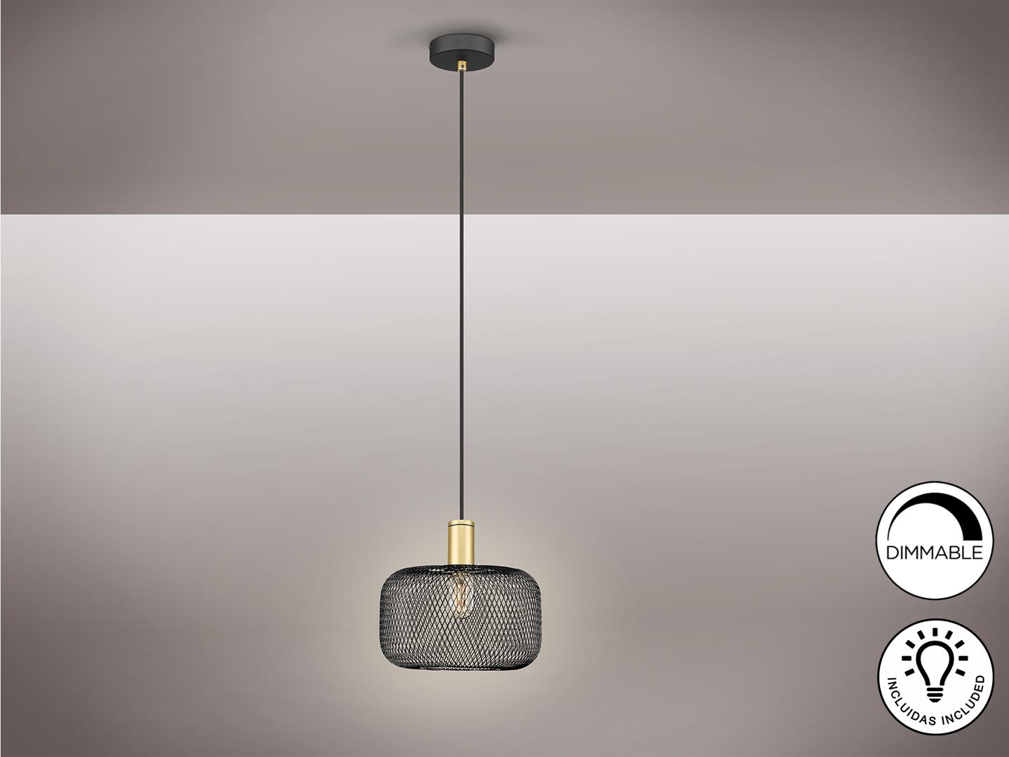 Люстра с 1 лампочкой из металла, с абажуром из металлической сетки, окрашена в матовый черный и золотой цвета. Кабель в черной текстильной оболочке. ·Этот товар включает в себя 1 светодиод E27 8 Вт. DIMABLE.