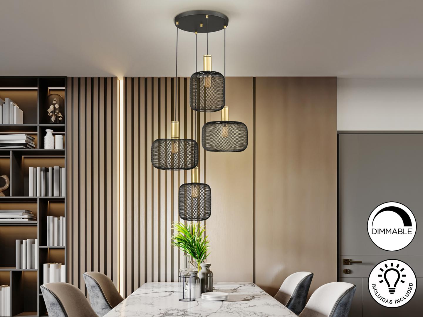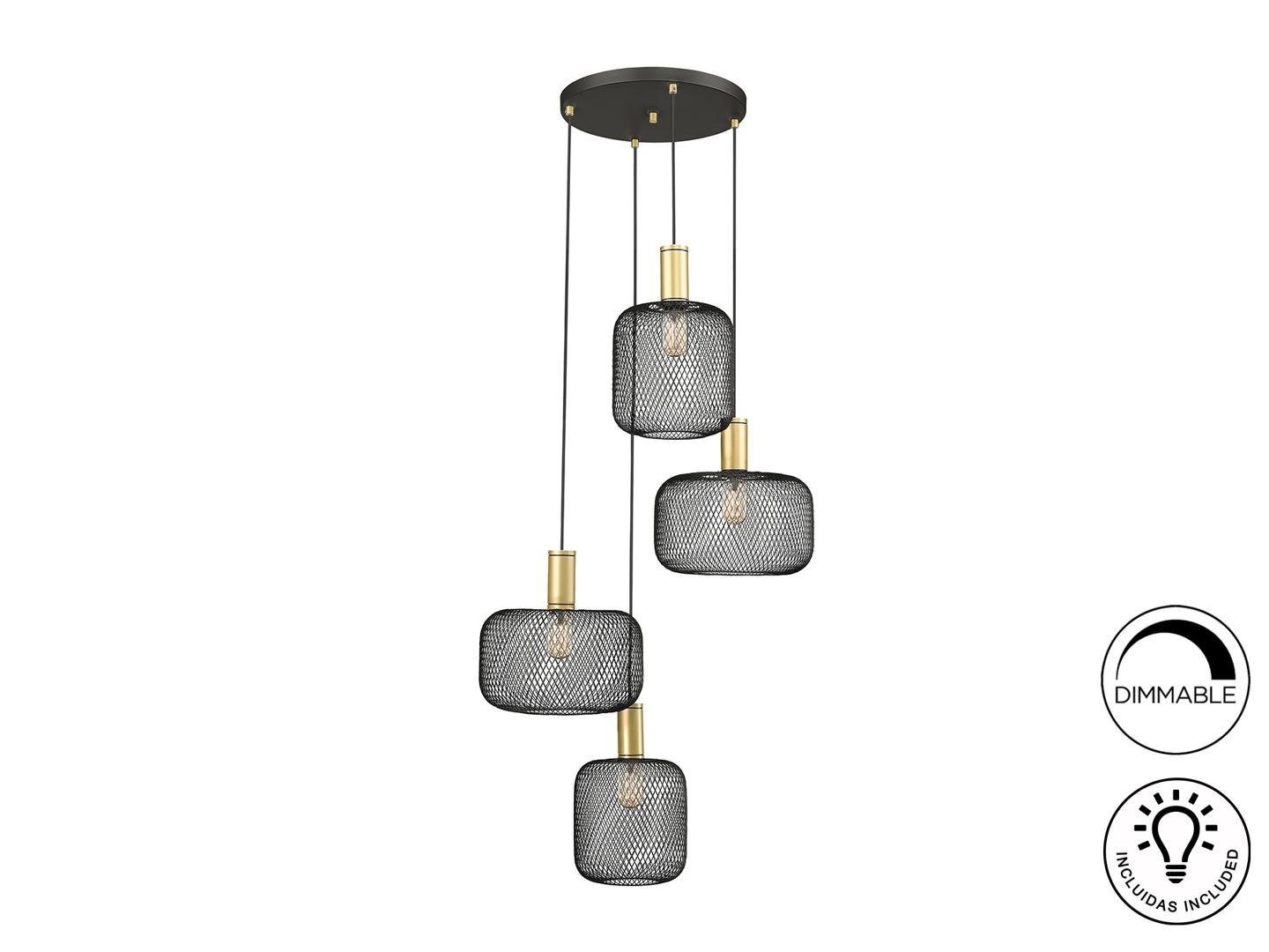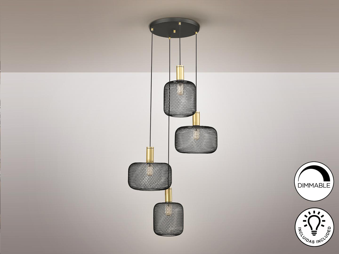 Круглый светильник из 4 ламп из металла. Включает в себя 2 дизайна металлических сетчатых абажуров. Матовая черно-золотая окраска. Кабель в черной текстильной оболочке. ·Этот товар включает в себя 4 светодиода E27 мощностью 8 Вт. DIMABLE.