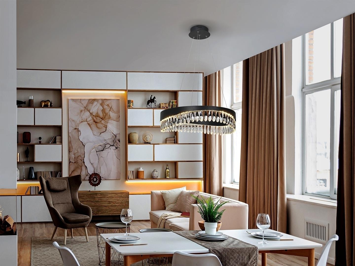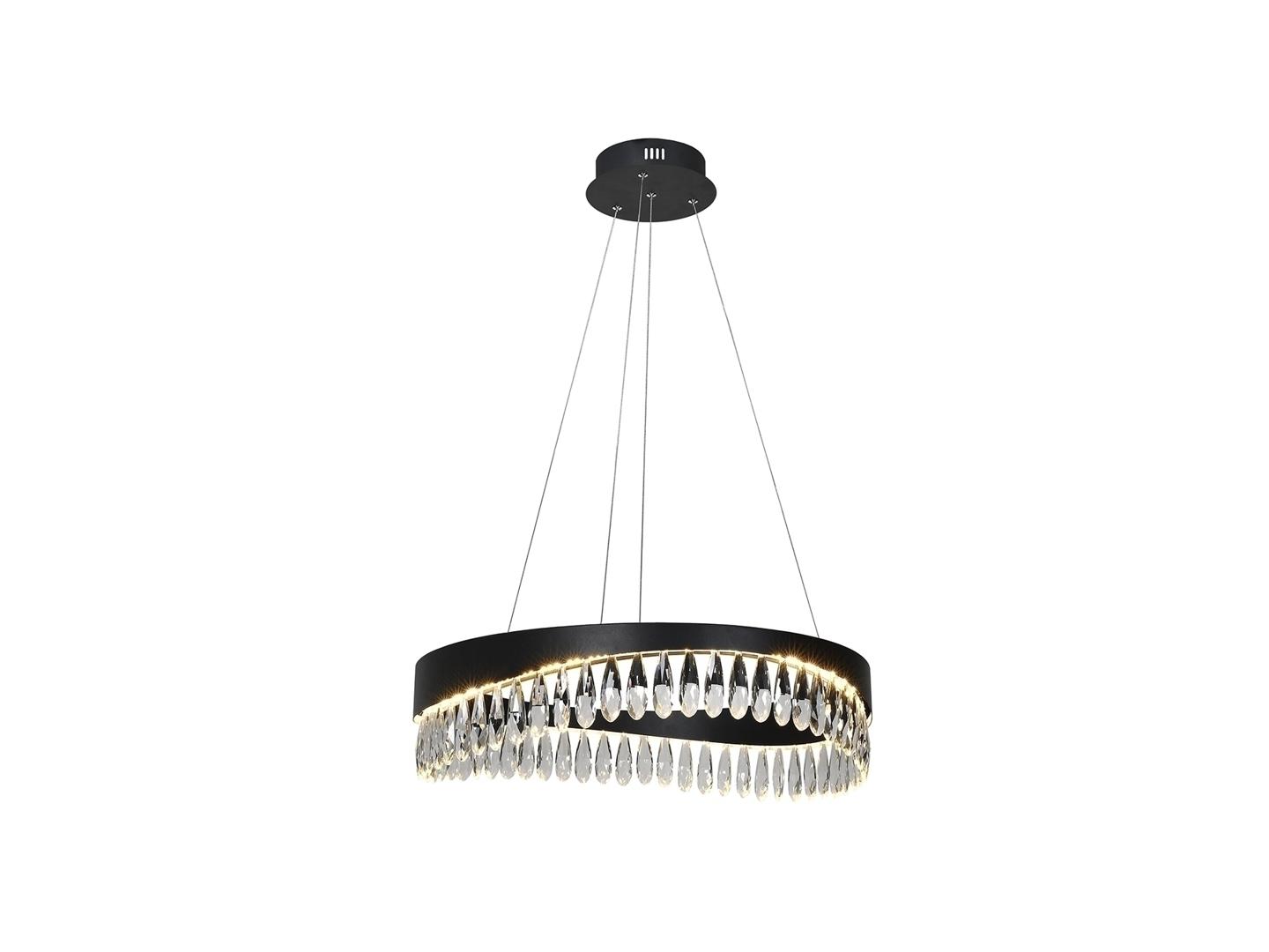 Лампа из металла и алюминия, матовая черная отделка. Рассеиватель из граненых хрустальных капель. Регулируется по высоте. Светодиодное освещение 30Вт, 1300Лм, 3000К.