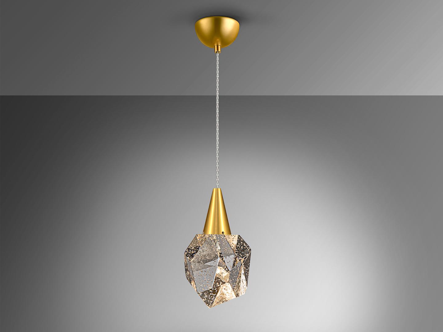 Лампа с 1 светодиодом, изготовлена из металла, матовое золотое покрытие. Многогранный абажур из цельного стекла с декоративными пузырьками внутри. Регулируется по высоте. Светодиод 4Вт. 450 лм. 3000 К.