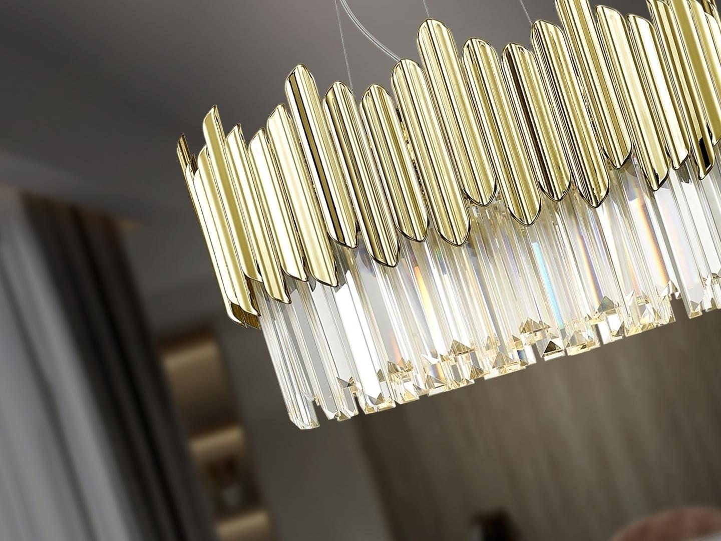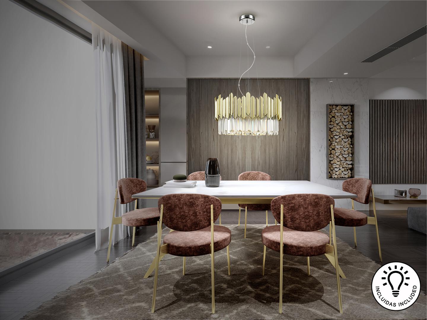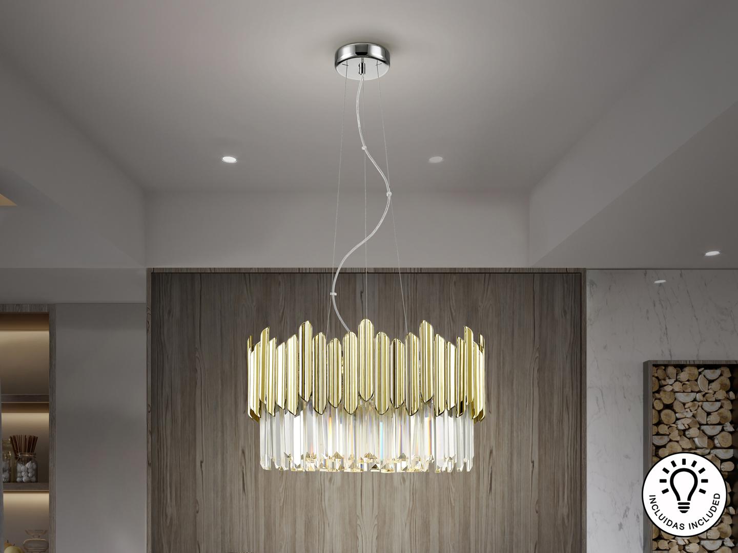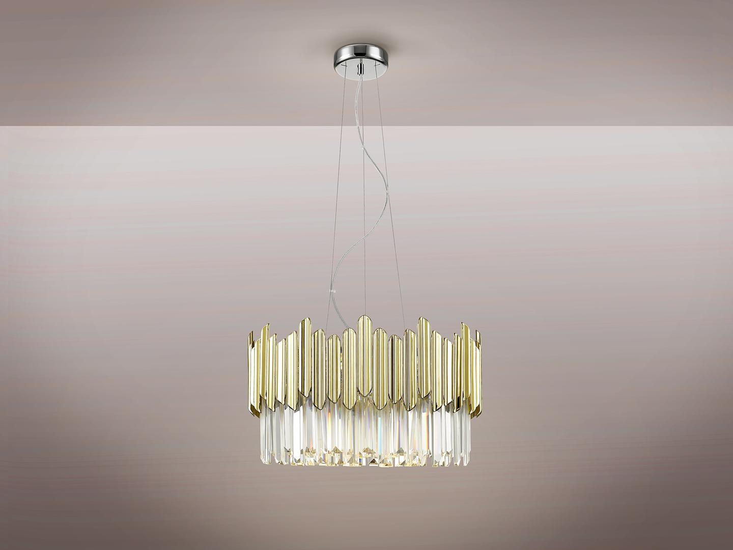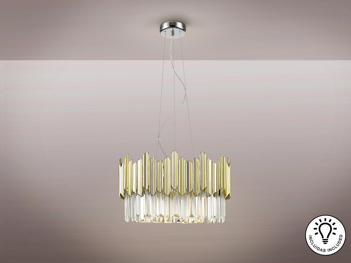 Светильник из металла, хромированная отделка. Абажур из граненых стеклянных призм с деталями из АБС-пластика с позолоченным покрытием. ·В комплект поставки входят 6 светодиодов G9 мощностью 6 Вт. Эта лампа поставляется с гравитационными переключателями для улучшения крепления к потолку.