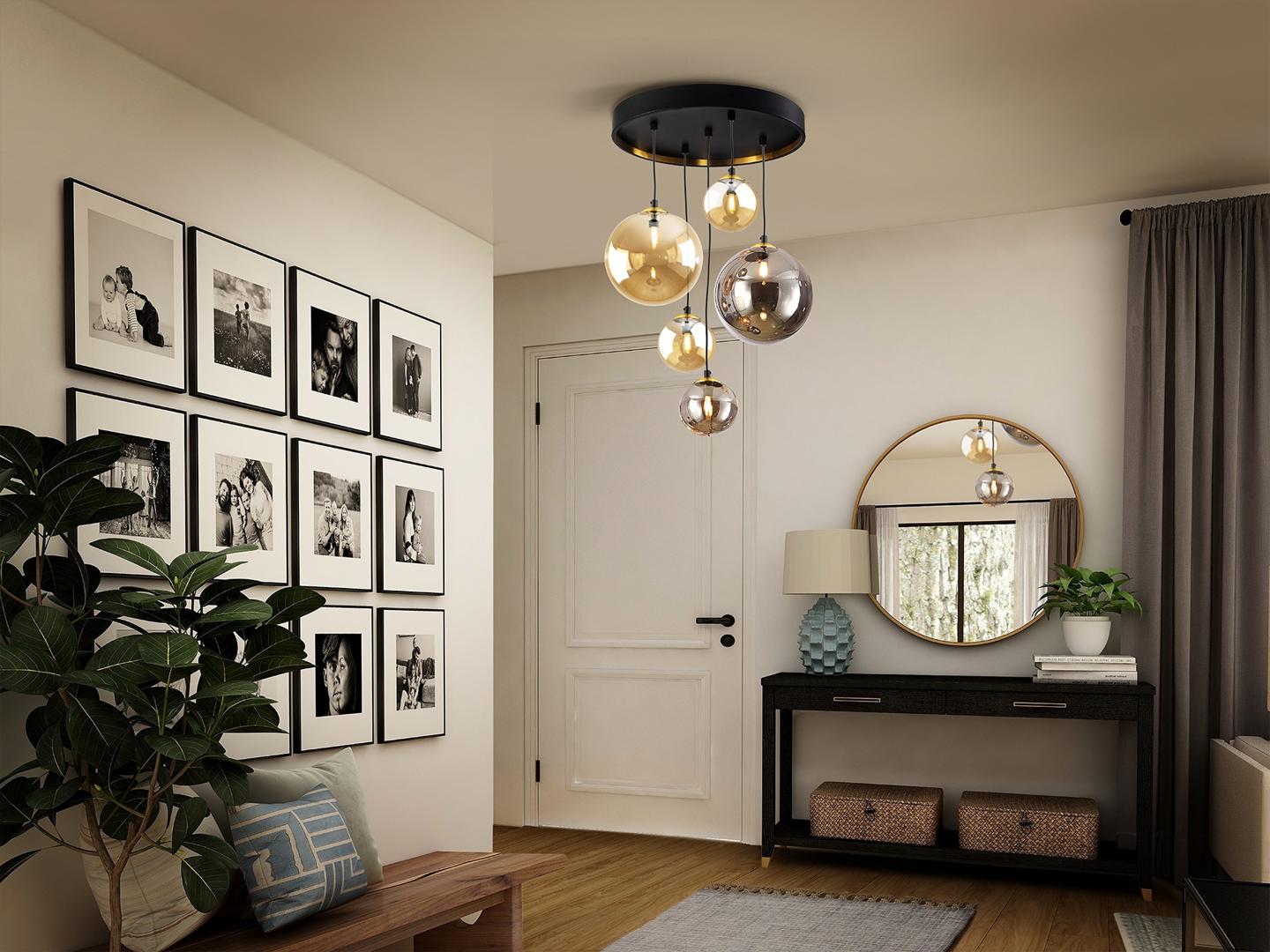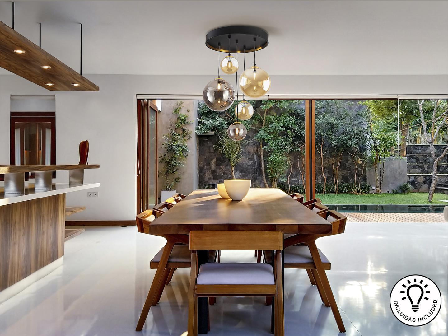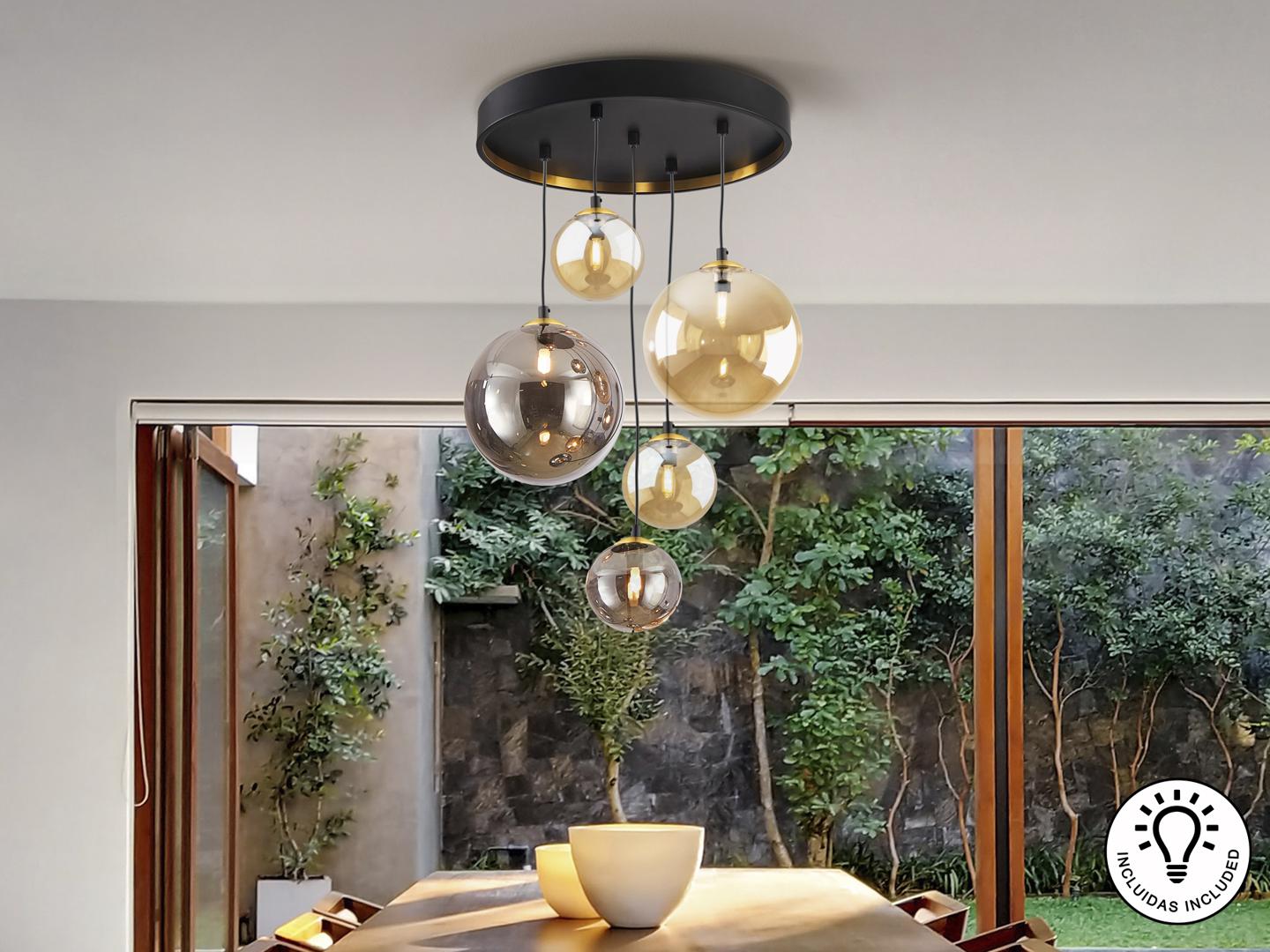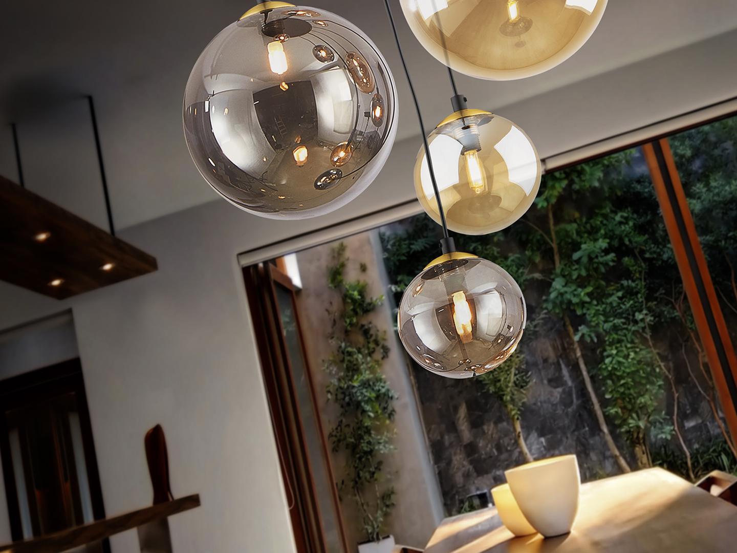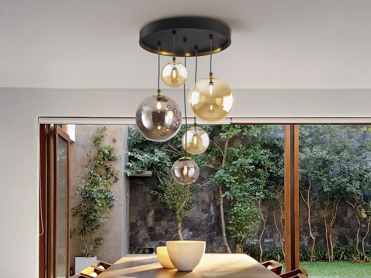 Светильник из 5 лампочек из металла черного матового цвета с деталями из сатинированной латуни. Сферические стеклянные плафоны диаметром 12 и 20 см с янтарной и блестящей дымчато-серой отделкой. Регулируется по высоте. ·В комплект поставки входят 5 светодиодов G9 мощностью 4 Вт. Эта лампа поставляется с гравитационными переключателями для улучшения крепления к потолку.