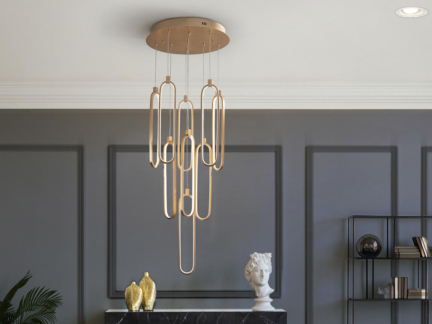 Светодиодная лампа с 9 лампами из матового алюминия с отделкой из розового золота. Регулируемая по высоте. Опаловые силиконовые рассеиватели. Светодиод 117 Вт, 5600 лм, 3000 К. С РЕГУЛИРОВКОЙ РЕГУЛЯЦИИ Этот продукт включает в себя светодиодные драйверы с триаком и диммером 0–10 В. Вы можете регулировать яркость этого изделия с помощью настенного симисторного переключателя или диммера 0–10 В. Любой другой тип диммера может повредить светодиодный драйвер. · Эта лампа поставляется с ГРАВИТАЦИОННЫМИ ПЕРЕКЛЮЧАТЕЛЯМИ для улучшения крепления к потолку
