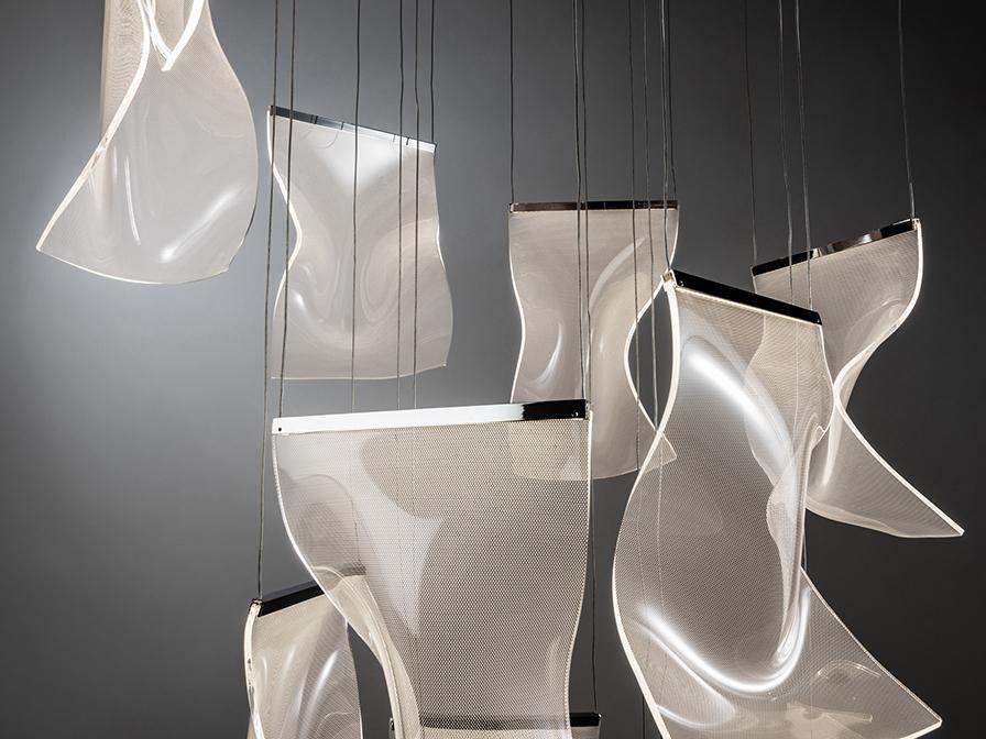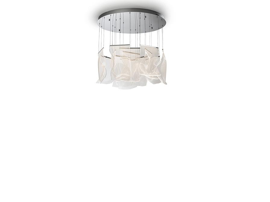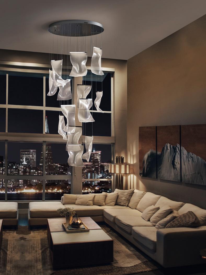 Светильник изготовлен из хромированного металла и абажуров из формованного метакрилата с микропечатью. Светодиодное освещение. ДИММИРУЕМАЯ. 63 Вт 3780 лм 3000К. Драйвер TRIAC и НАБОР DIMMING SET включены. Этот продукт включает в себя светодиодные драйверы с триаком и регулировкой яркости 0–10 В. В комплект входит комплект затемнения с приемником и радиочастотным пультом дистанционного управления. Его также можно использовать с симисторным или настенным диммером 0–10 В. · Эта лампа поставляется с ГРАВИТАЦИОННЫМИ ПЕРЕКЛЮЧАТЕЛЯМИ для улучшения крепления к потолку.