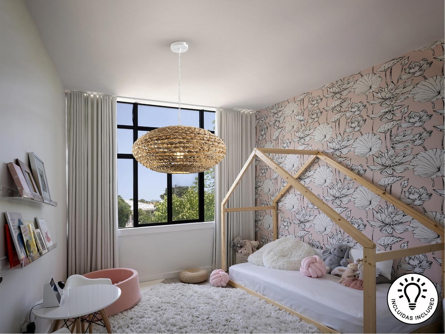 Большой светильник на 1 лампу, выполнен из металла белого цвета. Абажур из ротангового волокна и плетеный водный гиацинт с натуральной отделкой. ·В комплект поставки входит 1 светодиод E27 мощностью 10 Вт. Эта лампа поставляется с гравитационными переключателями для улучшения крепления к потолку.