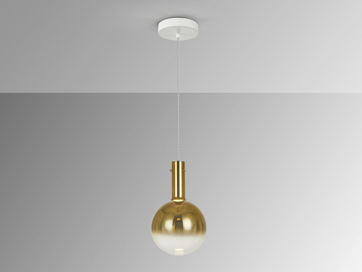 Светильник выполнен из металла, матового белого цвета. Абажур из дутого стекла Ø20 см, цвет мерцающего золота. Регулируется по длине. Светодиод 4Вт, 340 лм, 3000К. · Эта лампа поставляется с ГРАВИТАЦИОННЫМИ ПЕРЕКЛЮЧАТЕЛЯМИ для улучшения крепления к потолку.