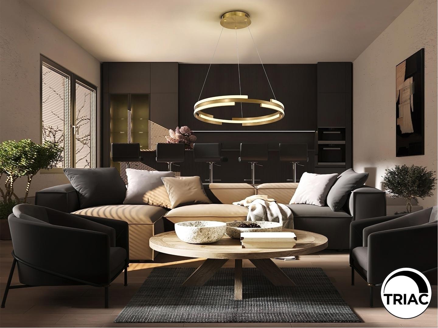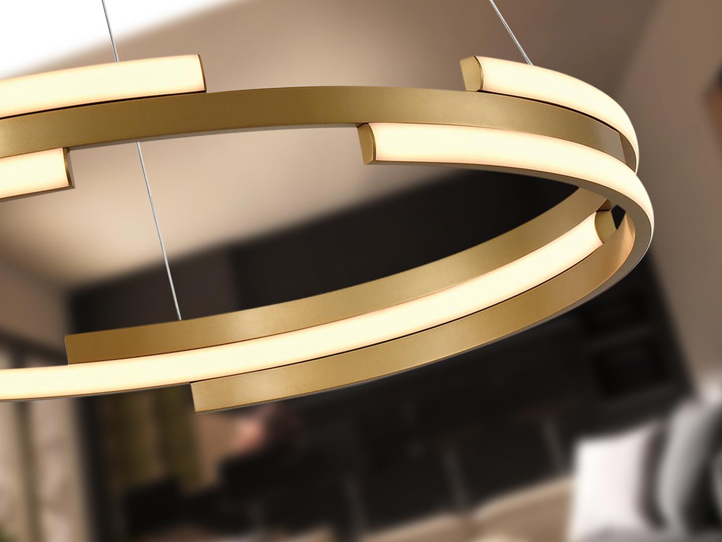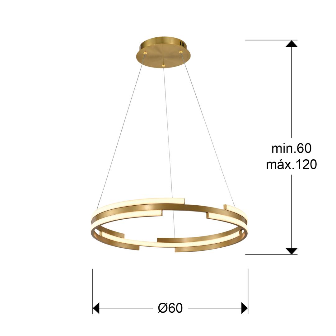 Светильник из металла и алюминия с золотой отделкой. Опаловый силиконовый рассеиватель. Светодиоды мощностью 52 Вт. 3800 лм. 3000К. ДИММИРУЕМАЯ. В этом продукте используется светодиодный драйвер симисторного типа и регулировка яркости 0–10 В. Его можно затемнить с помощью светодиодного настенного диммера с этими функциями. · Эта лампа поставляется с ГРАВИТАЦИОННЫМИ ПЕРЕКЛЮЧАТЕЛЯМИ для улучшения крепления к потолку.