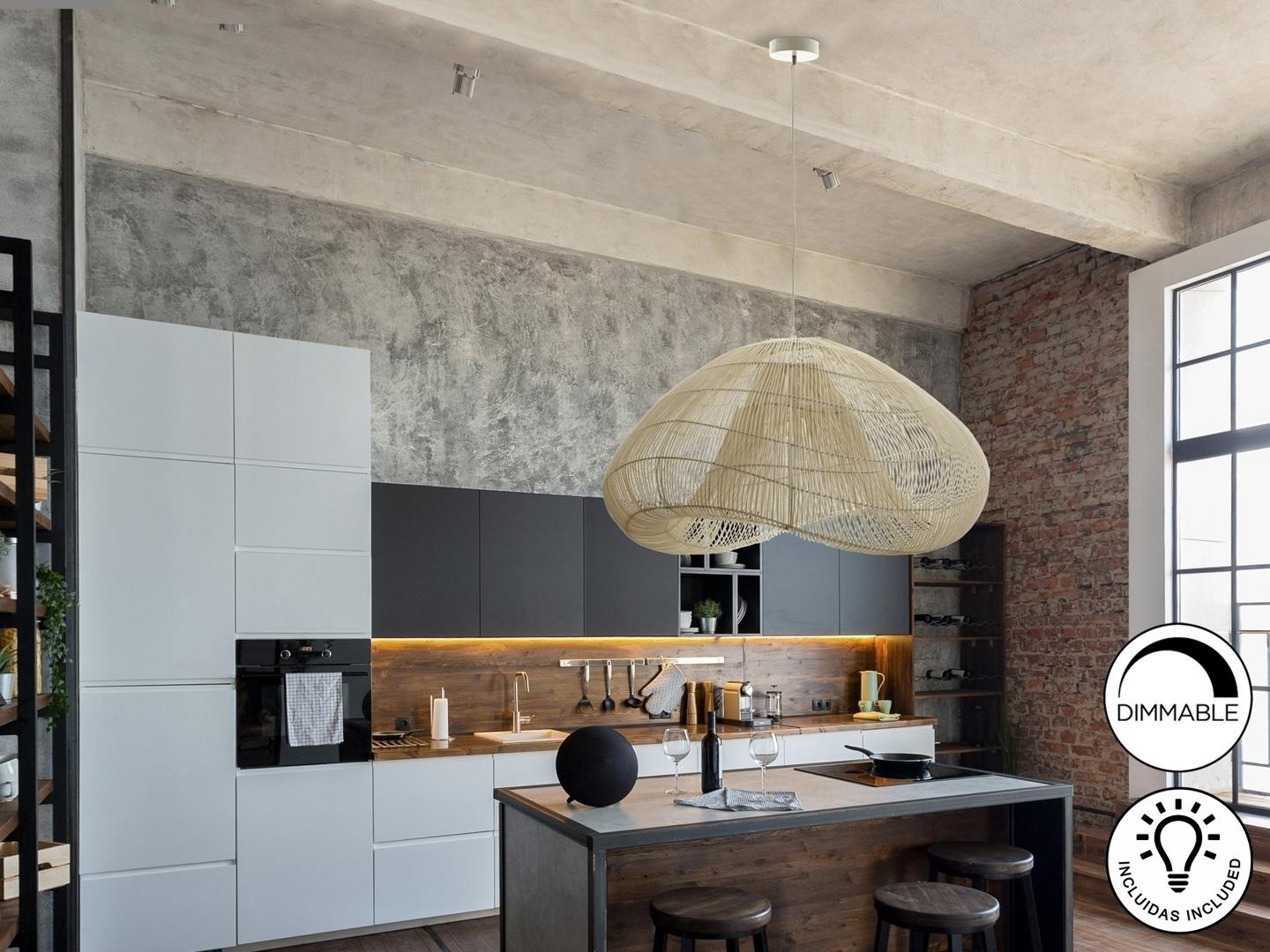 Светильник на 1 лампу из металла, белая отделка. Абажур из ротанга, белая патинированная отделка. ·В комплект входит 1 светодиод E27 мощностью 8 Вт. ДИМАБЕЛЬ Эта лампа поставляется с ГРАВИТАЦИОННЫМИ ПЕРЕКЛЮЧАТЕЛАМИ для улучшения крепления к потолку.