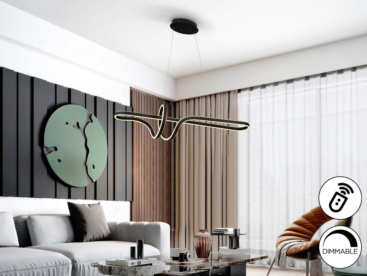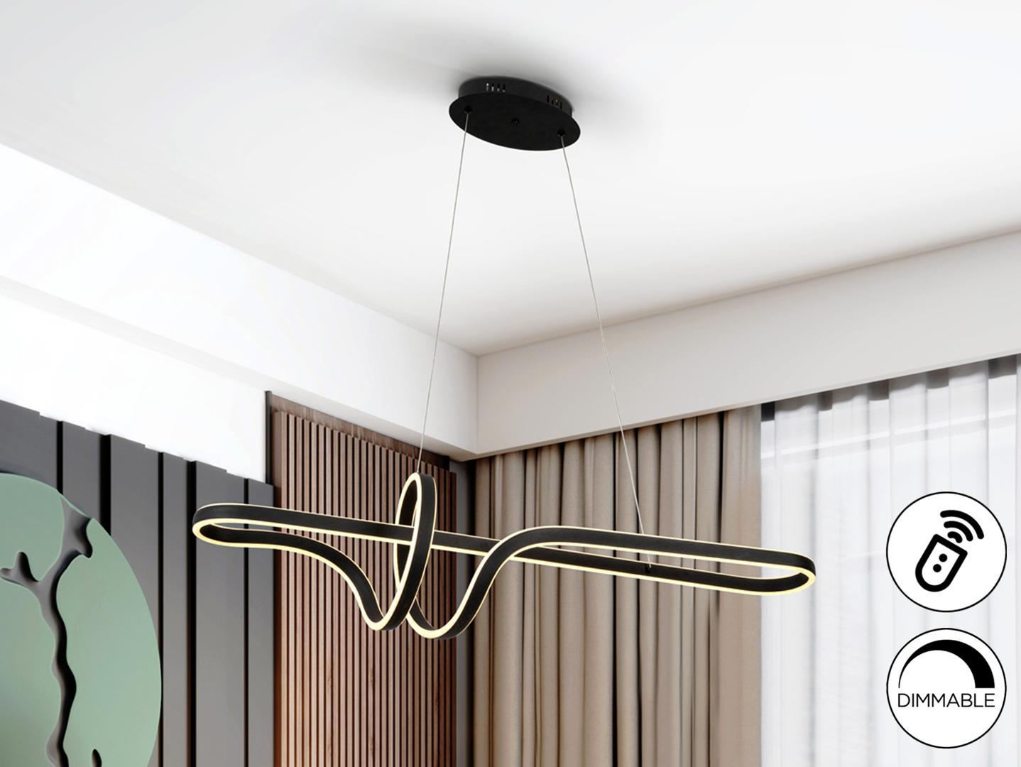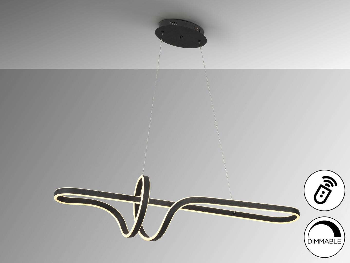 Лампа со светодиодной подсветкой, регулировкой яркости и изменением цвета CCT. Изготовлена из стали и алюминия, матово-черная отделка. Рассеиватель из опалового силикона. Регулируется по высоте. Светодиодное освещение 55 Вт, 4700 лм, 2700-5500 К. В комплект входит пульт дистанционного управления. В этом изделии используется диммер и инфракрасный пульт дистанционного управления для регулировки интенсивности и цветовой температуры. · Эта лампа оснащена ГРАВИТАЦИОННЫМИ ПЕРЕКЛЮЧАТЕЛЯМИ для улучшения фиксации на потолке.