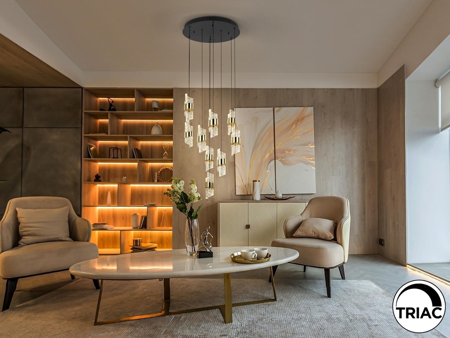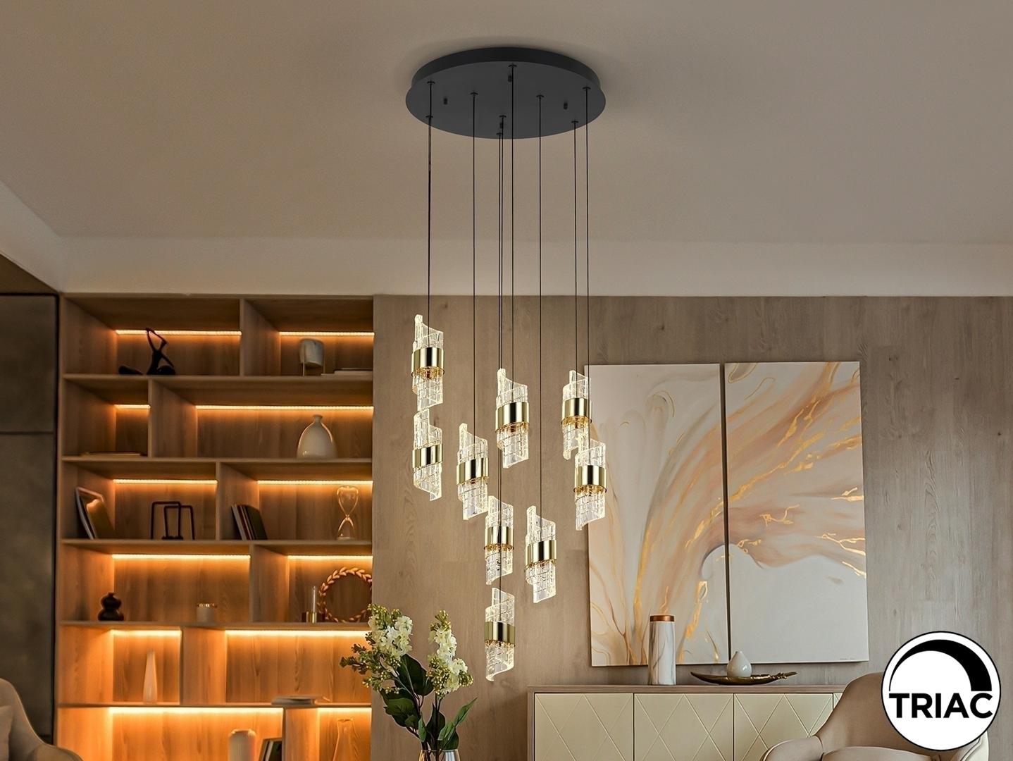 Лампа с 9 светодиодами. Изготовлена из металла с матово-черной и ярко-золотой отделкой. Абажуры со спиральным дизайном из формованного и резного акрила. Регулируемая высота. Светодиоды 63 Вт. 5537 лм. 3000 К. С РЕГУЛИРУЕМОЙ ЯРКОСТЬЮ В этом продукте используется светодиодный драйвер с симисторным типом и регулировкой яркости 0-10 В. Яркость можно регулировать с помощью настенного светодиодного диммера с этими функциями. · Эта лампа поставляется с ГРАВИТАЦИОННЫМИ ПЕРЕКЛЮЧАТЕЛЯМИ для улучшения фиксации на потолке.