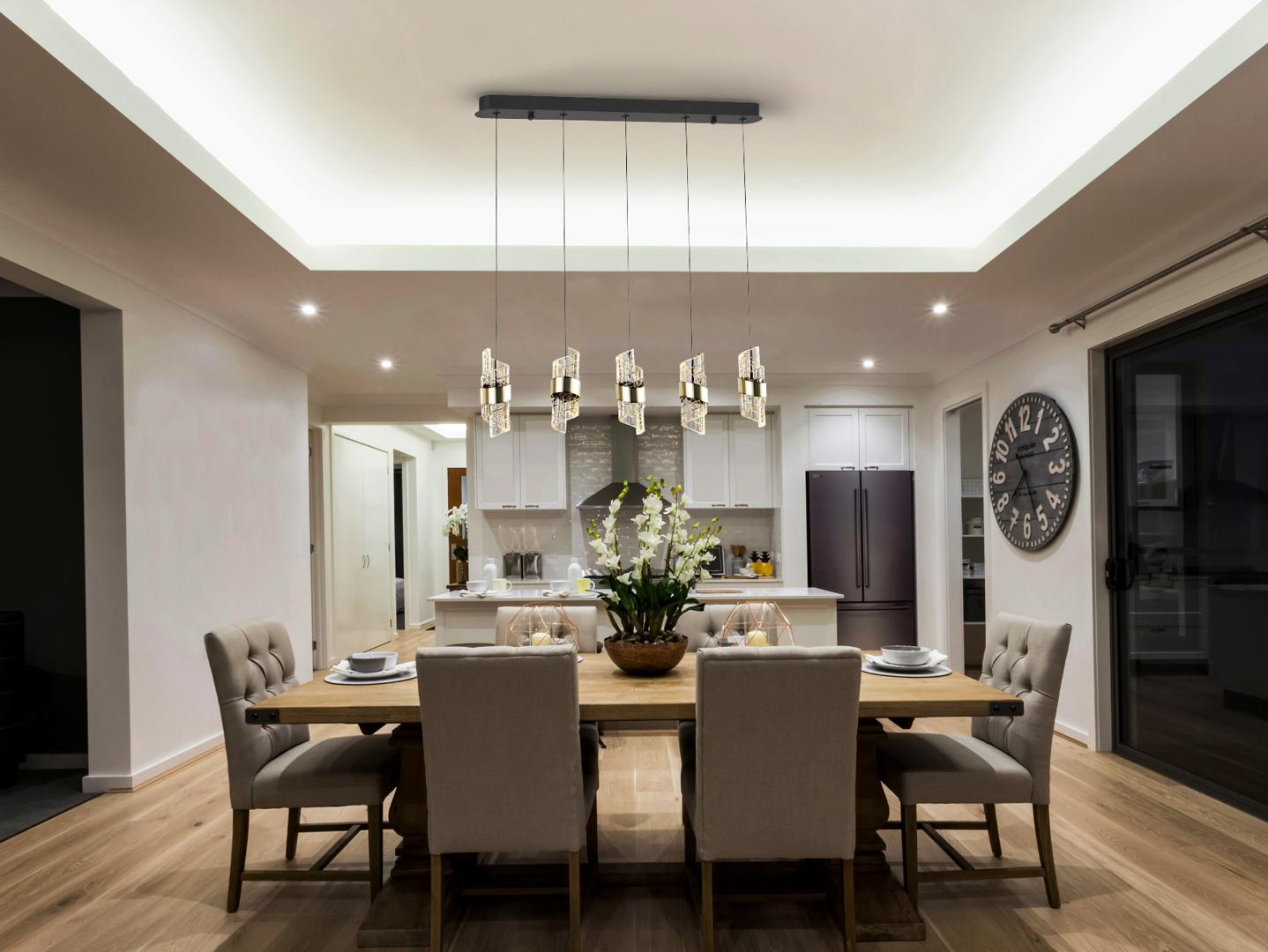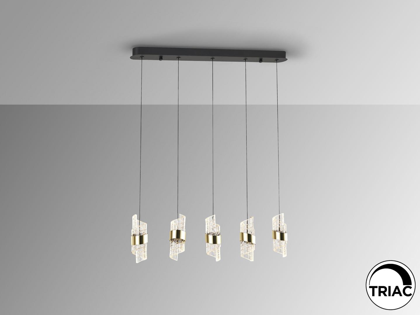 Лампа с 5 светодиодами. Изготовлена из металла с матово-черной и ярко-золотой отделкой. Абажуры со спиральным дизайном из формованного и резного акрила. Регулируемая высота. Светодиоды 35 Вт. 3220 лм. 3000 К. С РЕГУЛИРОВКОЙ ЯРКОСТИ В этом продукте используется светодиодный драйвер с симисторным типом и регулировкой яркости 0-10 В. Яркость можно регулировать с помощью настенного светодиодного диммера с этими функциями. · Эта лампа поставляется с ГРАВИТАЦИОННЫМИ ПЕРЕКЛЮЧАТЕЛЯМИ для улучшения фиксации на потолке.