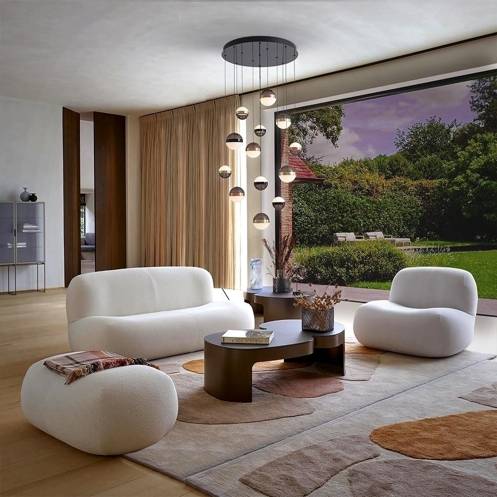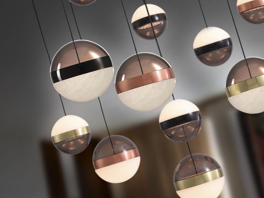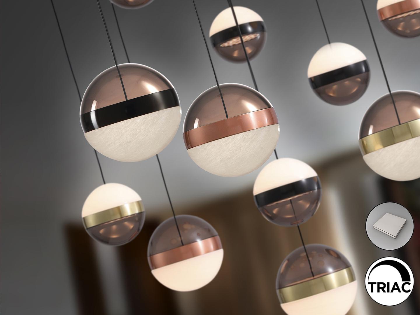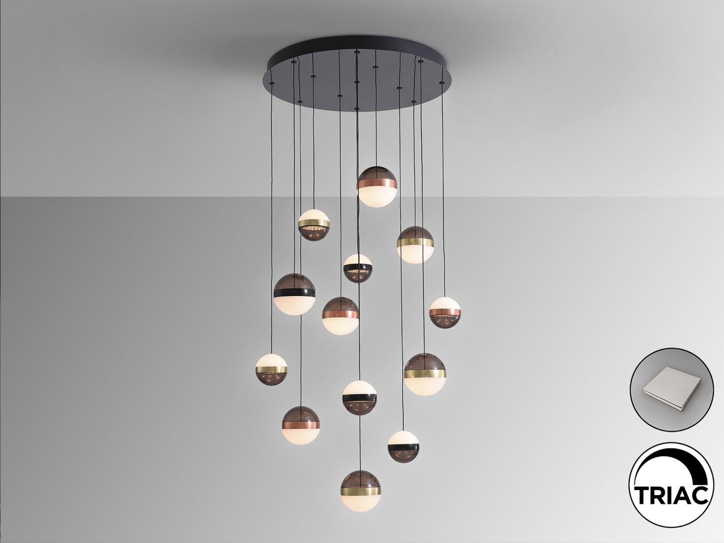 Лампа из 13 светодиодных лампочек, металлическая, черного цвета. Абажуры Ø12 и 15 см из дымчатого поликарбоната и мраморного стекла. Металлические кольца из меди, сатинированной латуни и черного хрома. РЕГУЛИРУЕМАЯ ЯРКОСТЬ. Светодиод 108 Вт. 3000 К. 5030 лм. В комплект входят драйвер TRIAC и НАБОР РЕГУЛИРОВКИ. В этом изделии используется светодиодный драйвер с симистором и регулировкой яркости 0–10 В, в комплект входит набор диммера с диммером и радиочастотным пультом дистанционного управления, или его можно регулировать с помощью симистора или настенного диммера 0–10 В. · Эта лампа поставляется с ГРАВИТАЦИОННЫМИ ПЕРЕКЛЮЧАТЕЛЯМИ для улучшения крепления к потолку.