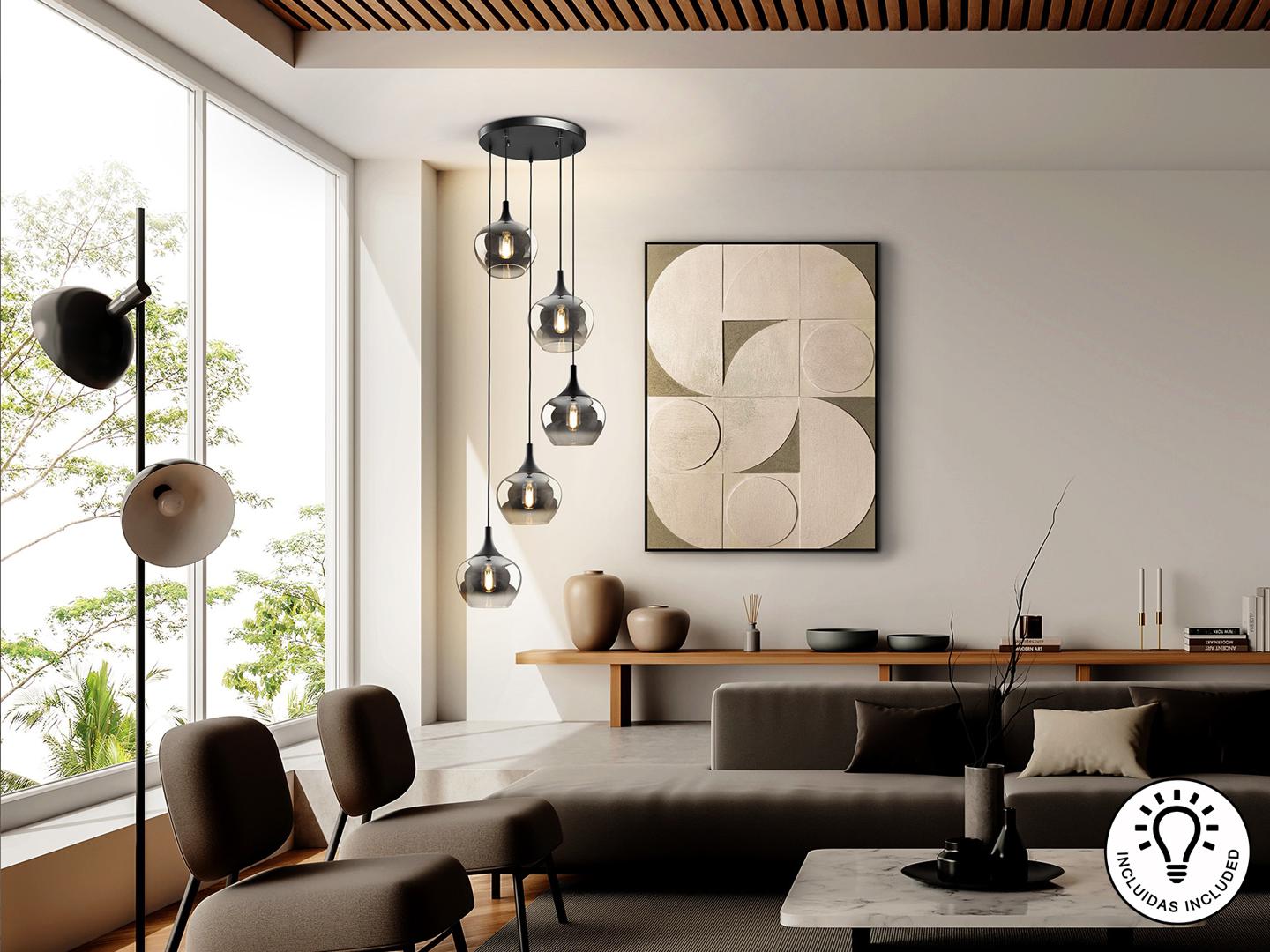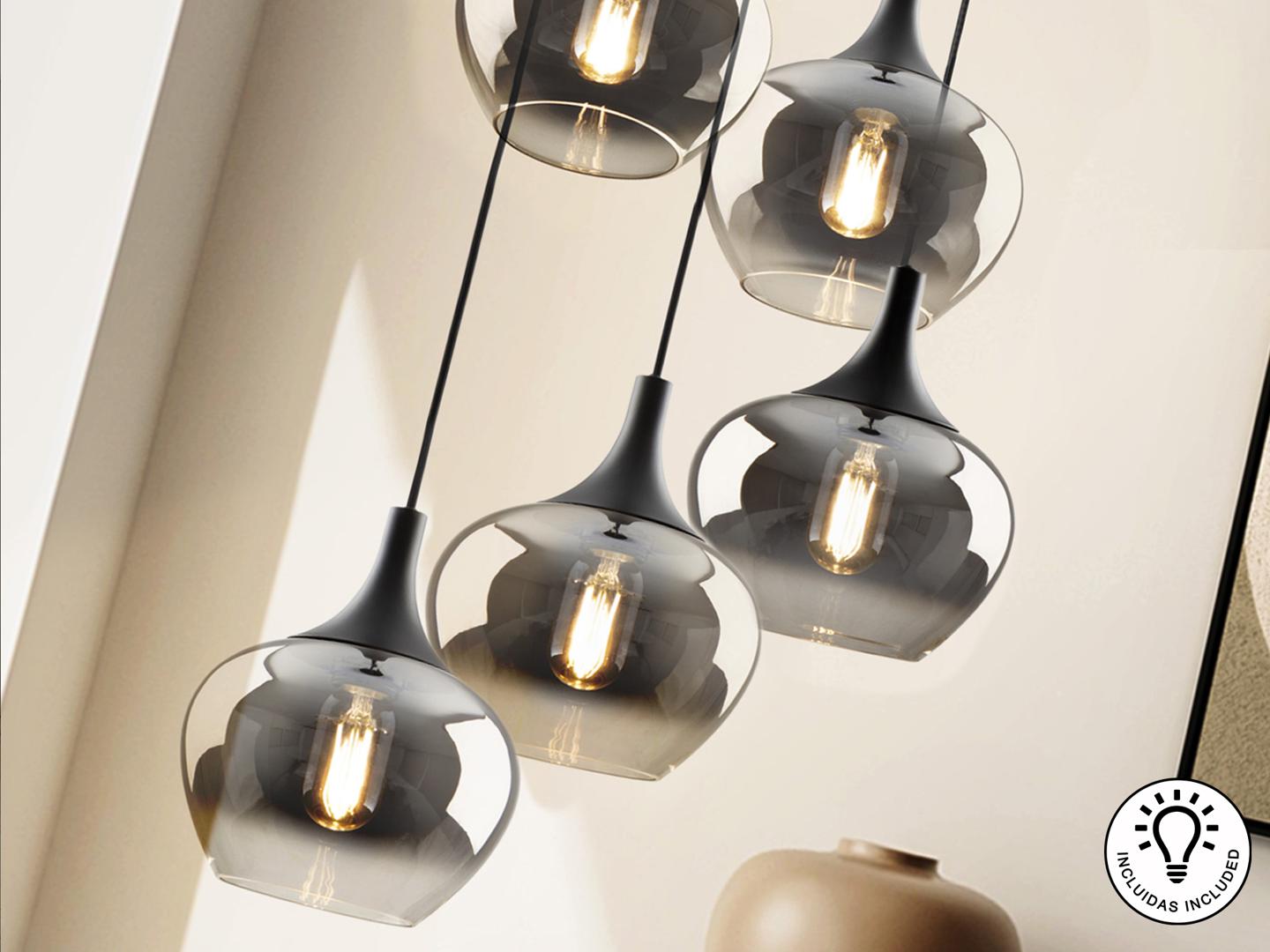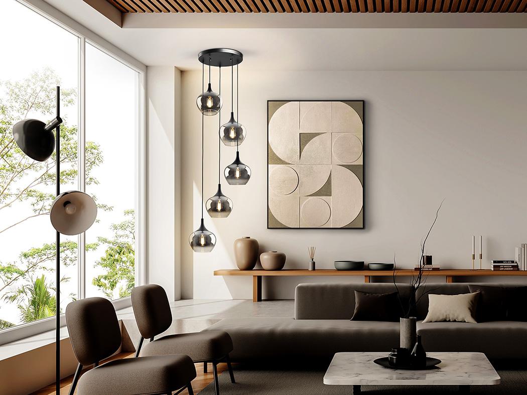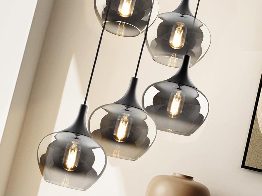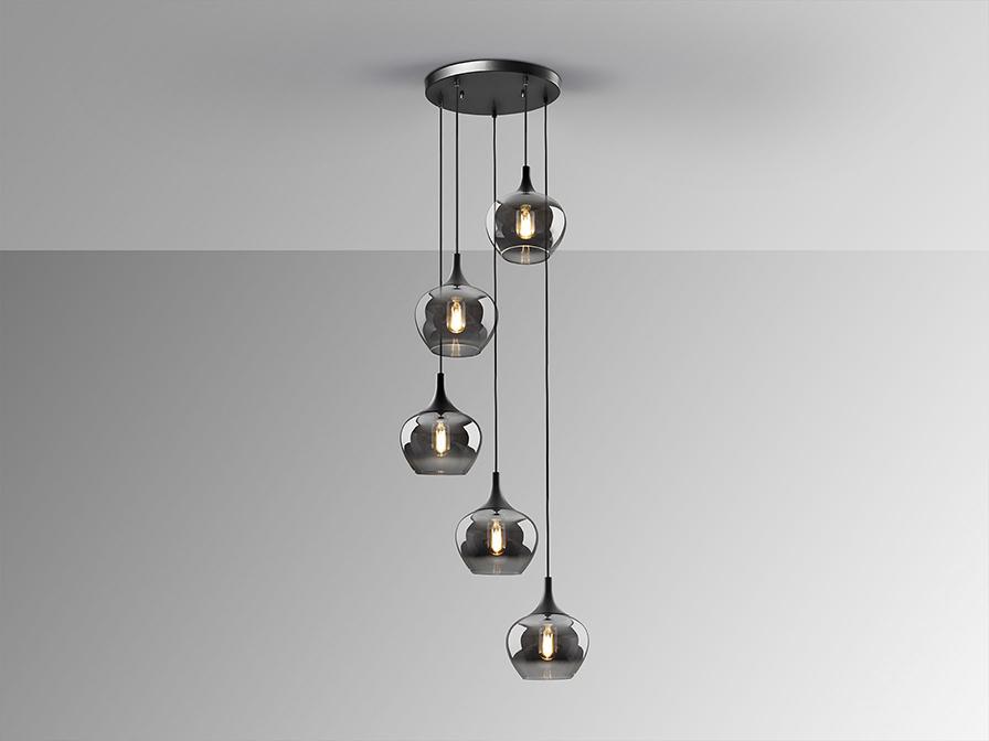 Лампа на 5 ламп, металлическая, матово-черная отделка. Абажур из деградированного дымчатого стекла диаметром 19 см. Регулируемая высота. ·В комплект поставки входят 5 светодиодов E27 мощностью 8 Вт. РЕГУЛИРУЕМАЯ ЯРКОСТЬ. Эта лампа оснащена ГРАВИТАЦИОННЫМИ ПЕРЕКЛЮЧАТЕЛЯМИ для улучшения фиксации на потолке.