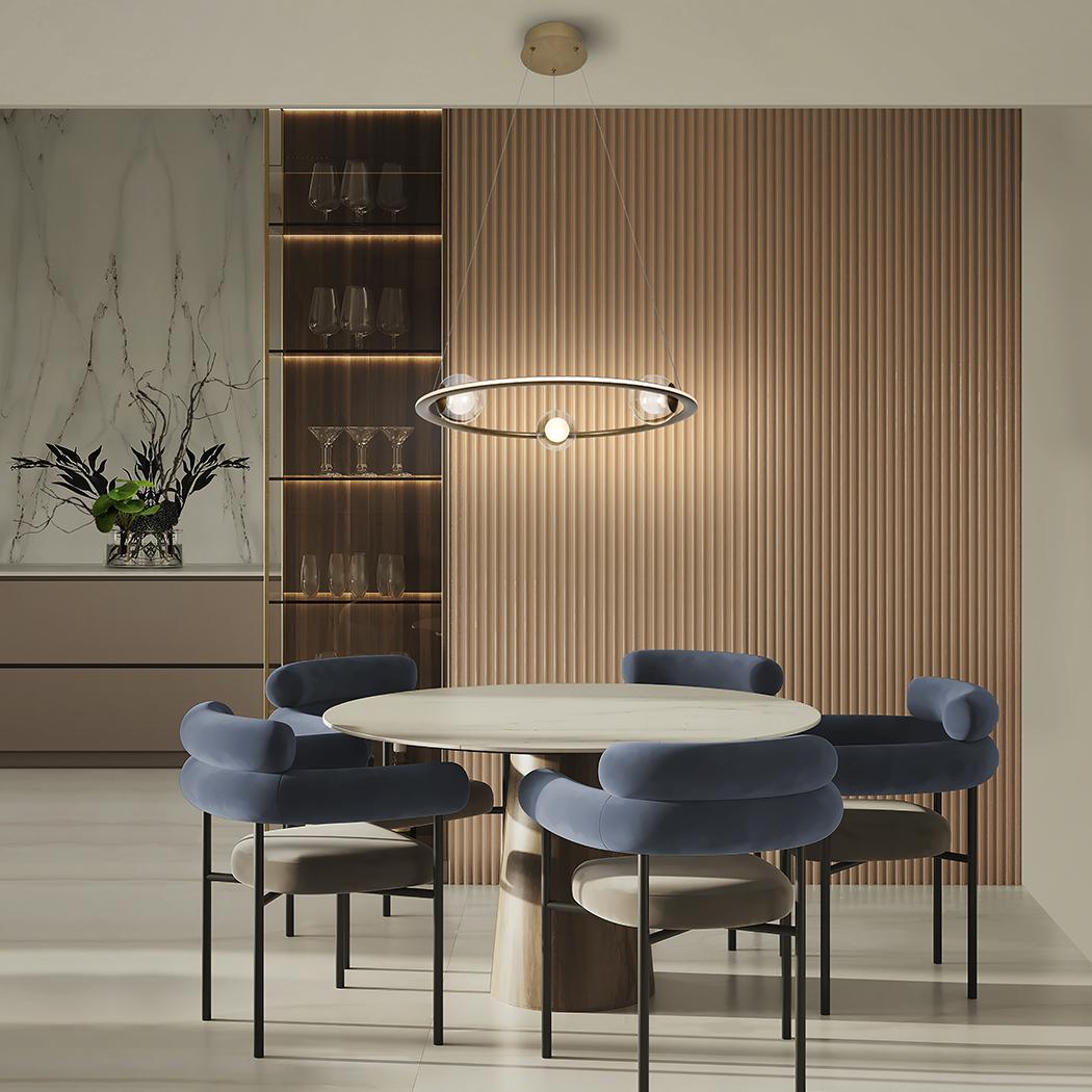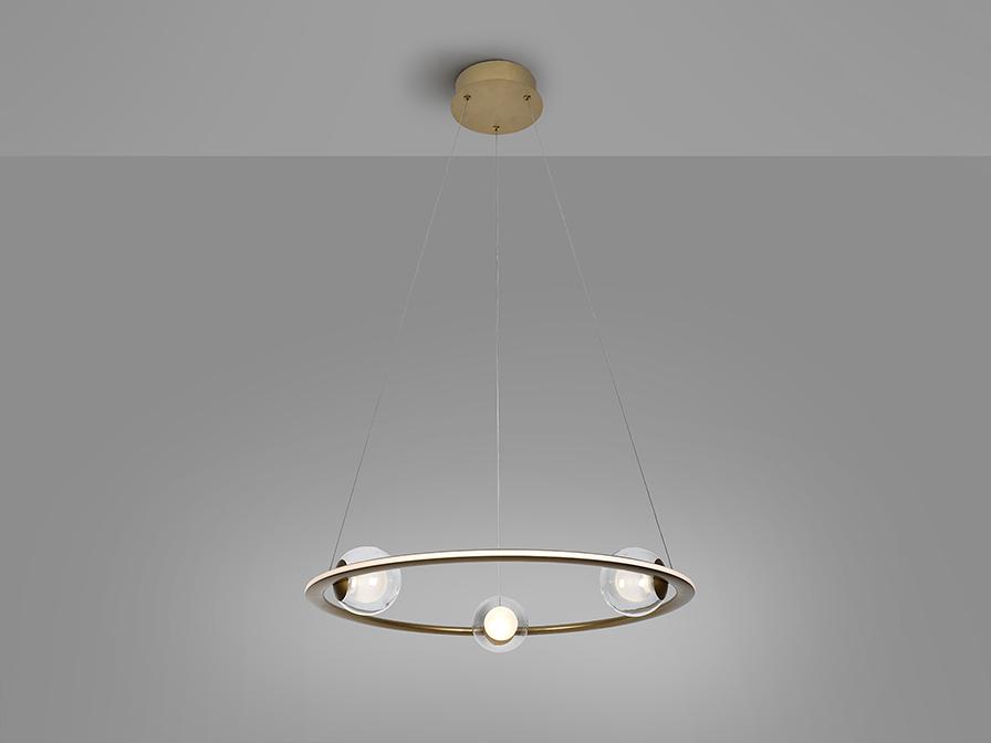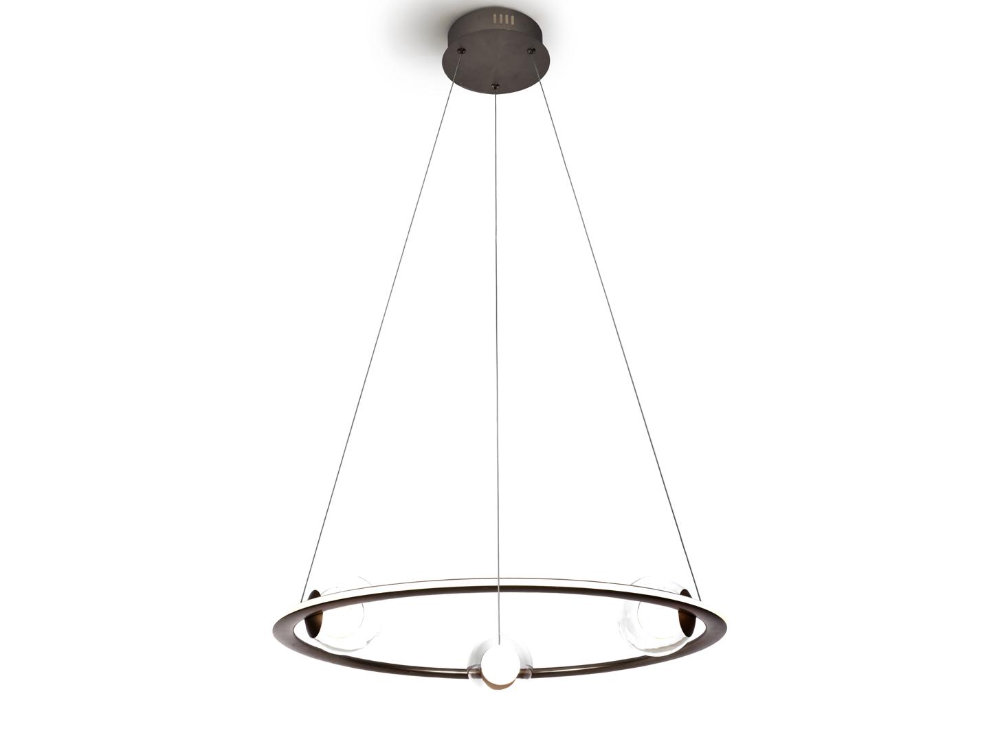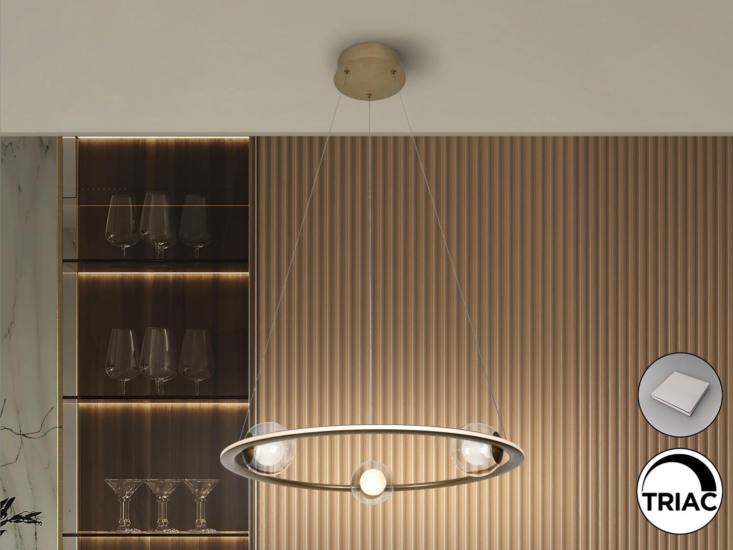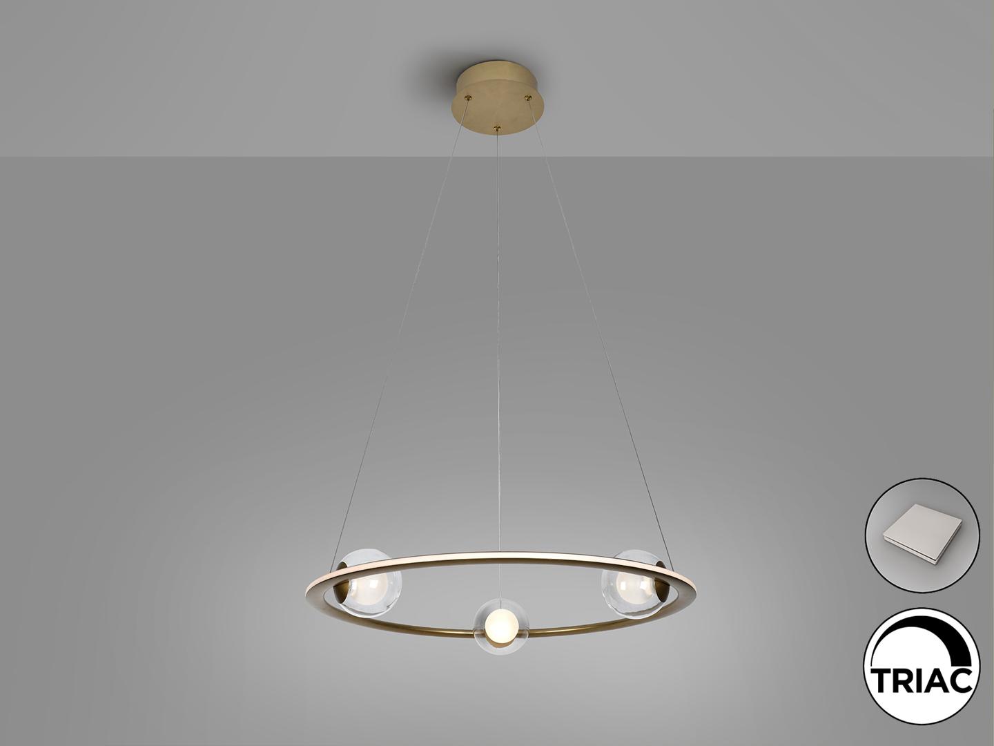Светильник из стали и матового алюминия, отделка из анодированной бронзы. Три стеклянных сферы, внутренняя часть опаловая, внешняя — прозрачная. Рассеиватель из опалового силикона. РЕГУЛИРУЕМАЯ ЯРКОСТЬ, светодиод 40 Вт, 2700 лм, 3000 К. В комплект входят драйвер TRIAC и НАБОР РЕГУЛИРОВКИ. В этом изделии используется светодиодный драйвер с симистором и регулировкой яркости 0–10 В, в комплект входит набор диммера с диммером и радиочастотным пультом дистанционного управления, или его можно регулировать с помощью симистора или настенного диммера 0–10 В. · Эта лампа поставляется с ГРАВИТАЦИОННЫМИ ПЕРЕКЛЮЧАТЕЛЯМИ для улучшения крепления к потолку.