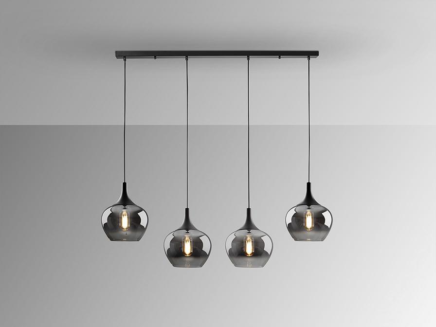 Лампа на 4 лампы, металл, матово-черная отделка. Абажур из деградированного дымчатого стекла диаметром 19 см. Регулируемая высота. ·В комплект поставки входят 4 светодиода E27 мощностью 8 Вт. РЕГУЛИРУЕМАЯ ЯРКОСТЬ. Эта лампа оснащена ГРАВИТАЦИОННЫМИ ПЕРЕКЛЮЧАТЕЛЯМИ для улучшения фиксации на потолке.