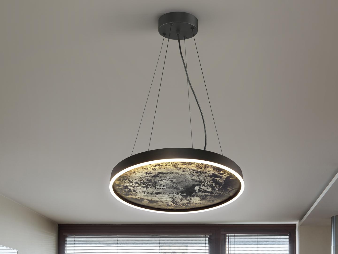 Лампа из металла, черная отделка. Рассеиватель из полупрозрачного многоцветного сланца и опаловое акриловое кольцо. Регулируется по высоте. Светодиодная лампа 60+35 Вт, 1354 лм, смена цвета CCT, 3000/4000/6000 К. Выбор цветовой температуры CCT осуществляется с настенного переключателя последовательными нажатиями клавиш. Включена функция памяти. · Эта лампа поставляется с ГРАВИТАЦИОННЫМИ ПЕРЕКЛЮЧАТЕЛЯМИ для улучшения фиксации на потолке.