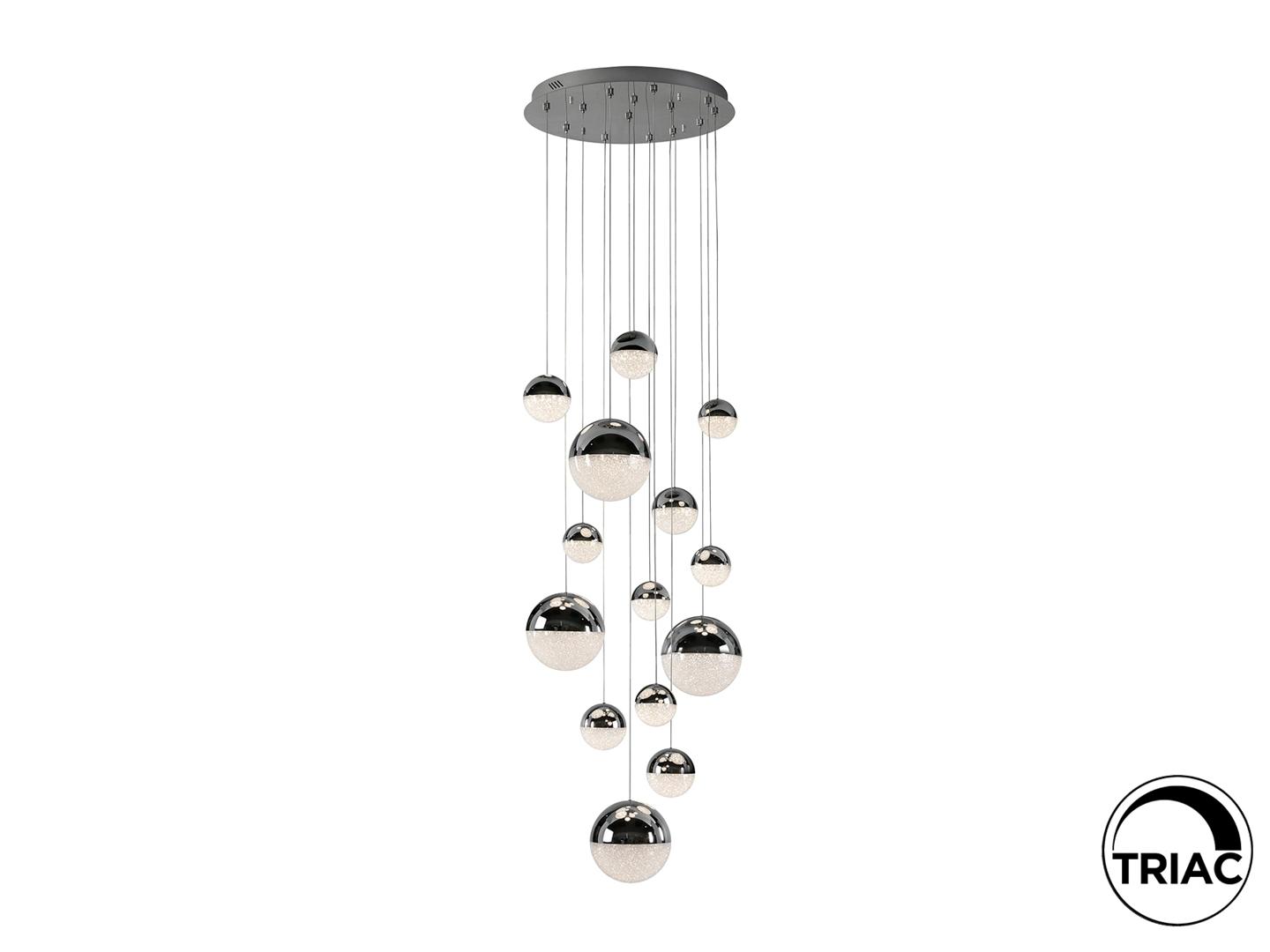 Подвесной светильник с 14 лампами LED, из хромированного металла. Шарообразные плафоны Ø10, 12, 20 из фактурного внутри поликарбоната и металла с покрытием "хром". С регулируемой высотой, макс.высота 500 см. 78,6W LED, 5502 Lm, 3000 K. Диммируемый.