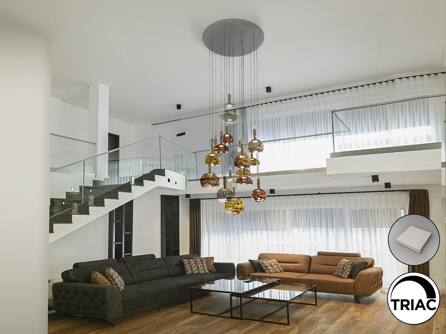 Лампа на 16 ламп, изготовлена из матового алюминия, окрашенного в темно-серый тон. Абажуры из электролитического стекла в медных, золотистых, серебряных и прозрачных тонах, со светодиодной подсветкой и рассеивателем из опалового акрила. Светодиод 96 Вт, 3520 лм, 3000 К. РЕГУЛИРУЕМАЯ ЯРКОСТЬ. Драйвер TRIAC y D В этом изделии используется светодиодный драйвер с симистором и регулировкой яркости 0–10 В, в комплект входит набор диммера с диммером и радиочастотным пультом дистанционного управления, или его можно регулировать с помощью симистора или настенного диммера 0–10 В. · Эта лампа поставляется с ГРАВИТАЦИОННЫМИ ПЕРЕКЛЮЧАТЕЛЯМИ для улучшения крепления к потолку.