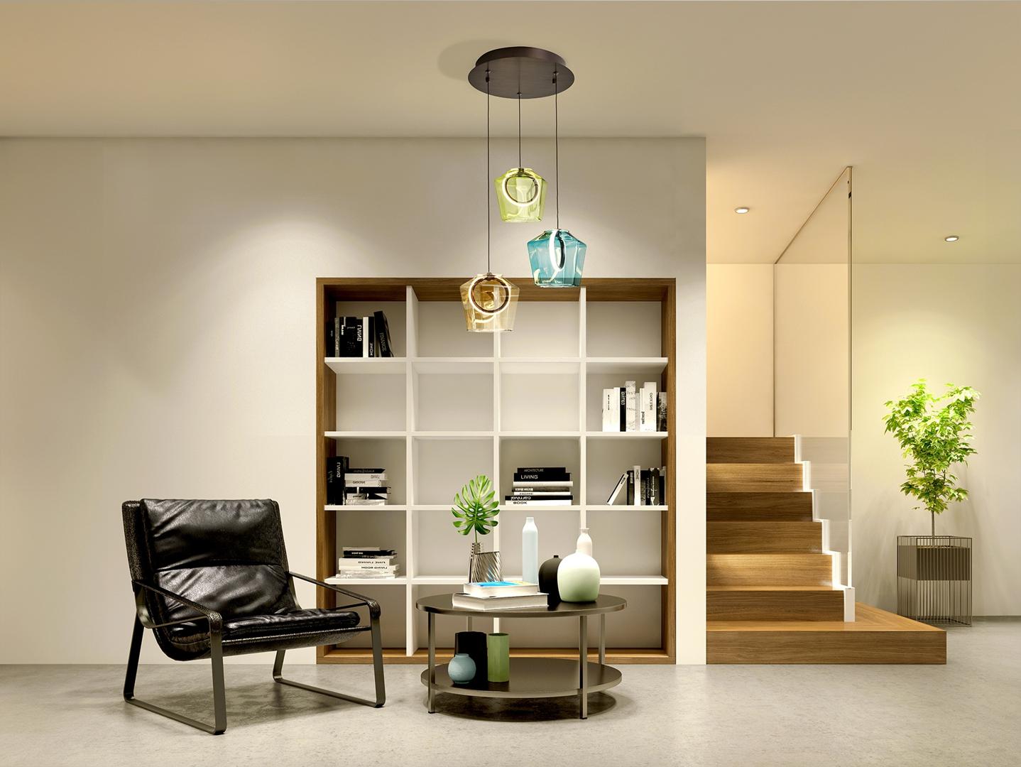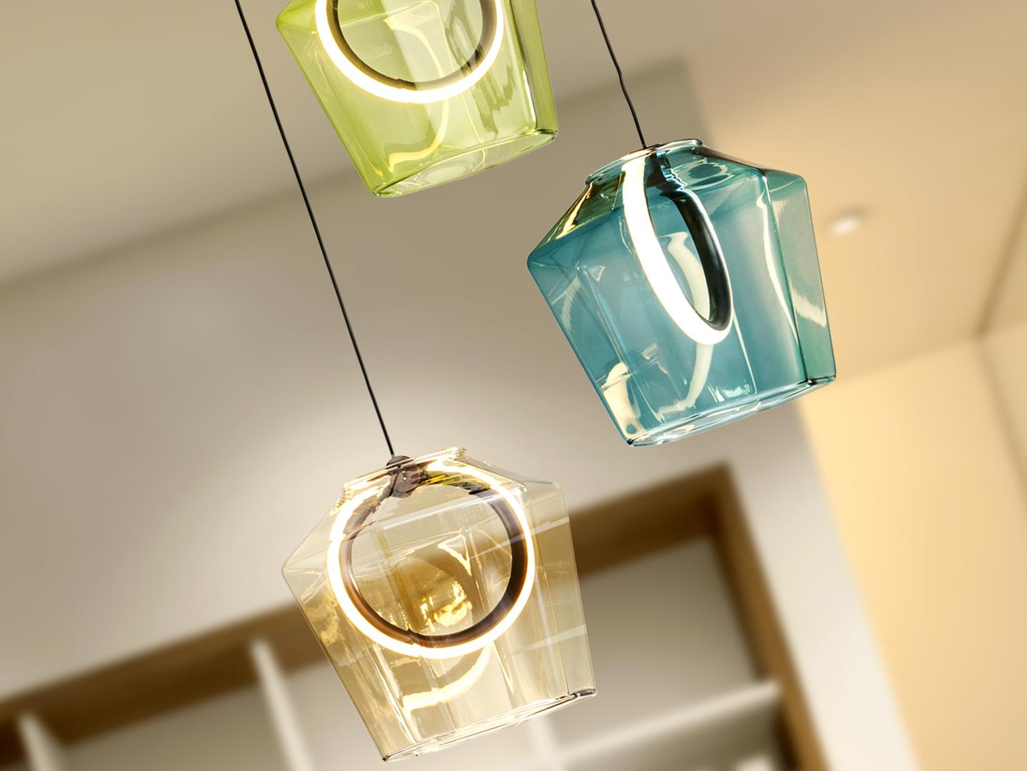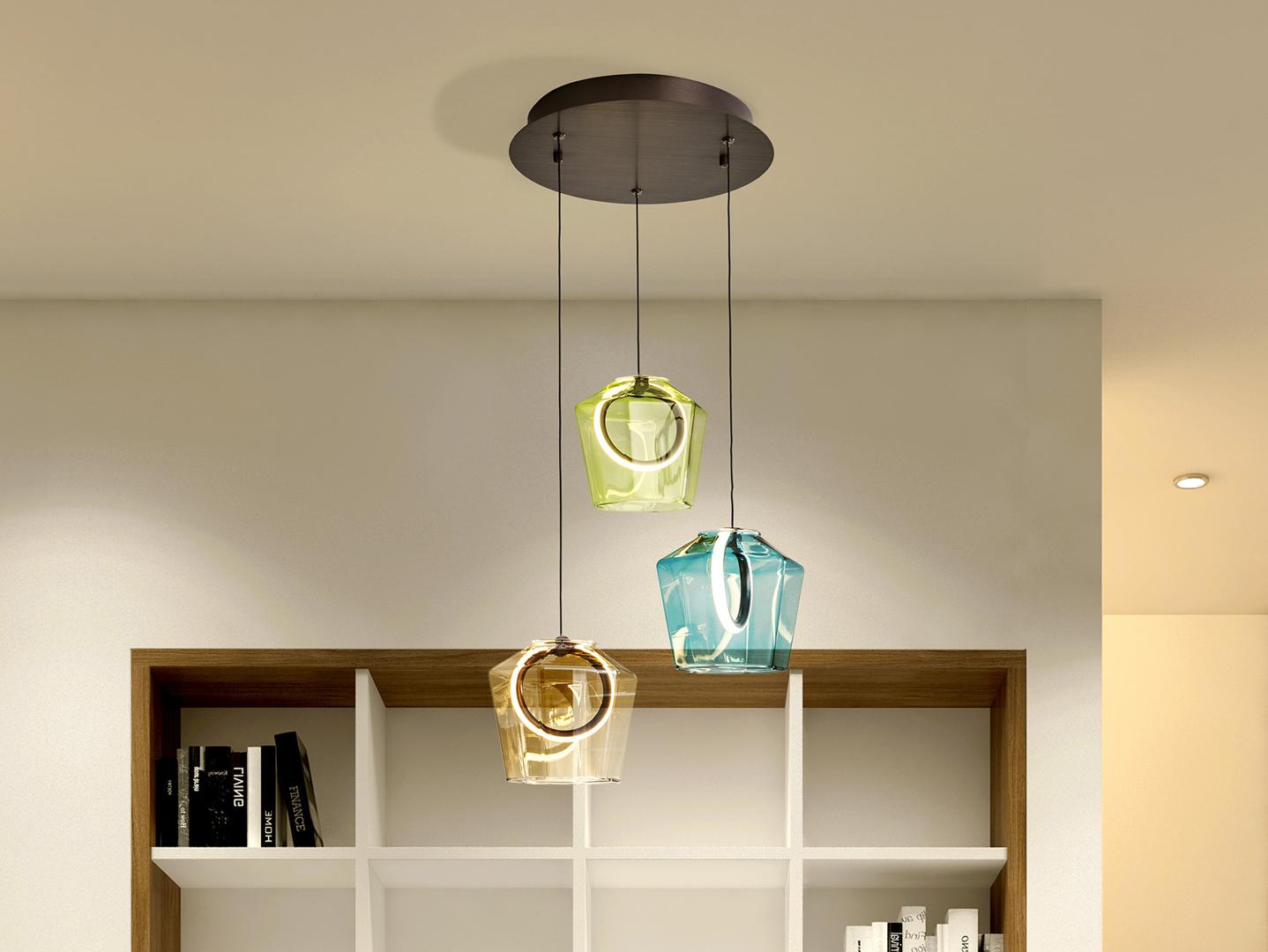 Лампа на 3 лампы, изготовлена из матового алюминия, покрытого темно-бронзовым тоном. Тонированные стеклянные плафоны в оттенках шампанского, зеленого и синего, с внутренним светодиодным кольцом и силиконовым рассеивателем. Светодиод 18 Вт, 483 лм, 3000 К · Эта лампа оснащена ГРАВИТАЦИОННЫМИ ПЕРЕКЛЮЧАТЕЛЯМИ для улучшения фиксации на потолке.