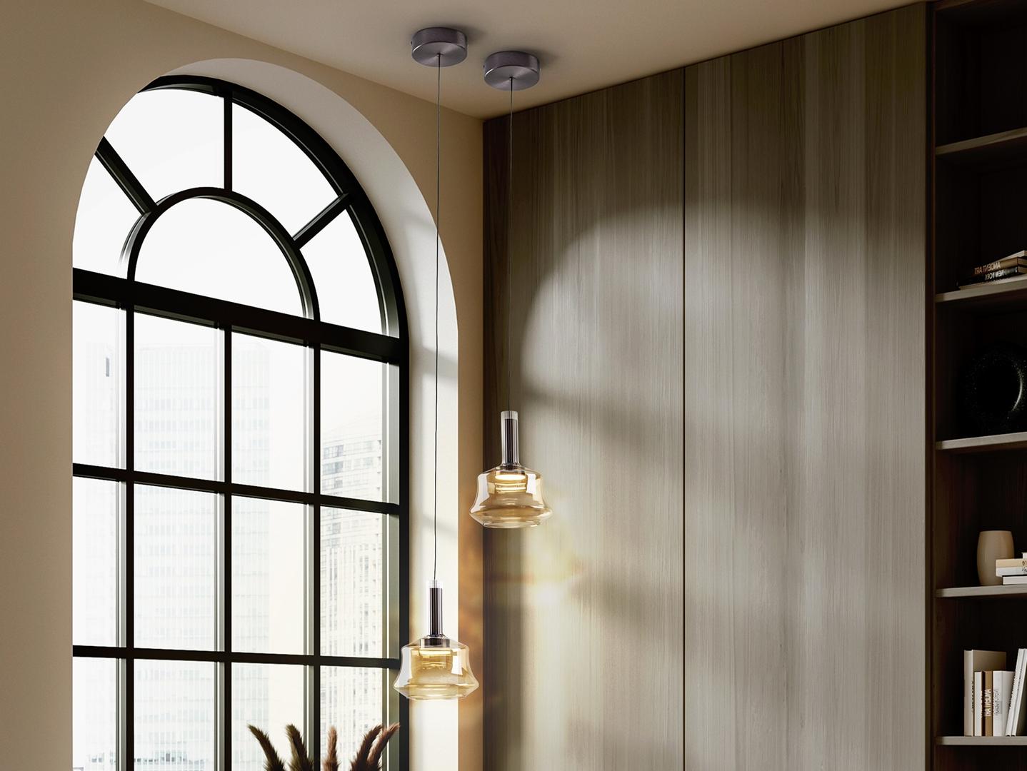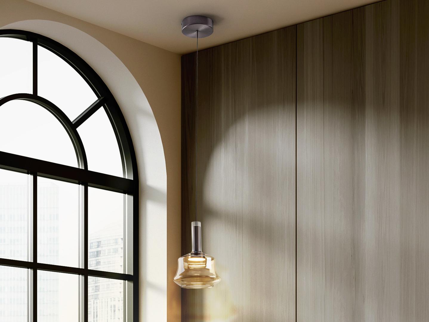 Лампа на 1 лампу, изготовлена из матового алюминия, отделанного в темный бронзовый тон. Абажур из электролизованного листового стекла в янтарном тоне, со светодиодной подсветкой и рассеивателем из опалового акрила. Светодиод 6 Вт, 190 лм, 3000 К · Эта лампа оснащена ГРАВИТАЦИОННЫМИ ПЕРЕКЛЮЧАТЕЛЯМИ для улучшения фиксации на потолке.