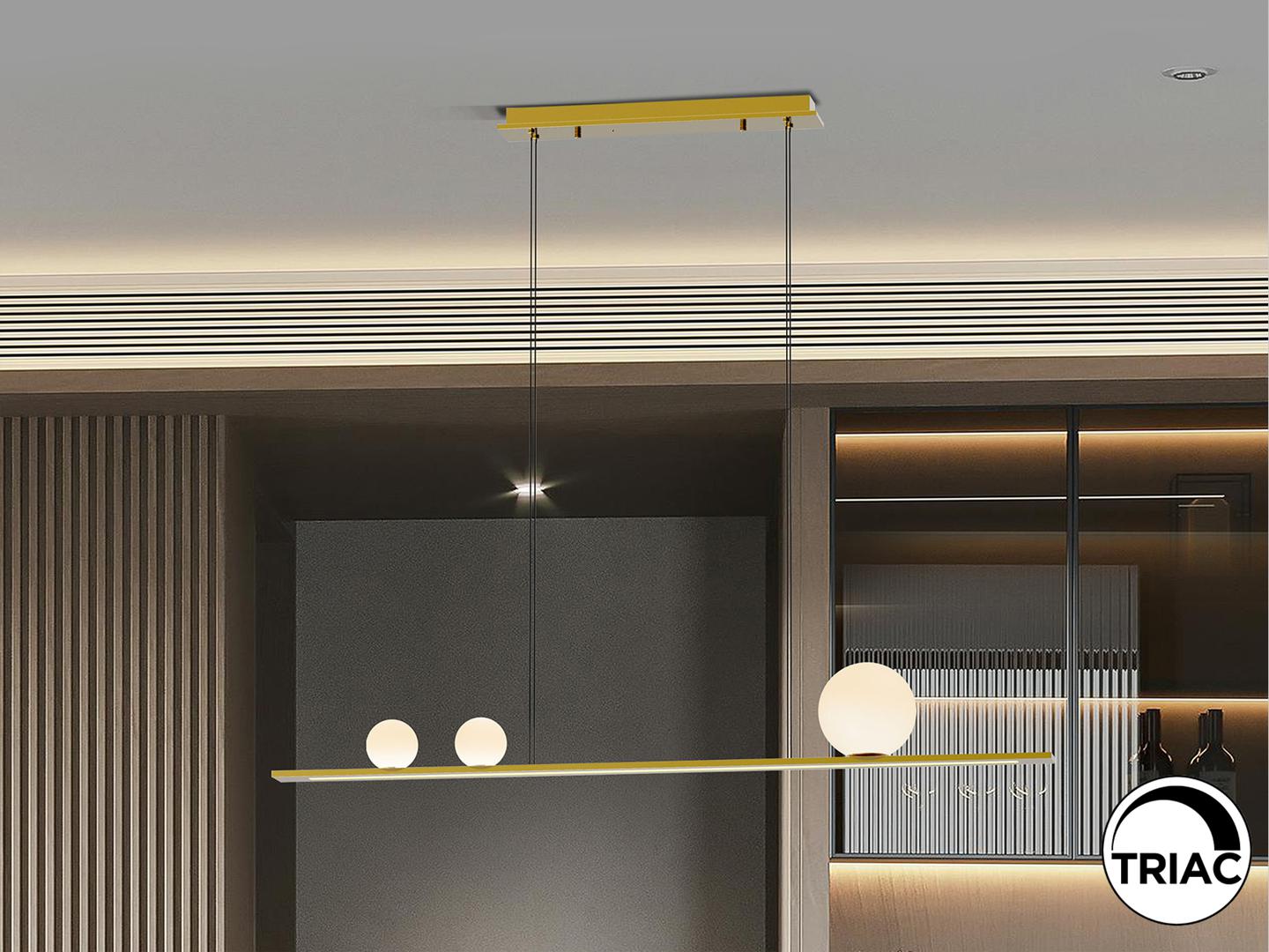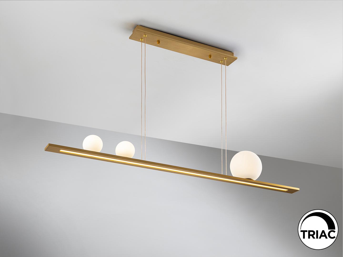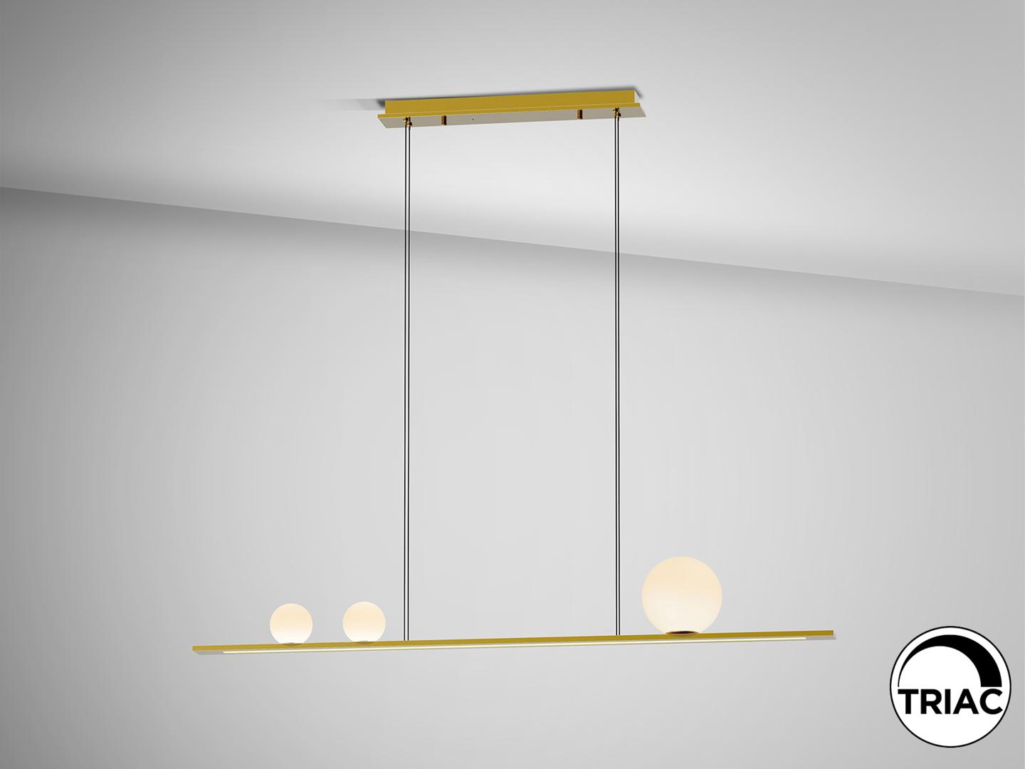 Светильник из матового алюминия с золотистой отделкой. 3 сферических стеклянных плафона в оттенках белого и нижний рассеиватель из опалового акрила. Светодиод 31 Вт, 1204 лм, 3000 К В этом продукте используется светодиодный драйвер с симисторным типом и регулировкой яркости 0-10 В. Яркость можно регулировать с помощью настенного светодиодного диммера с этими функциями. · Эта лампа поставляется с ГРАВИТАЦИОННЫМИ ПЕРЕКЛЮЧАТЕЛЯМИ для улучшения фиксации на потолке.