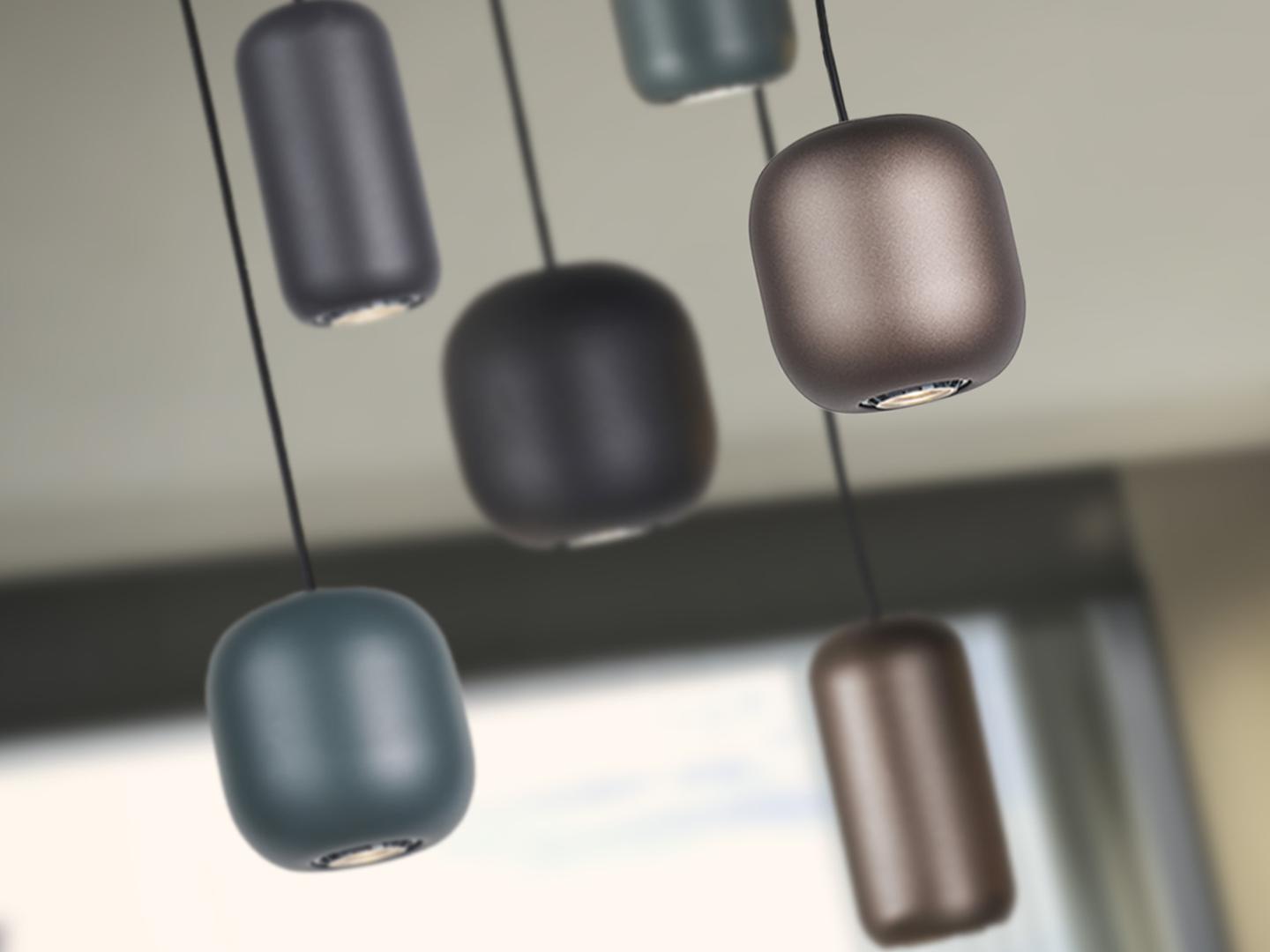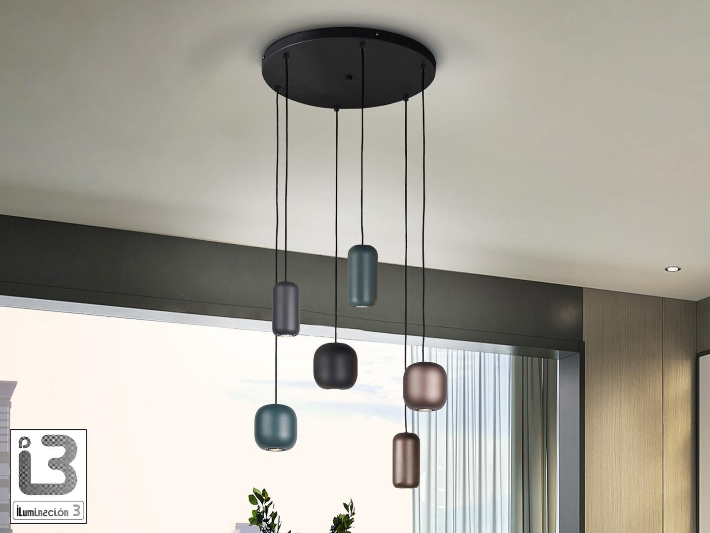 Лампа из металла, окрашенного в матовый чёрный цвет. 6 металлических плафонов в матовом чёрном, тёмно-коричневом и тёмно-зелёном цветах. Регулируется по высоте. Цоколи GU10.