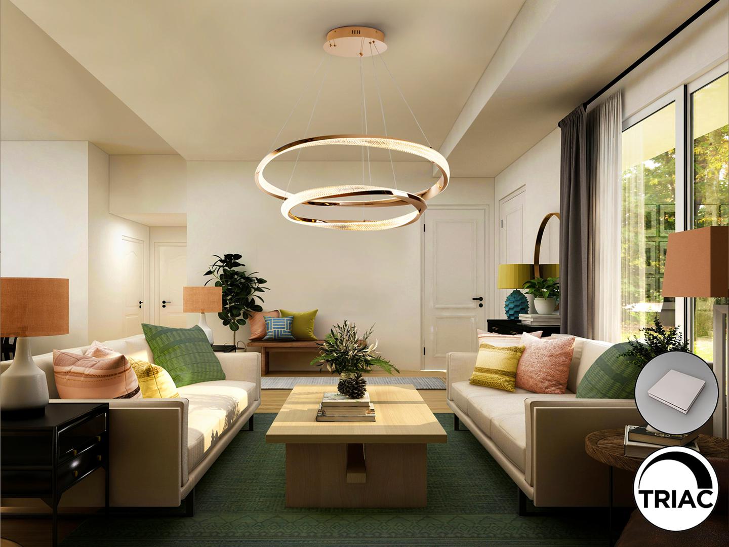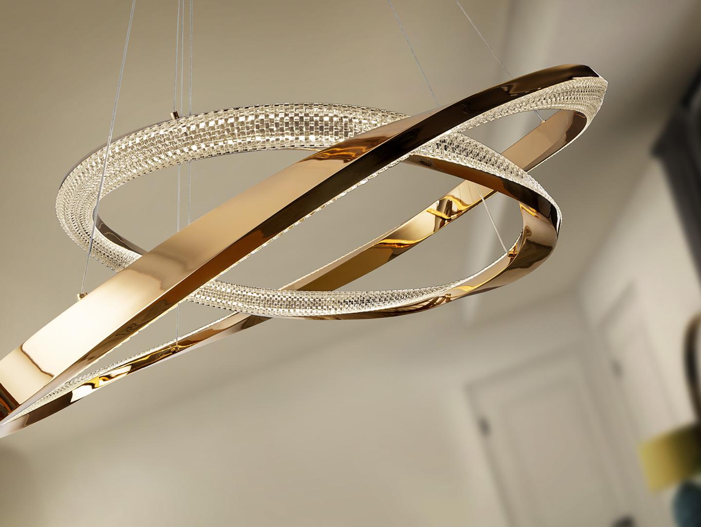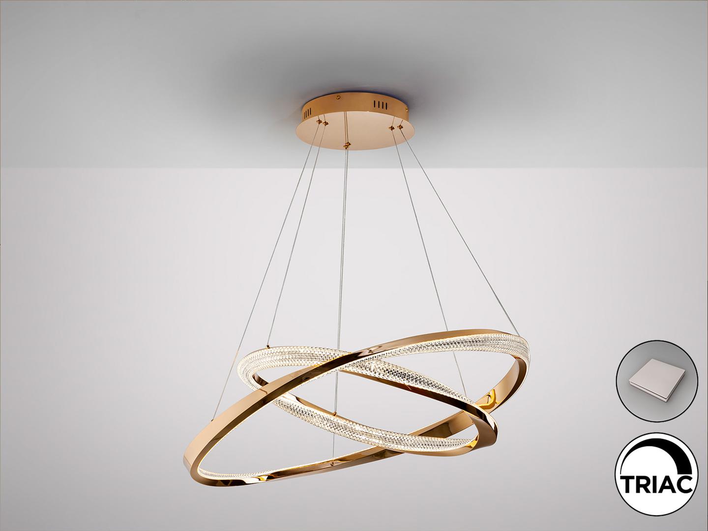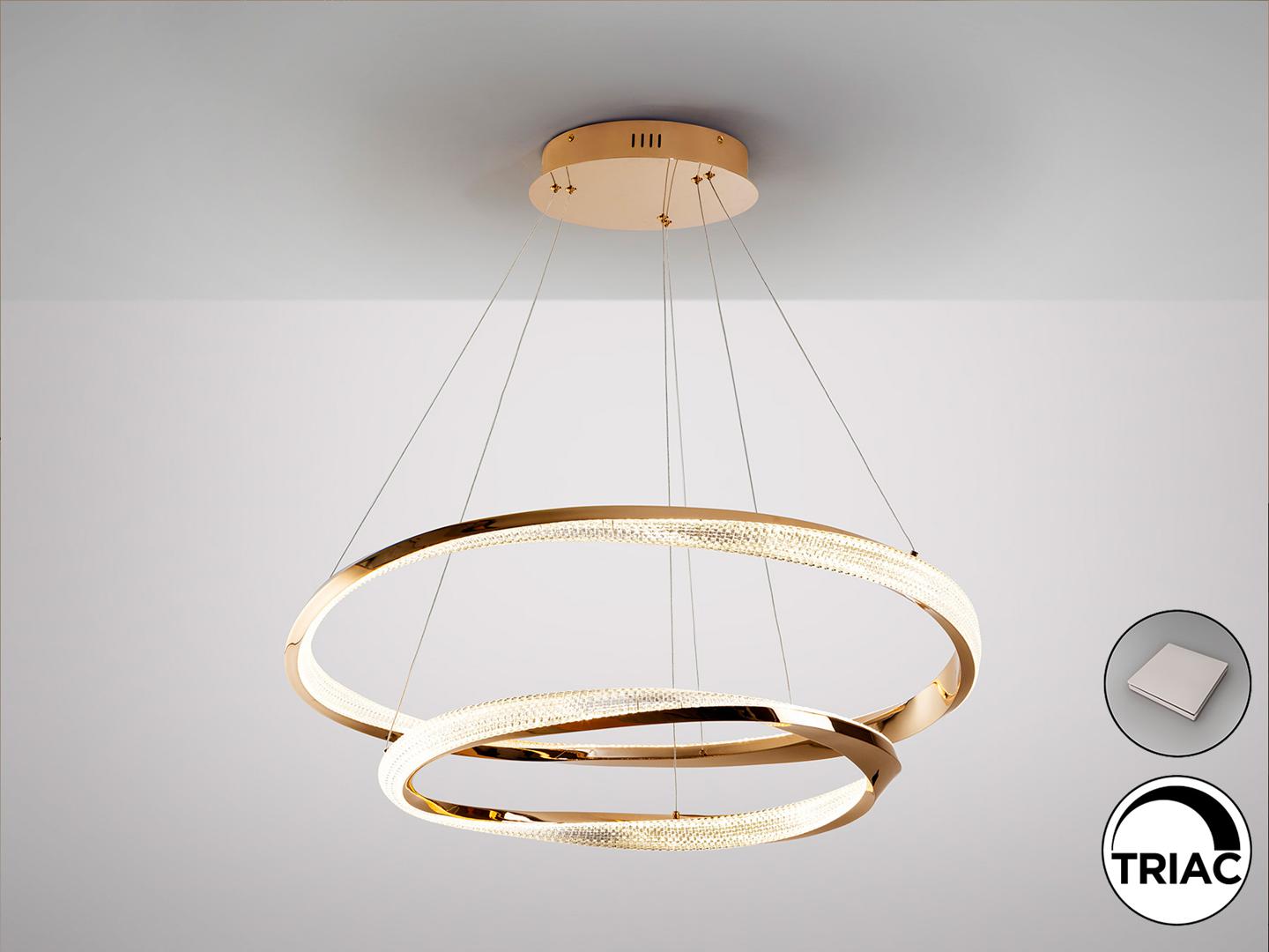 Лампа из 2 колец (Ø60 и Ø80 см), изготовленных из стали и алюминия, с блестящим золотым покрытием. Прозрачный гранёный акриловый рассеиватель. Регулируется по высоте. Светодиод мощностью 68 Вт, 4700 лм, 3000 К. С возможностью регулировки яркости. В комплект входит драйвер TRIAC и набор для регулировки яркости.
