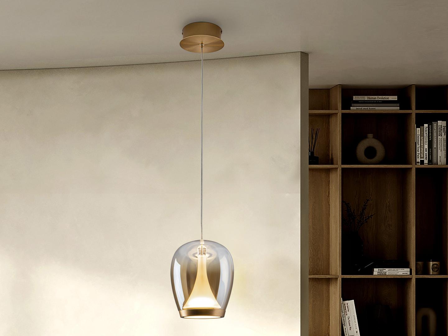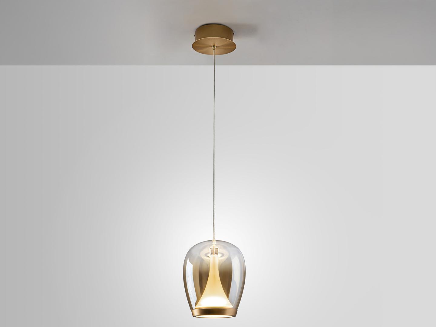Лампа из анодированного золотистого алюминия с абажуром из выдувного стекла с градиентной янтарной отделкой и опаловым внутренним рассеивателем. Регулируется по высоте. Светодиод мощностью 8,5 Вт, 900 лм, 3000 К. · В комплект поставки этой лампы входят ГРАВИТАЦИОННЫЕ ЗАЖИМЫ для более надёжной фиксации на потолке.